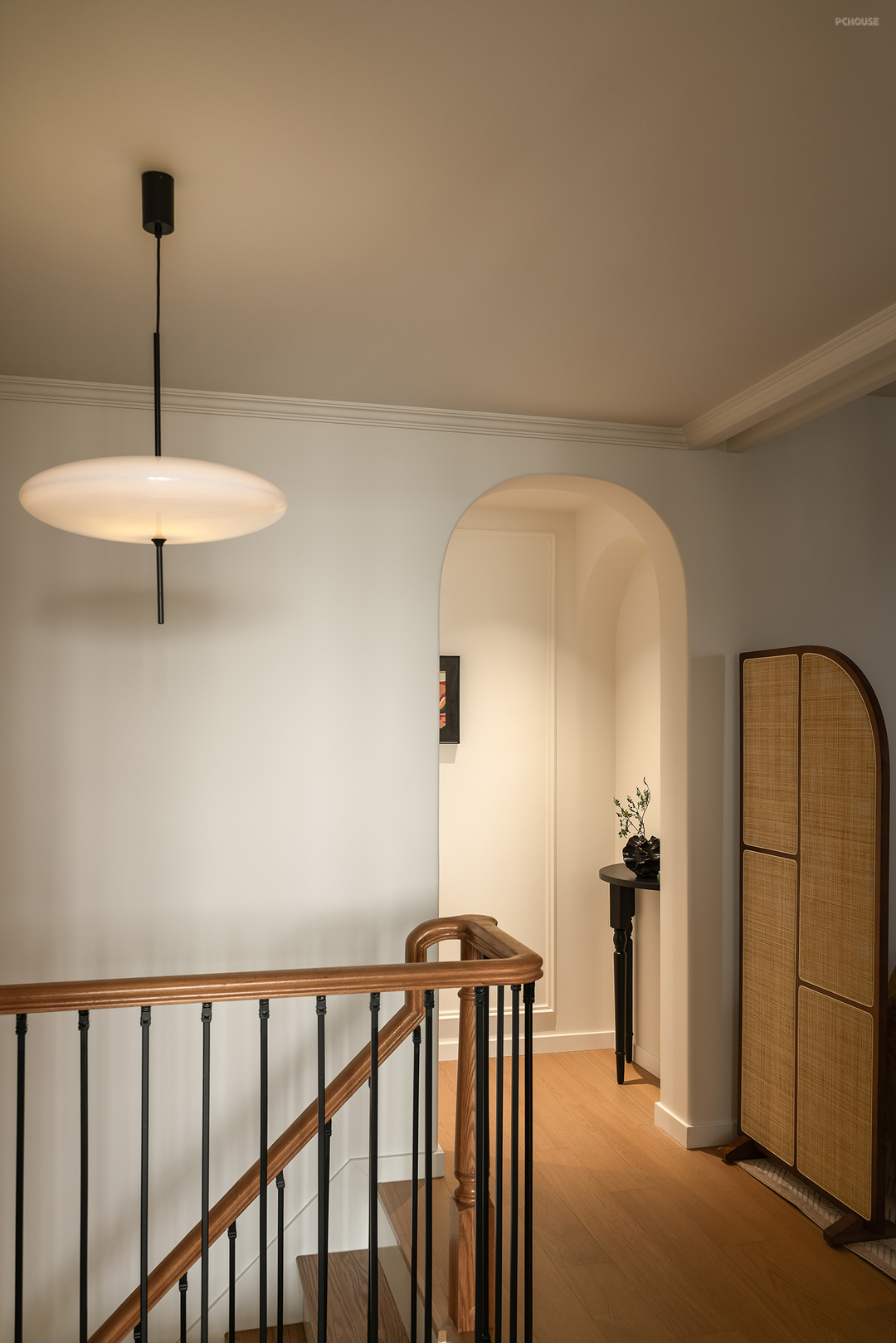 二楼楼梯上楼,多功能影音厅和阳光房过道采用拱形门洞,起到很好的过渡作用,延伸视觉感,增加艺术氛围。楼梯一侧精致的吊灯营造优雅浪漫的氛围,使得空间更灵动。