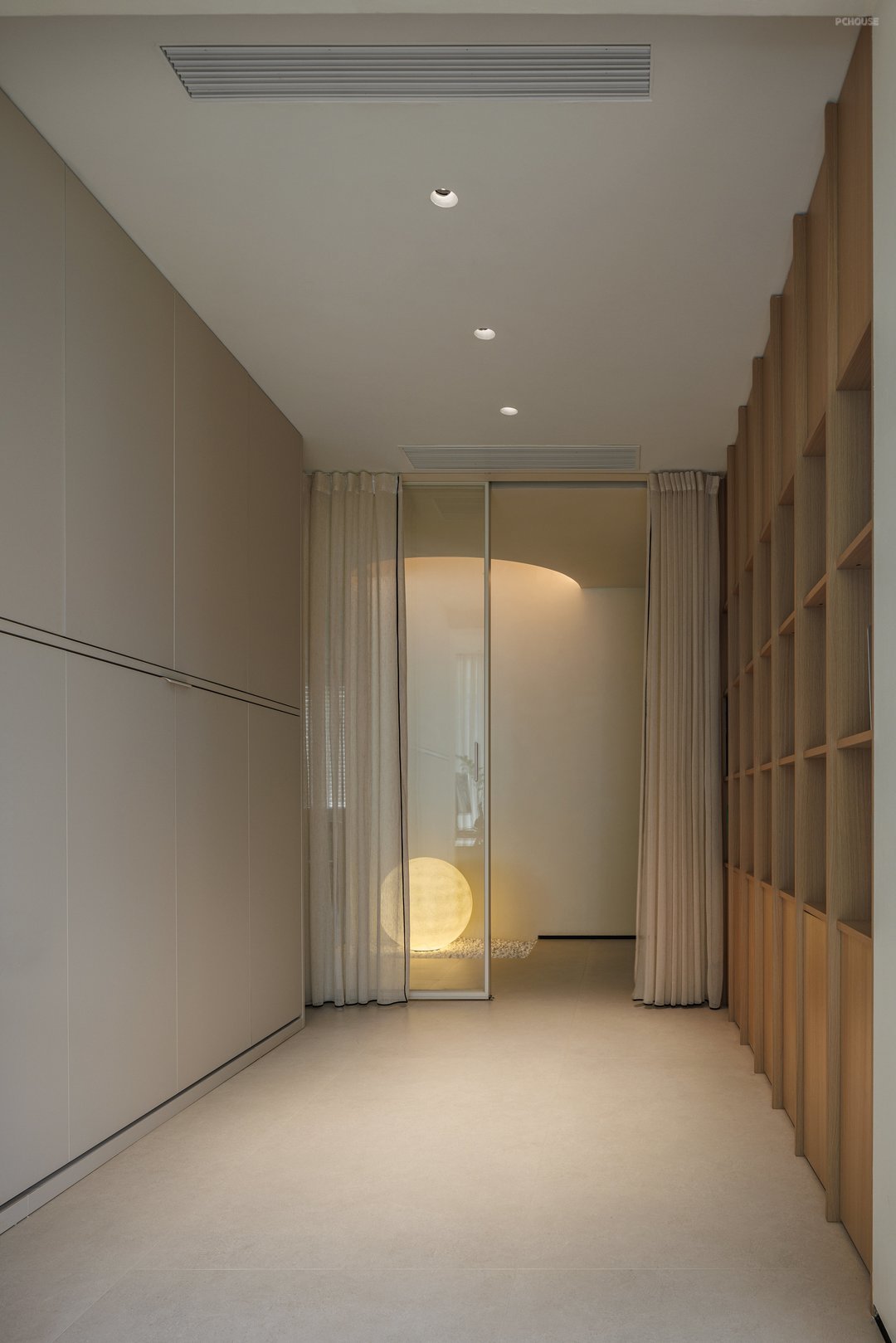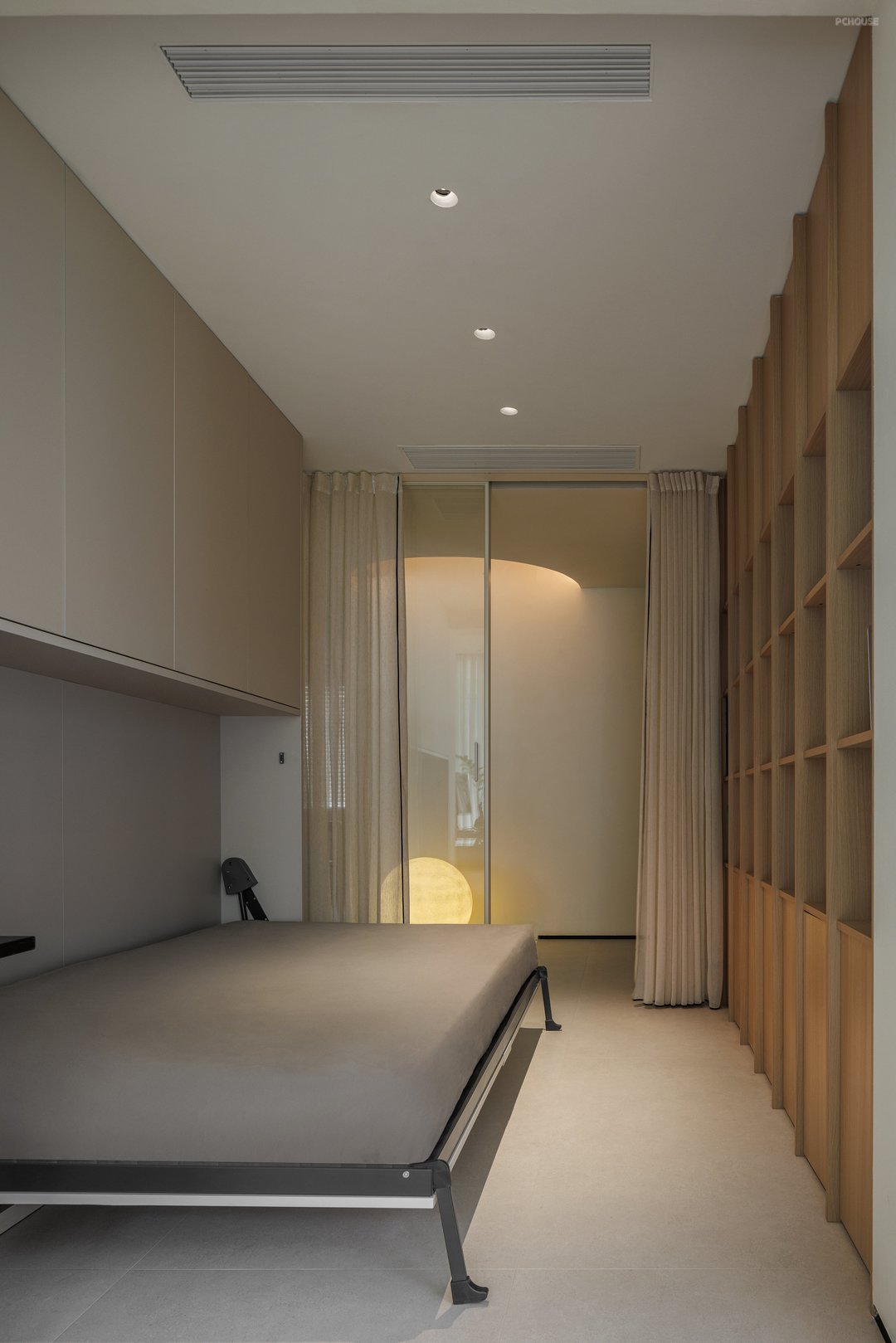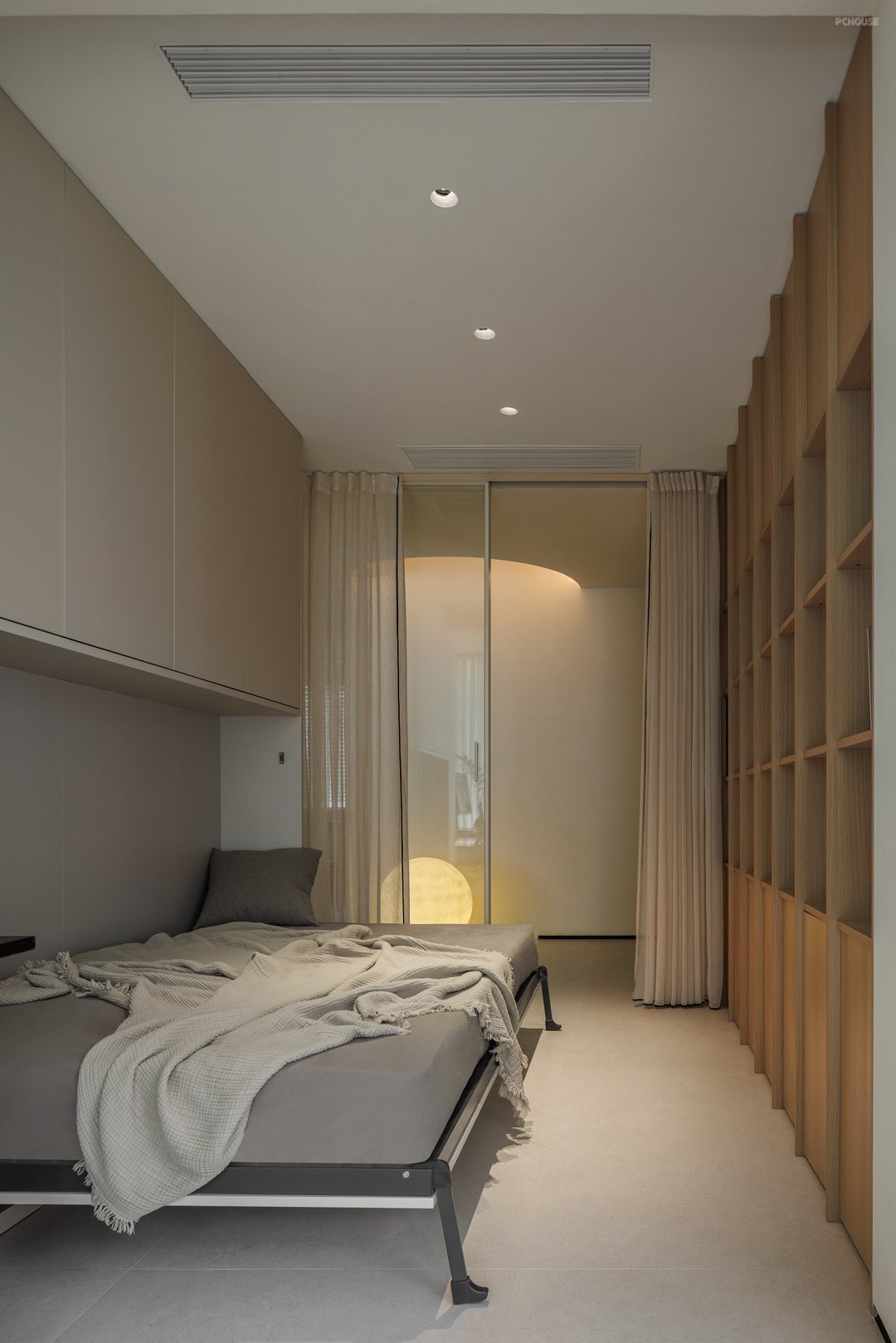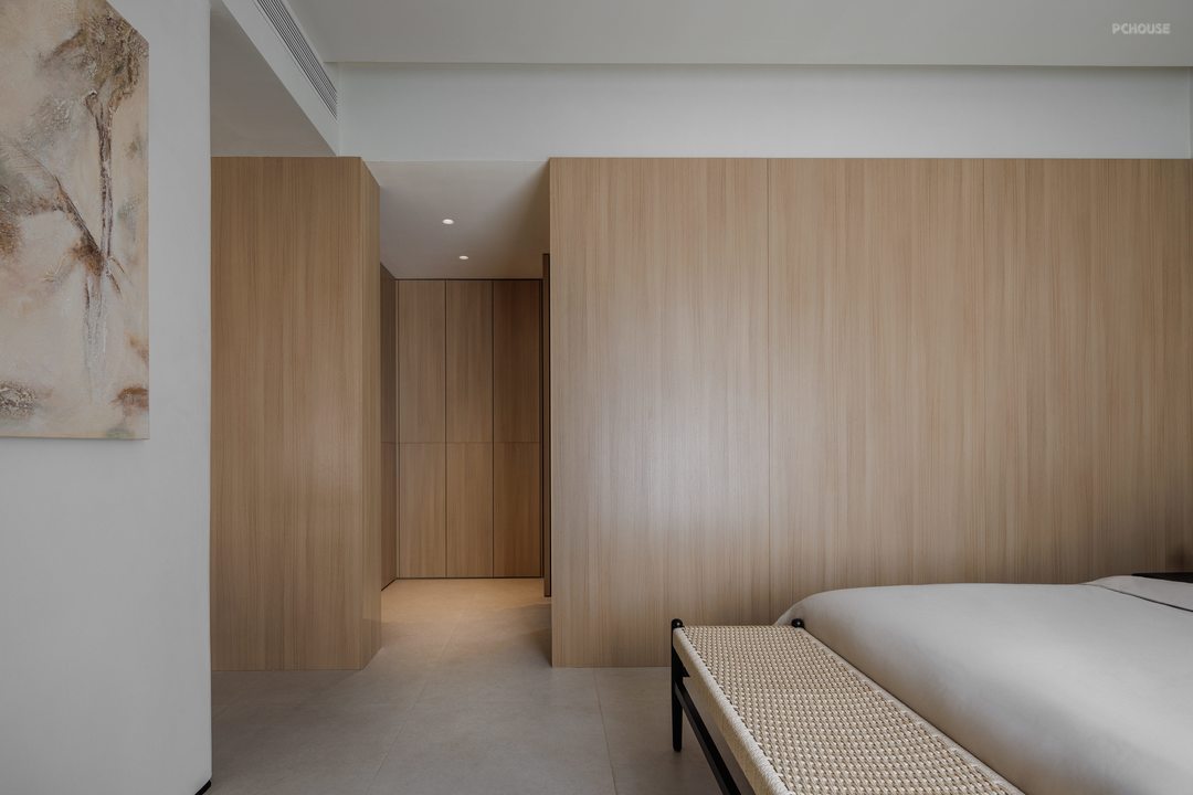 主卧通过空间渗透、功能叠加、光线管理三大策略,实现了居住、办公、储物、卫浴四大核心功能的高效整合;采用无主灯设计,搭配壁灯,节省空间且光线柔和,让空间利用实现最大化,空间布局紧凑,通过材质过渡与线条划分实现休息区与过道的流畅衔接,更通过屏风、衣帽间等过渡空间的运用,将私密性与开放性完美平衡,成为全屋“自然美术馆”主题下的静谧核心区。