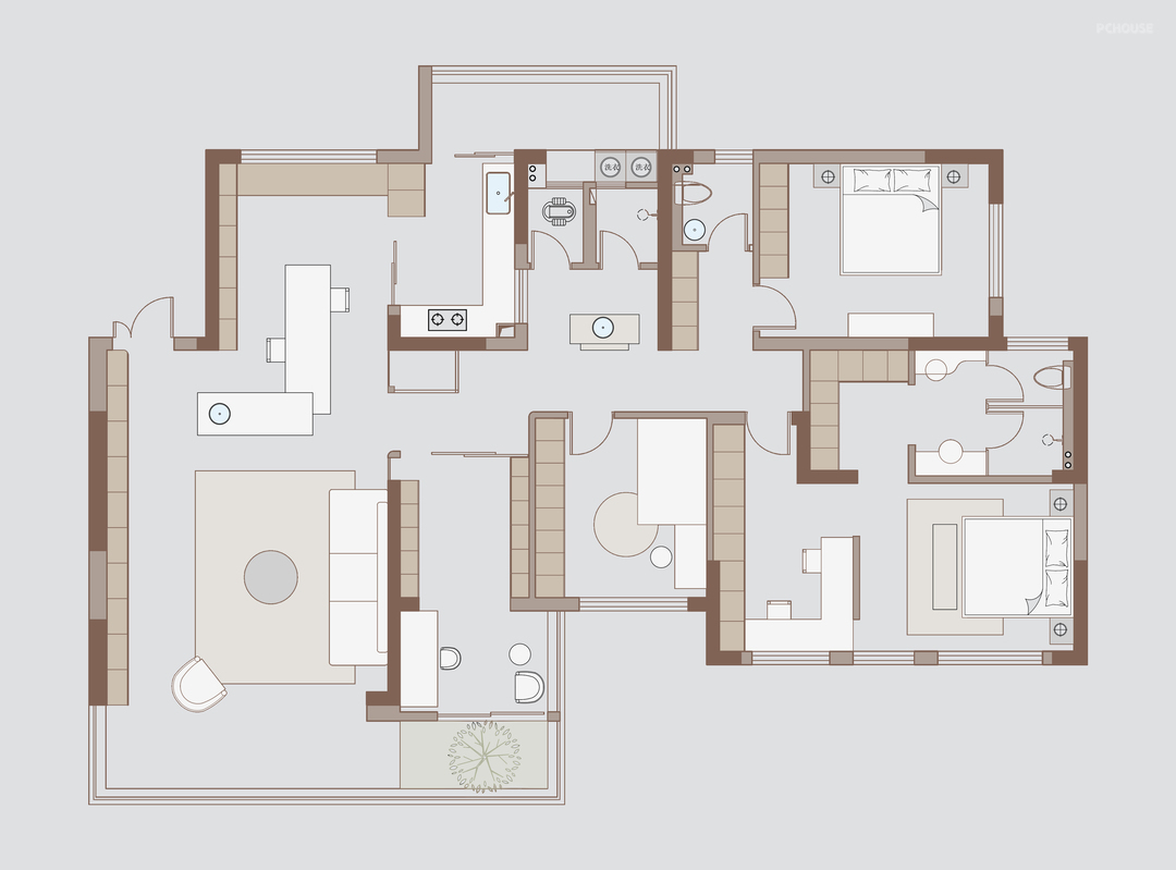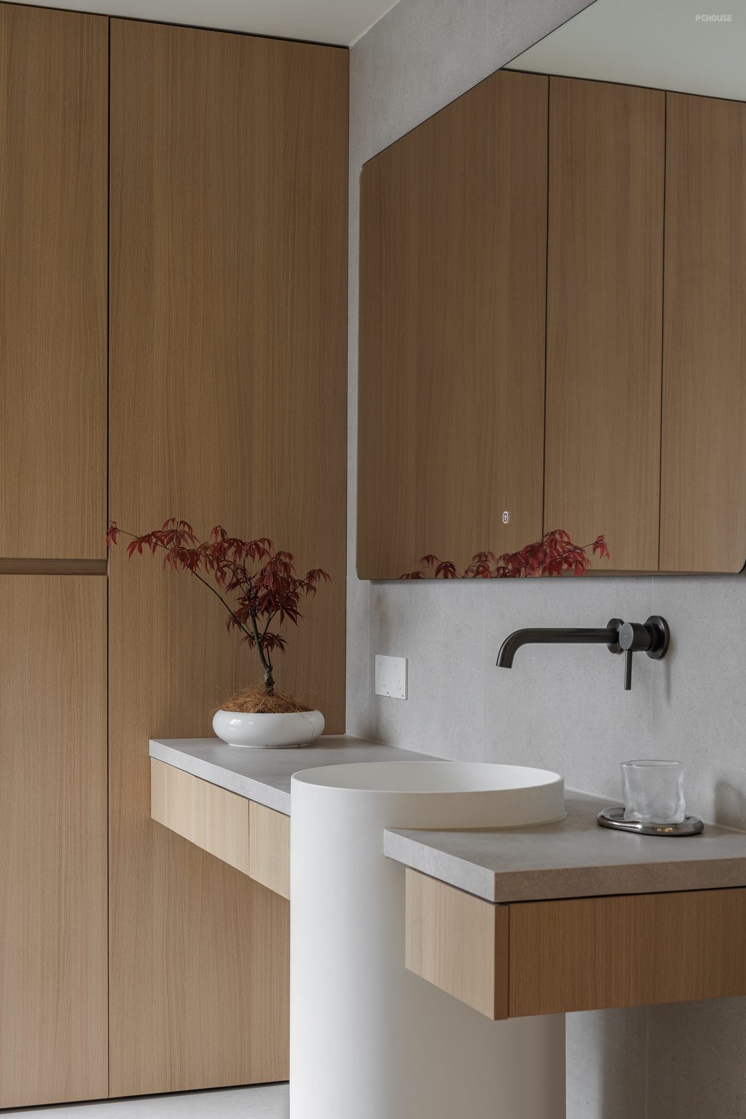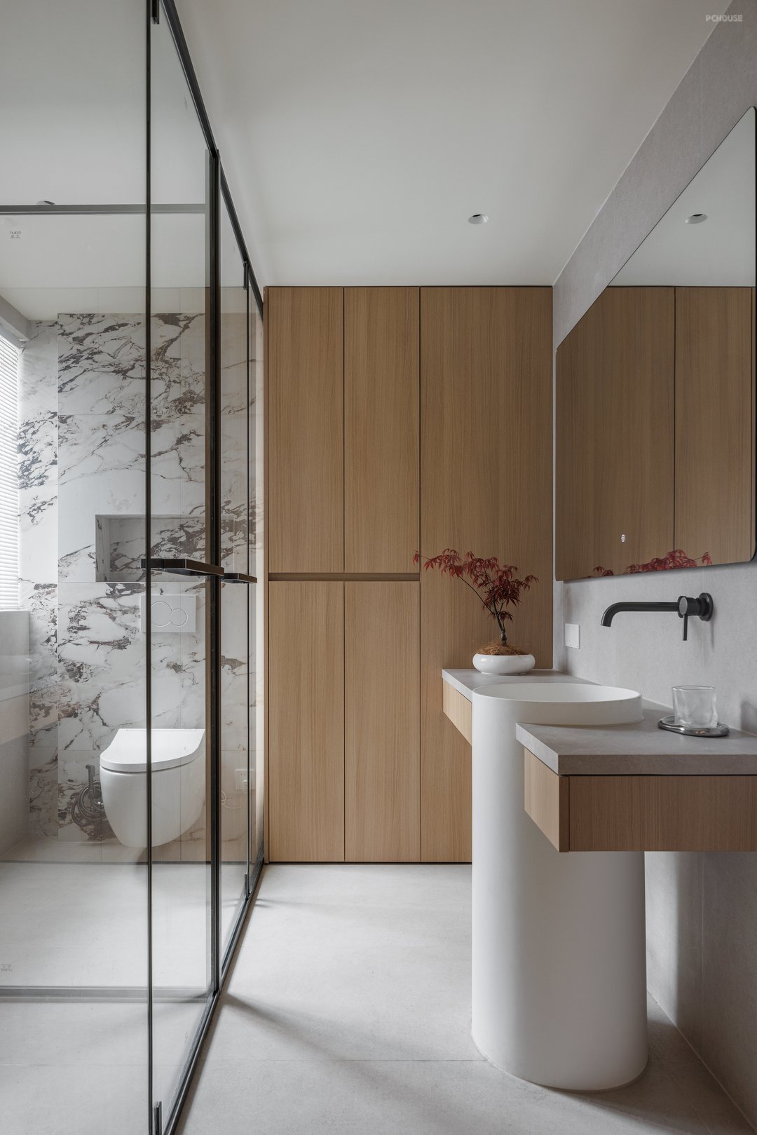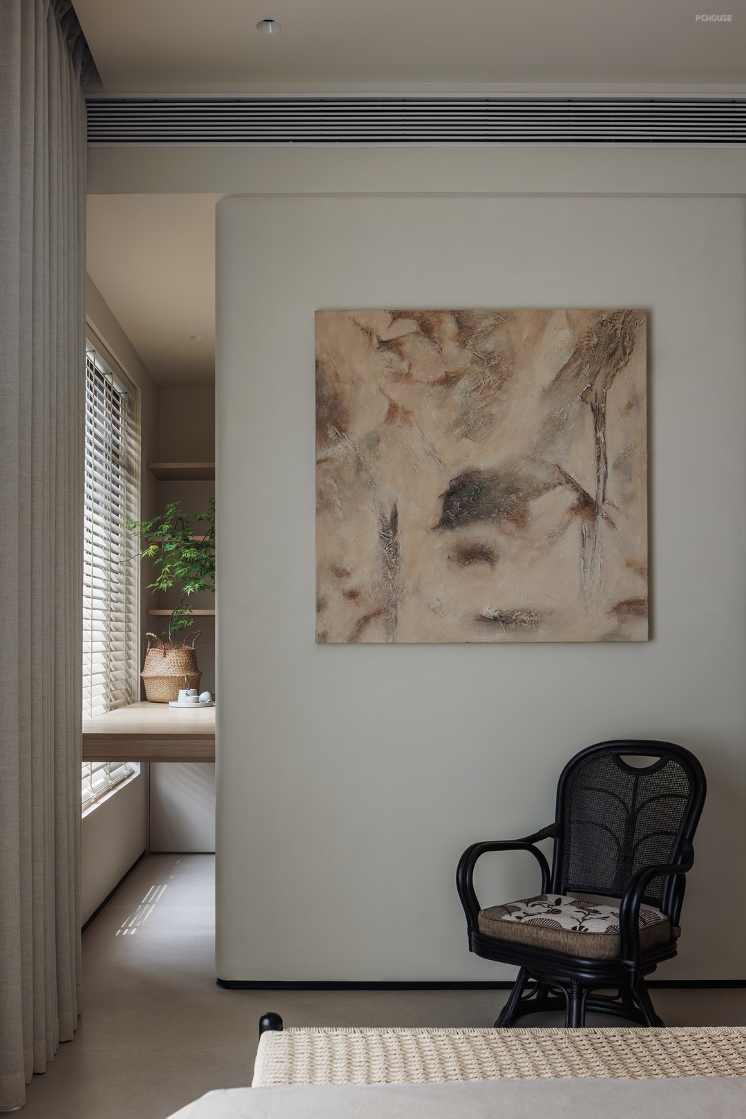 主卧通过空间渗透、功能叠加、光线管理三大策略,实现了居住、办公、储物、卫浴四大核心功能的高效整合;采用无主灯设计,搭配壁灯,节省空间且光线柔和,让空间利用实现最大化,空间布局紧凑,通过材质过渡与线条划分实现休息区与过道的流畅衔接,更通过屏风、衣帽间等过渡空间的运用,将私密性与开放性完美平衡,成为全屋“自然美术馆”主题下的静谧核心区。