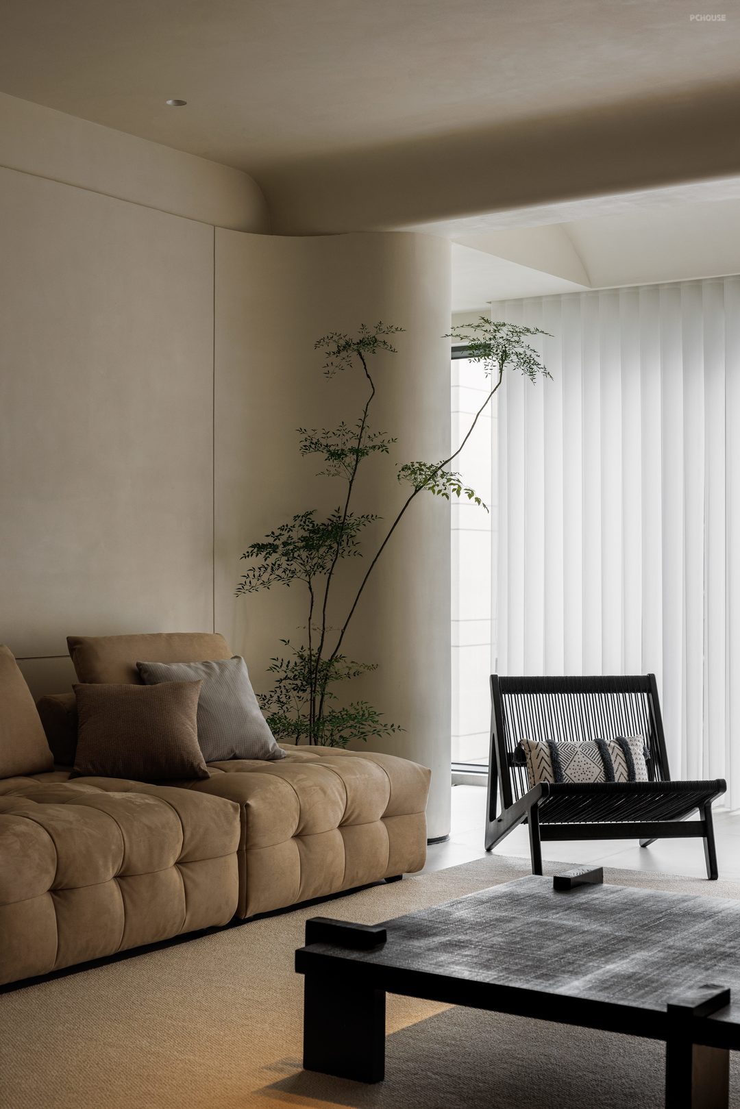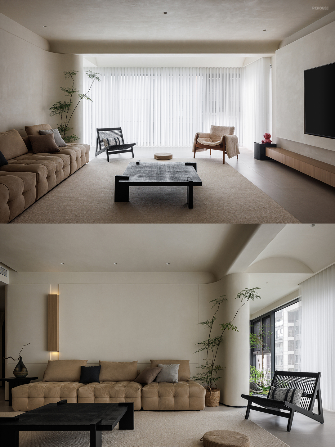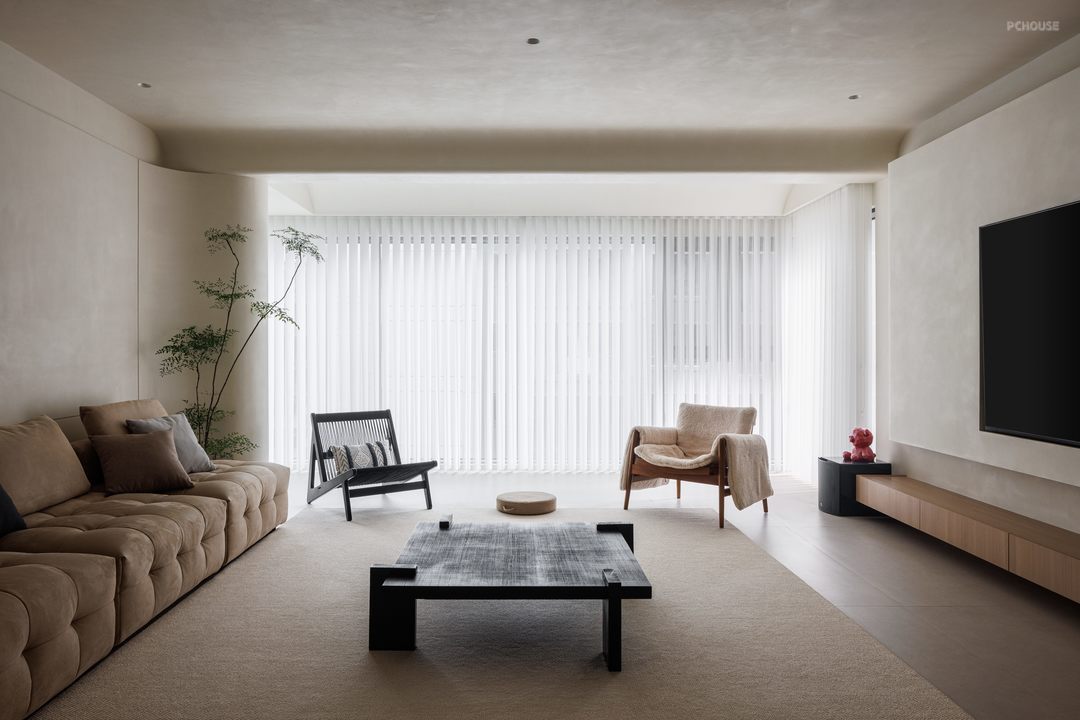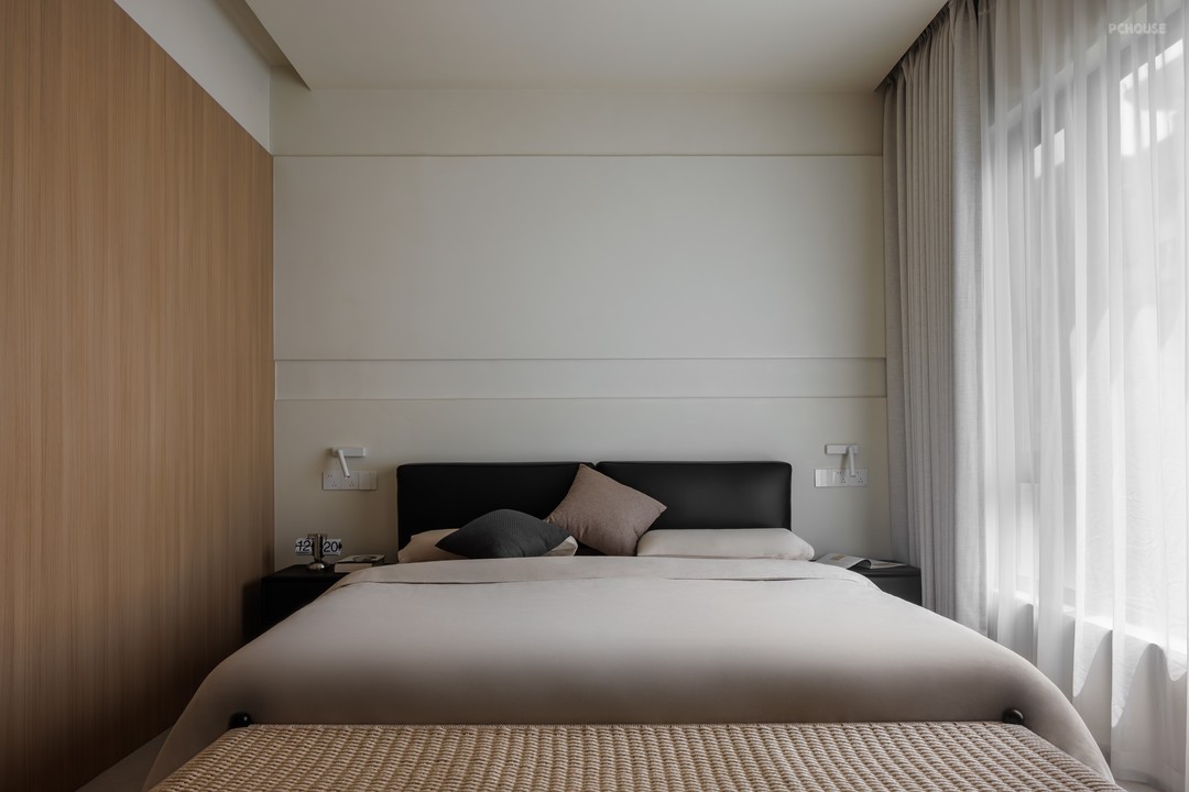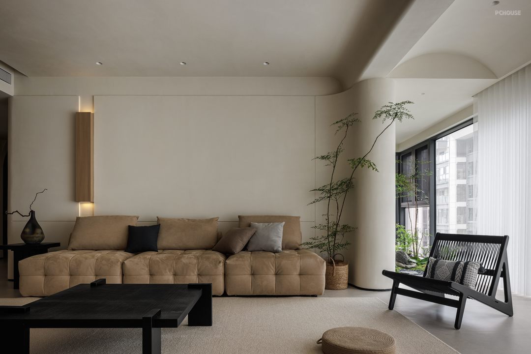 整体采用原木极简的风格,以米色、黑色和木色为主色调,搭配协调,营造出温馨、宁静且有质感的空间氛围,顶面弧形造型与墙面弧度形成韵律,柔和了空间线条,配合隐藏式照明消解空间压迫感;窗户搭配轻薄的白色窗帘,既能保证充足的自然光线进入,又能营造柔和的氛围。