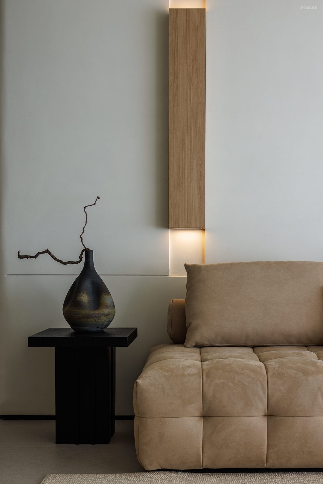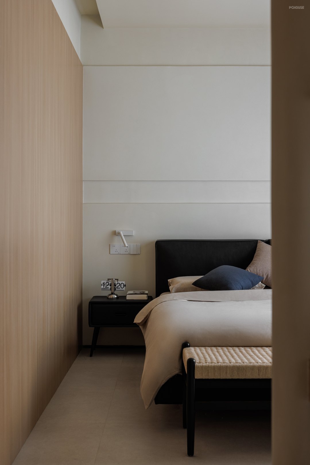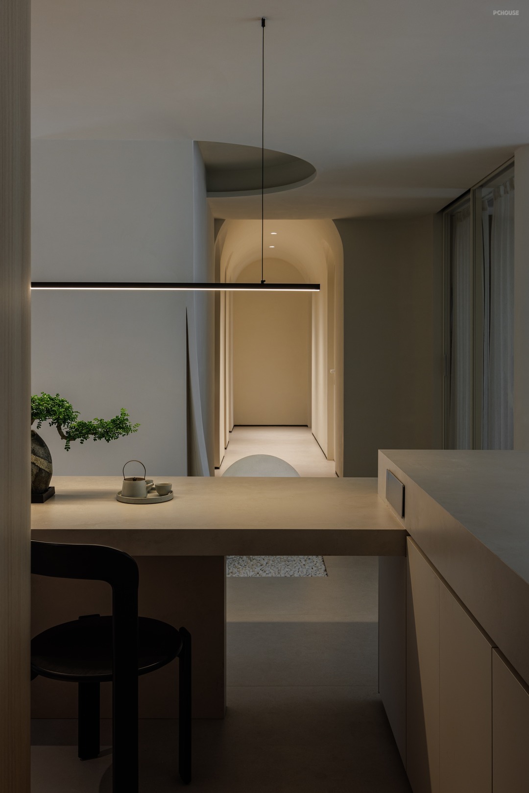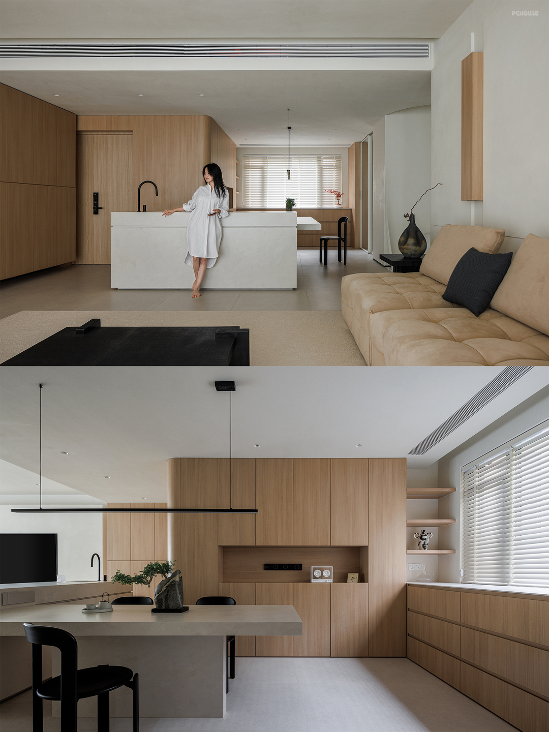整体采用原木极简的风格,以米色、黑色和木色为主色调,搭配协调,营造出温馨、宁静且有质感的空间氛围,顶面弧形造型与墙面弧度形成韵律,柔和了空间线条,配合隐藏式照明消解空间压迫感;窗户搭配轻薄的白色窗帘,既能保证充足的自然光线进入,又能营造柔和的氛围。