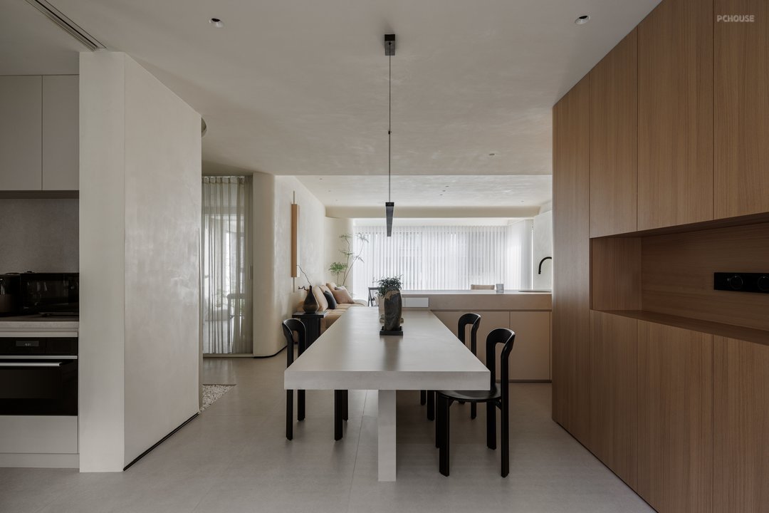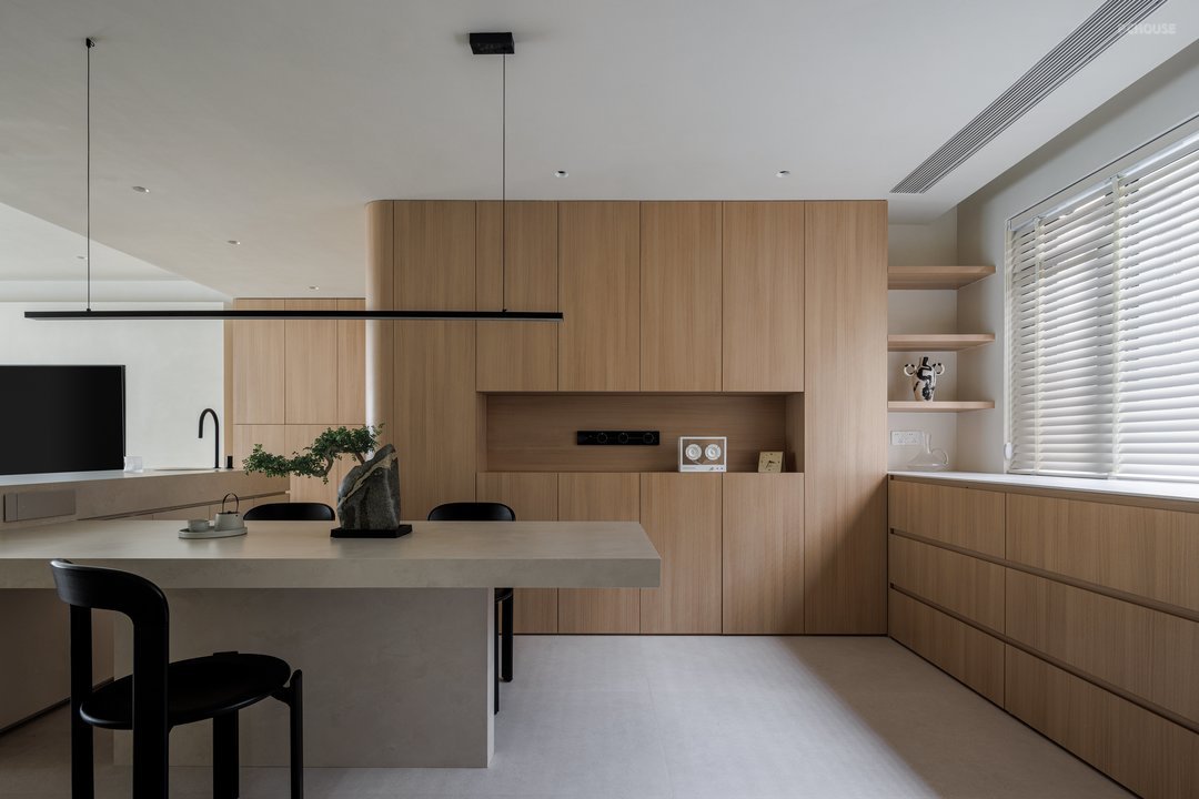 餐厅与客厅、厨房区域相连,形成开放式空间,把餐桌和岛台做了一个L形的设计,不仅优化了空间动线,还通过视觉延伸增强了空间的互动性和通透感,方便日常生活和家人朋友交流;岛台集成的洗手台与收纳系统,实现功能与美学的双重提升。
