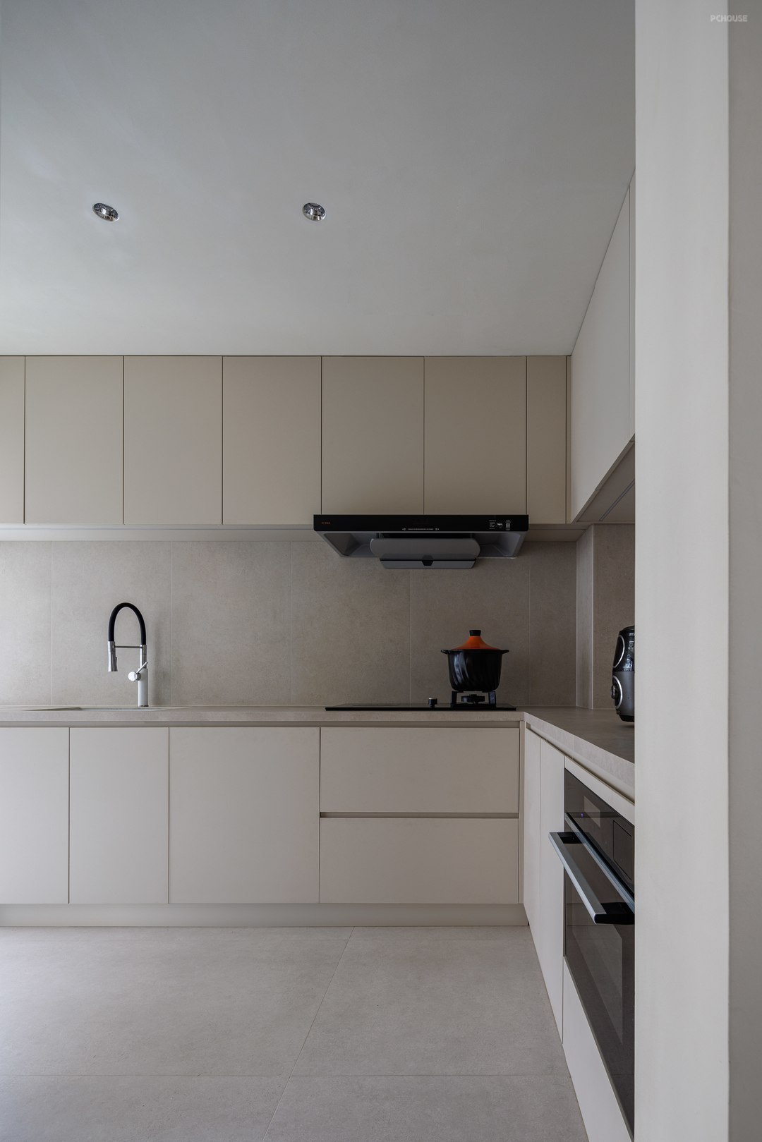 厨房采用浅米色和木色搭配,色调柔和,无过多复杂装饰,简洁大方。设置了大量的嵌入式橱柜,增加了储物空间,使厨房用品收纳整齐,节省空间让厨房更加整洁;厨房接通生活阳台,引入自然光线,也能有效排除烹饪时产生的油烟,保持空气清新。