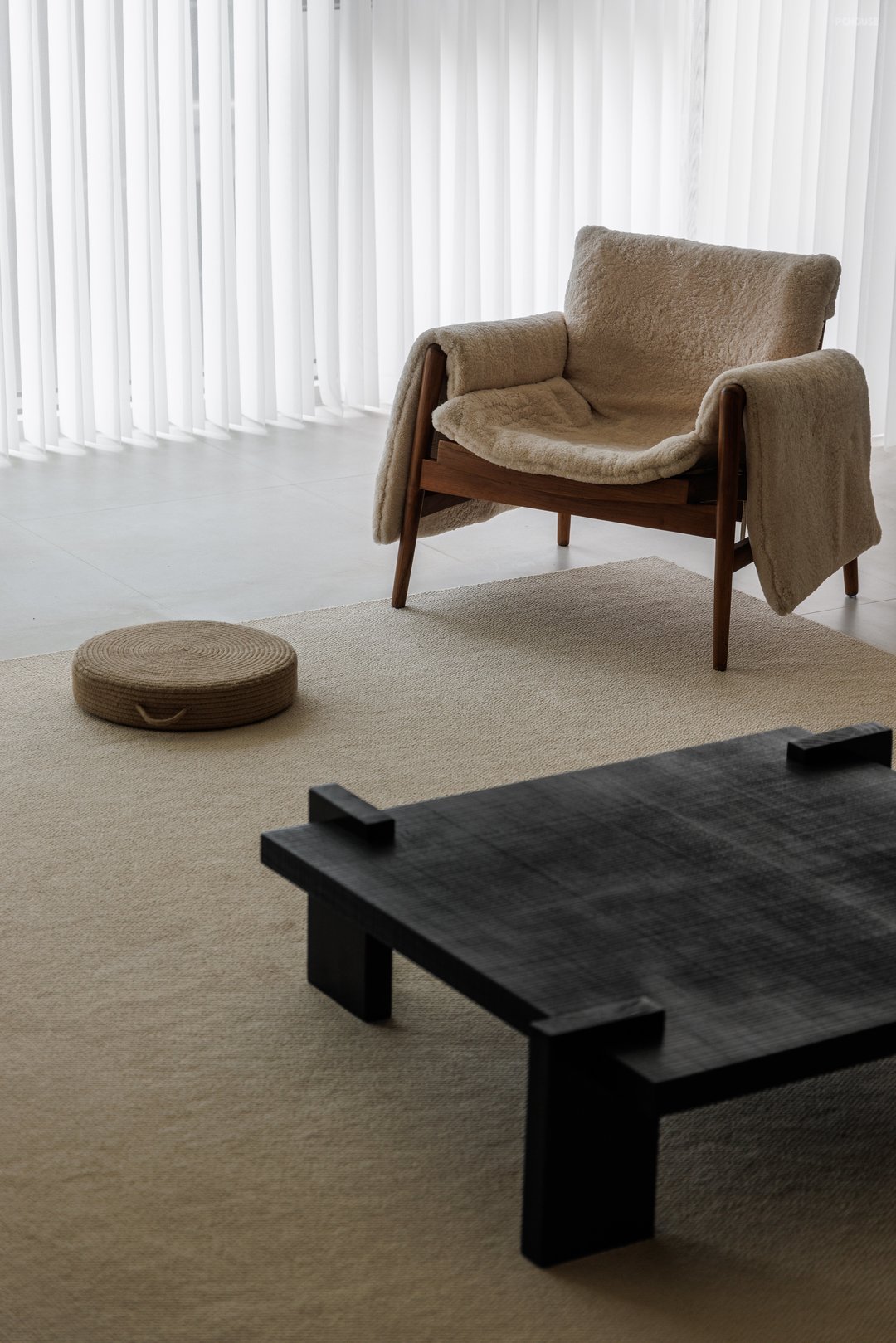 深色木质茶几、有设计感的家具线条,以及材质的细腻表现,凸显出空间的精致与高级感,绿植的点缀为空间增添生机与自然气息,搭配柔软的沙发、毛绒质感的座椅,从视觉和触觉上都传递出舒适之感。