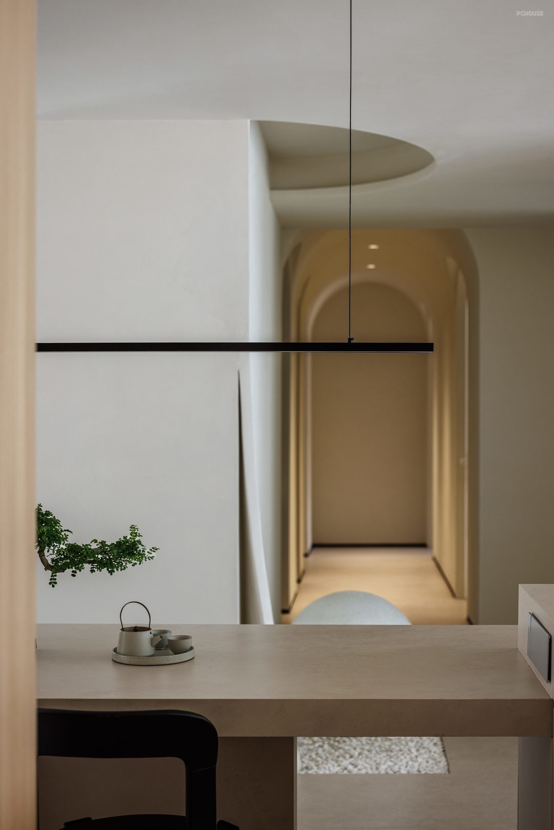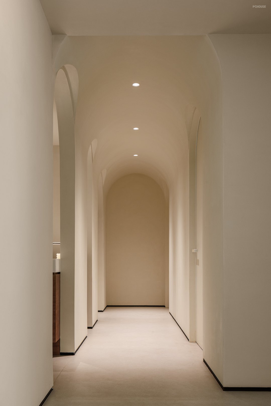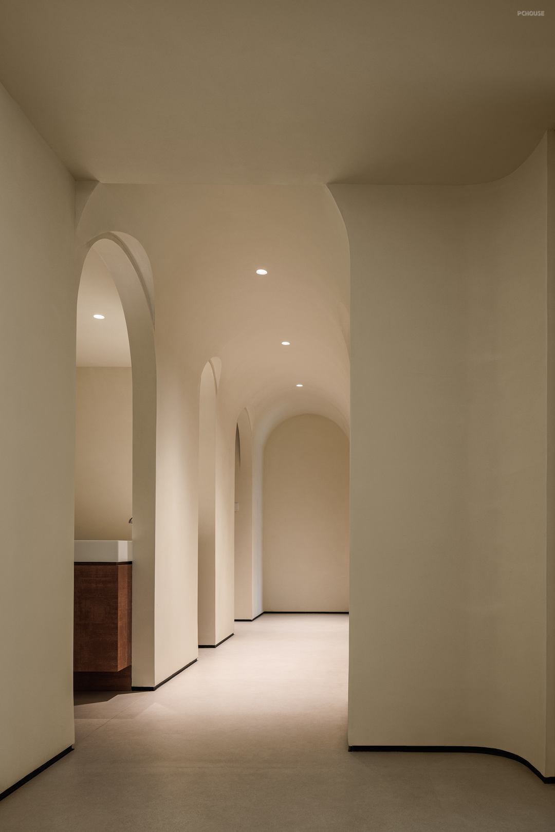 3.美学平衡:在户主偏好的极简基础中注入艺术元素,如书页造型的装饰墙、拱形走廊设计既保持空间整体性又避免单调。