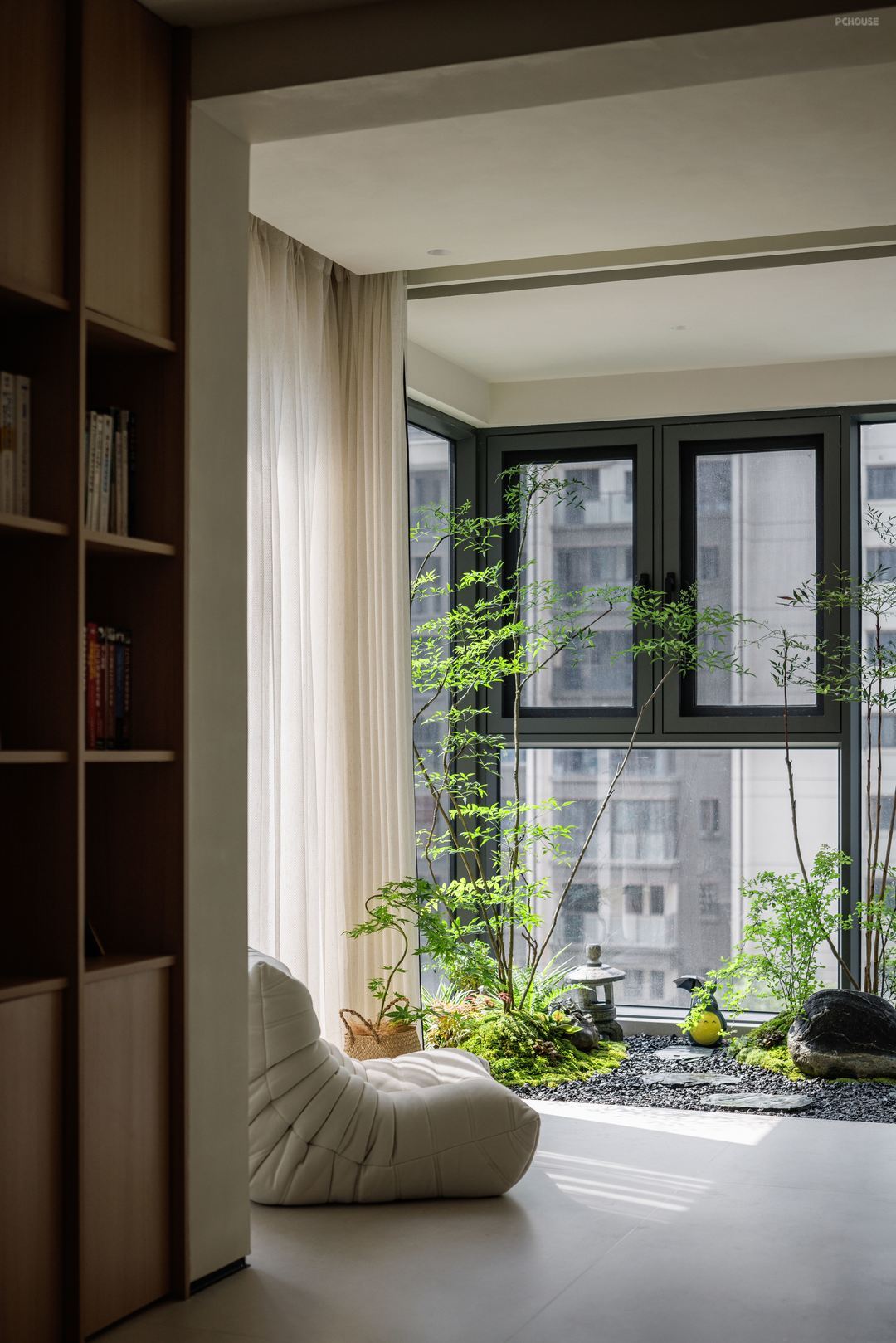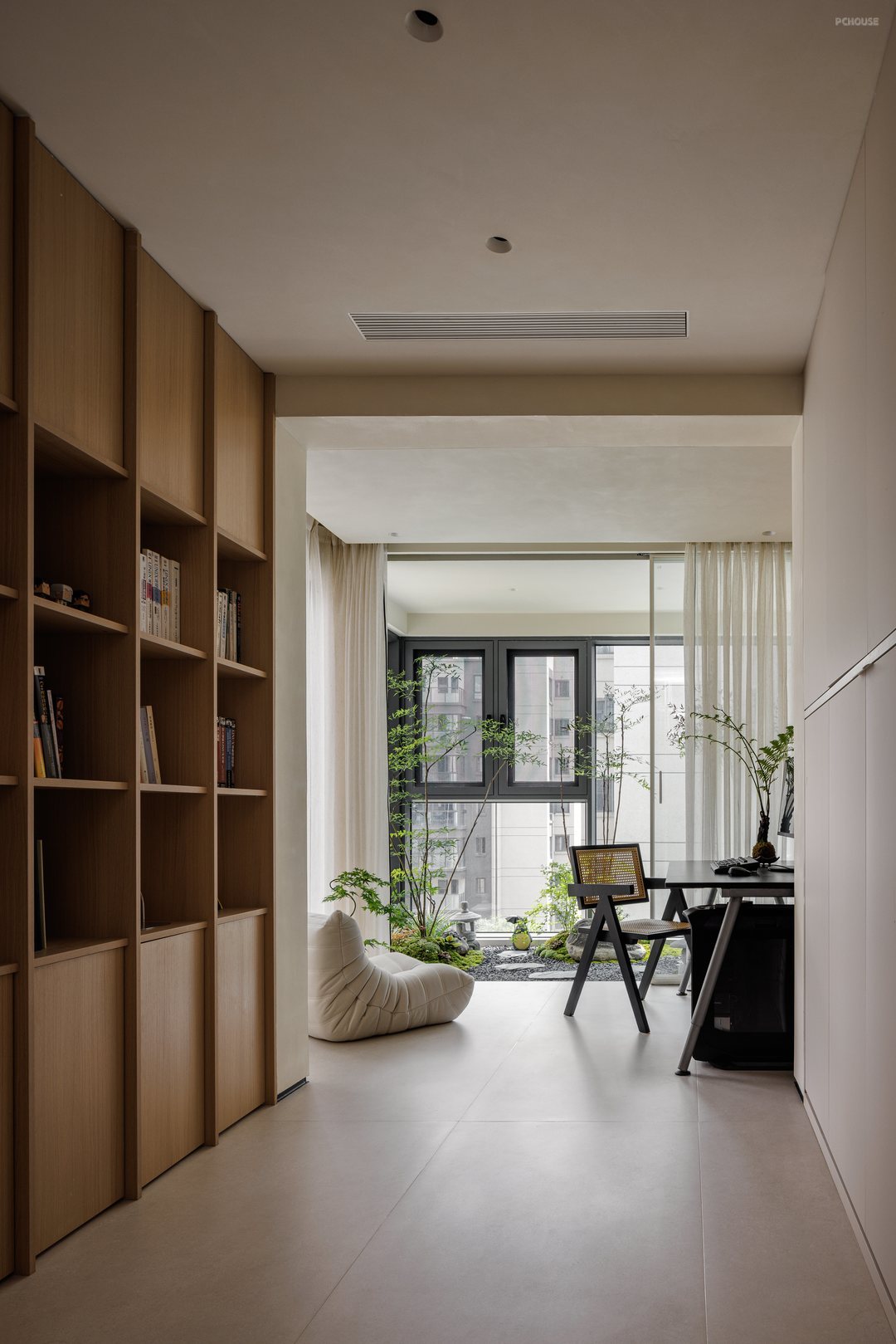 书房通过空间重构、功能复合与生态美学的融合,形成“客厅-绿植区-书房”的复合空间序列,将阳台纳入书房,连接客厅,消除了空间隔阂,增强互动性;开放设计促进祖孙互动,满足居家办公、阅读、亲子互动等多元化需求,强化家庭情感联结;室内花园采用绿植与自然造景结合,既满足采光需求又降低养护成本,创造可呼吸的室内环境;而且书房通过可移动屏风与客厅连通,可快速转换为临时客房,满足偶尔访客需求。