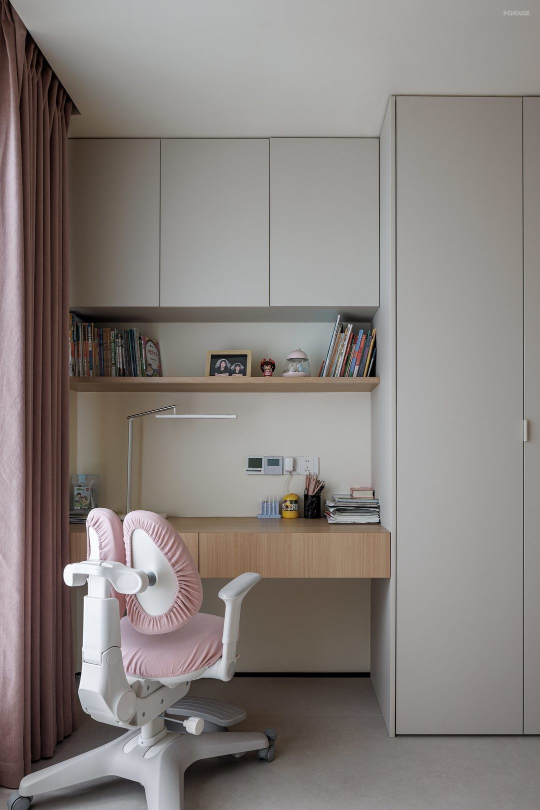 儿童房位于主卧与书房之间,形成亲子互动三角区,既便于父母随时照看,又能共享书房的学习氛围,紧邻公区却保持独立,符合儿童对安全感与探索欲的双重需求;通过“去走廊化”实现“睡眠区+储物区”的高效布局,模块化家具的选择,可随成长需求调整功能分区,延长空间使用周期。