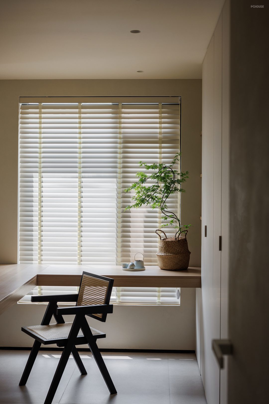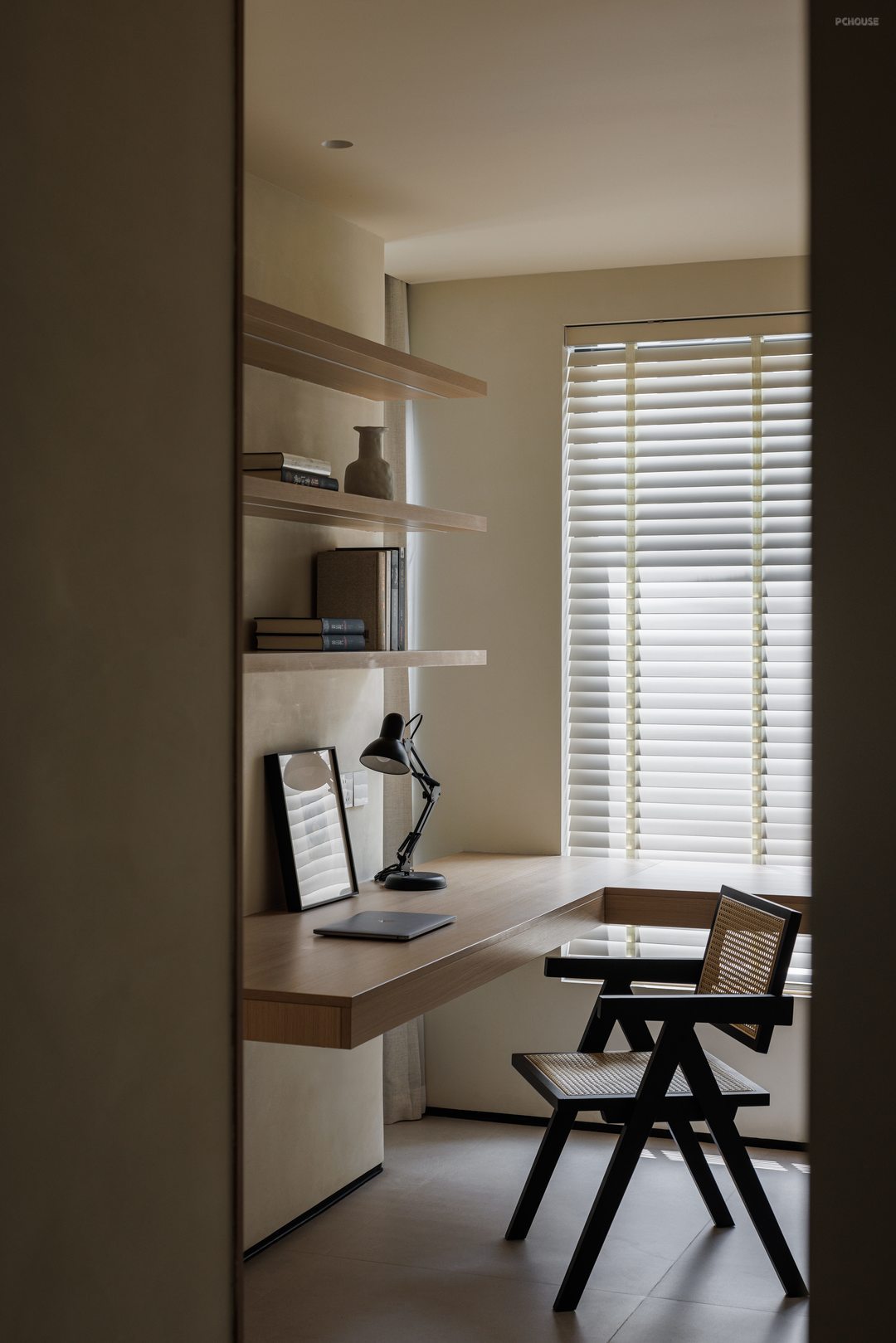 室内书房将衣柜与书房结合,实现储物与办公的一体化设计,利用屏风式墙体划分区域有效阻隔办公区与就寝区的视线干扰,保障业主夜间加班时不影响伴侣休息;为业主量身定制,配备符合人体工学的书桌与储物吊柜,满足文件收纳、设备摆放等办公需求。