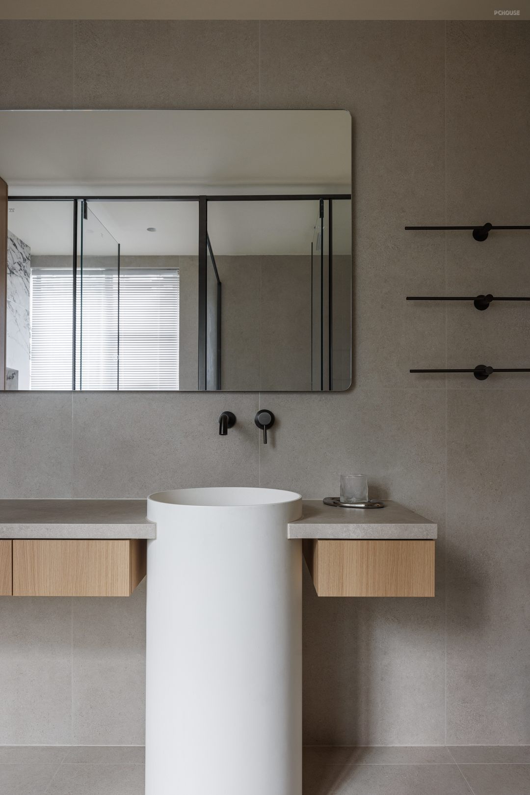 公共卫生间门洞采用弧形拱顶设计,与走廊顶面造型呼应,弧形线条柔化了空间棱角,配合隐藏式灯带营造温馨氛围,使卫生间成为空间艺术的一部分;外置洗面区拓宽走廊空间,实现多人同时使用,减少高峰期等待时间,划分洗面区、如厕区、淋浴区三部分,形成过渡空间+实用功能的复合设计,为家庭成员提供了安全、舒适、富有设计感的卫浴体验。