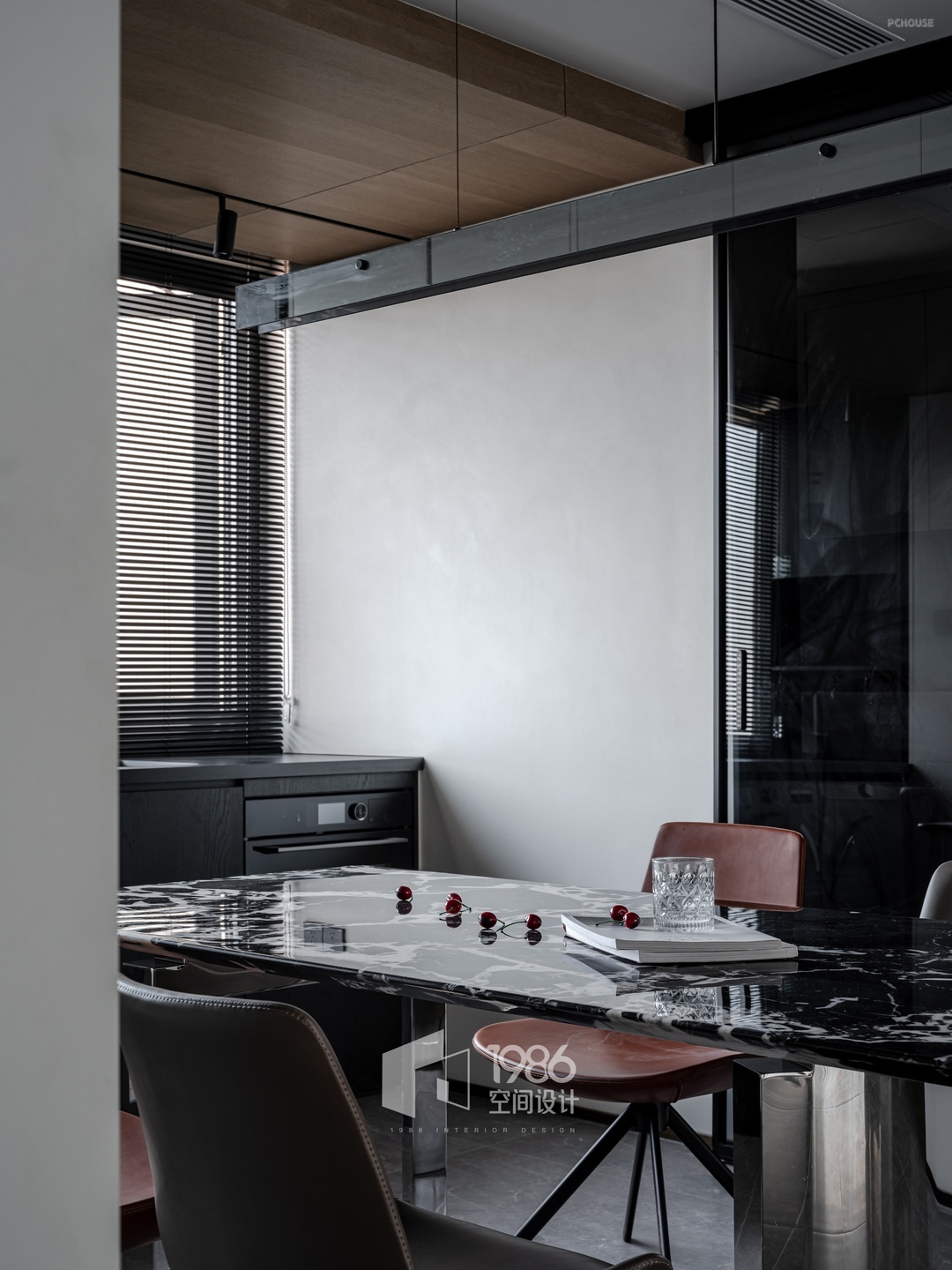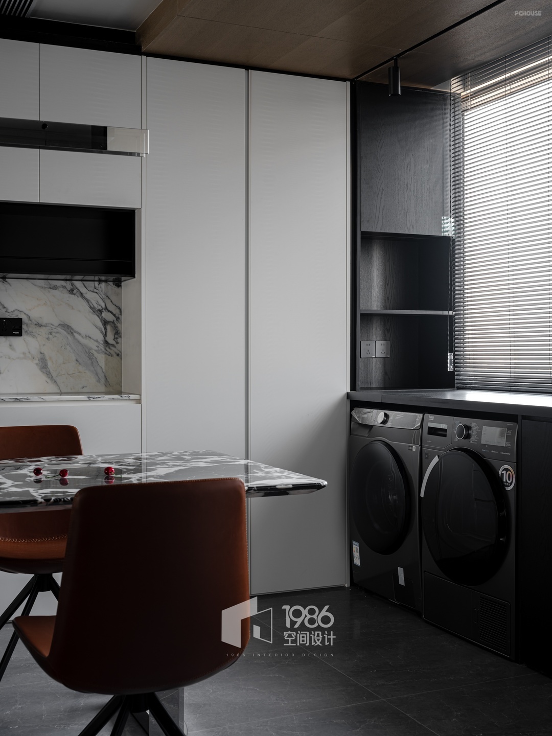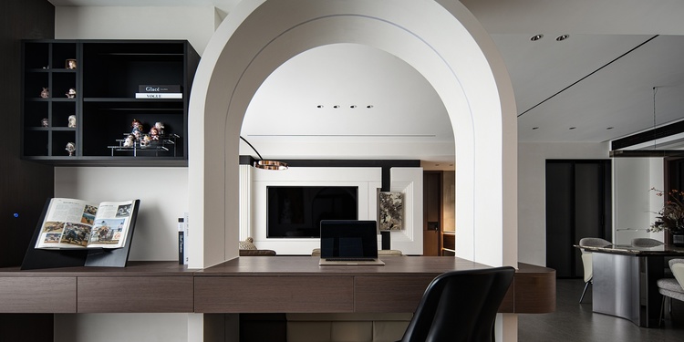 高效利用餐桌相邻飘窗位置增设西厨功能台,内置烤箱、台面放置咖啡机、小零食,且不影响餐桌区域的便利使用。右侧墙一体两用的超宽移门进可阻挡厨房油烟。