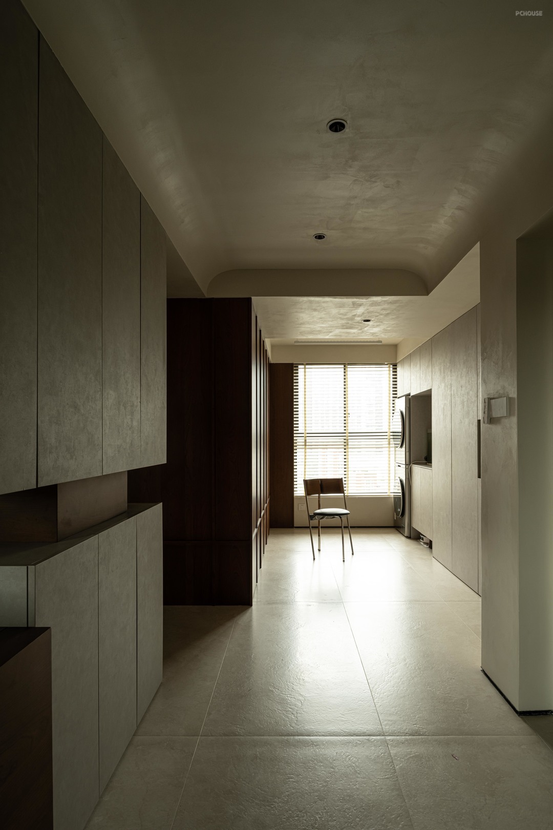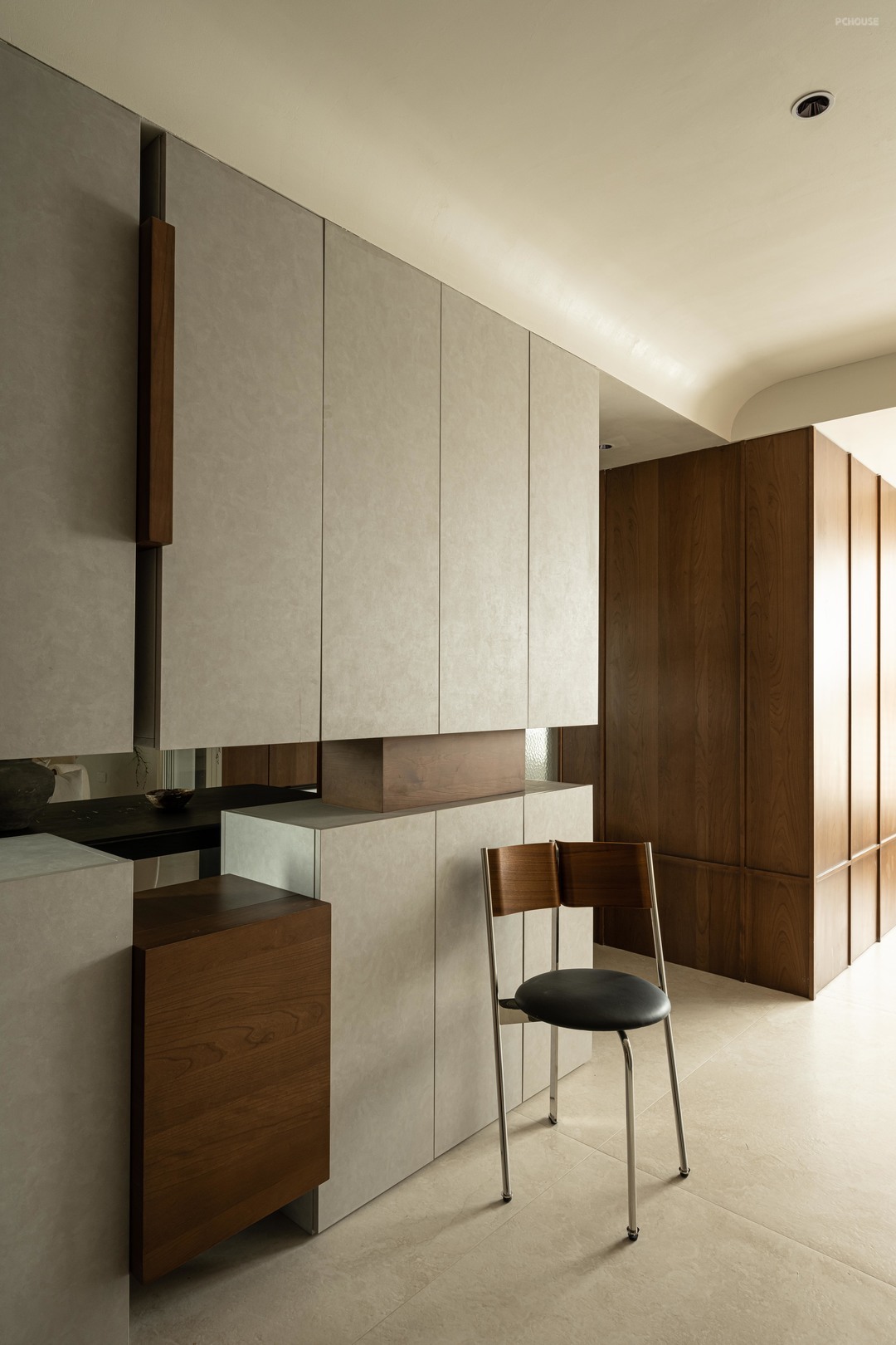 门厅界定入户过渡区,打造门厅+鞋柜+悬浮柜体,形成“收纳+美观”一体化设计,提升入户仪式感与实用性;玄关处将原卧室改为储藏间+生活阳台,让家政动线更集中,并且针对性解决家庭收纳痛点。