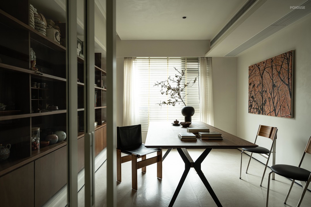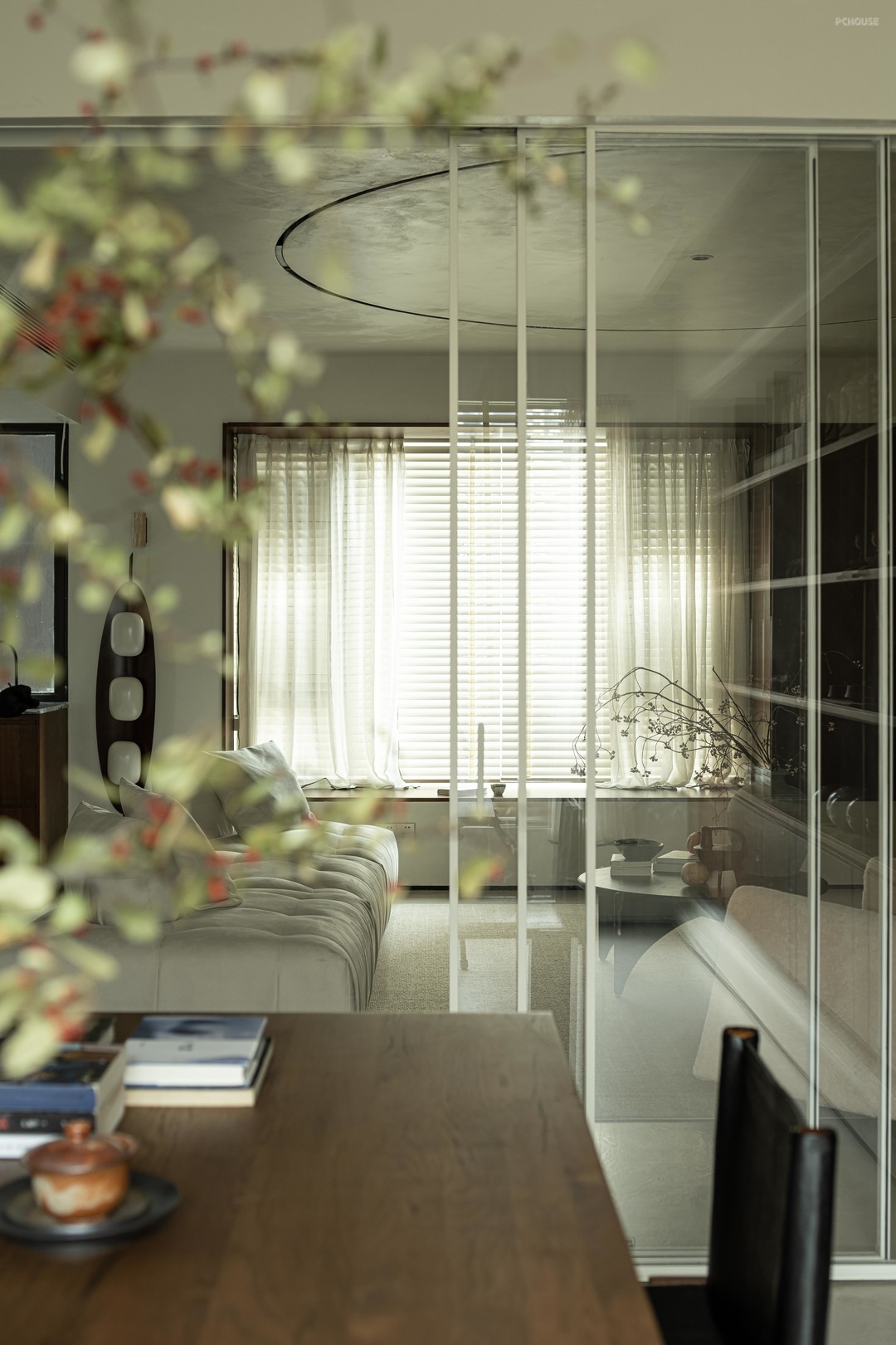 对业主来说,客餐厅是一家人最重要的交流地,开放布局让客厅、餐厅、书房形成连贯动线,玻璃推拉门模糊与客餐厅边界,增强客厅与其他区域的视觉联动,既满足家人互动需求,也让空间更显开阔,呼应“家庭核心交流地”的定位,强化家庭情感联结;