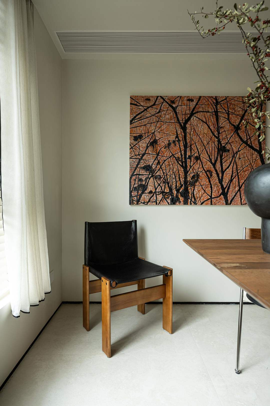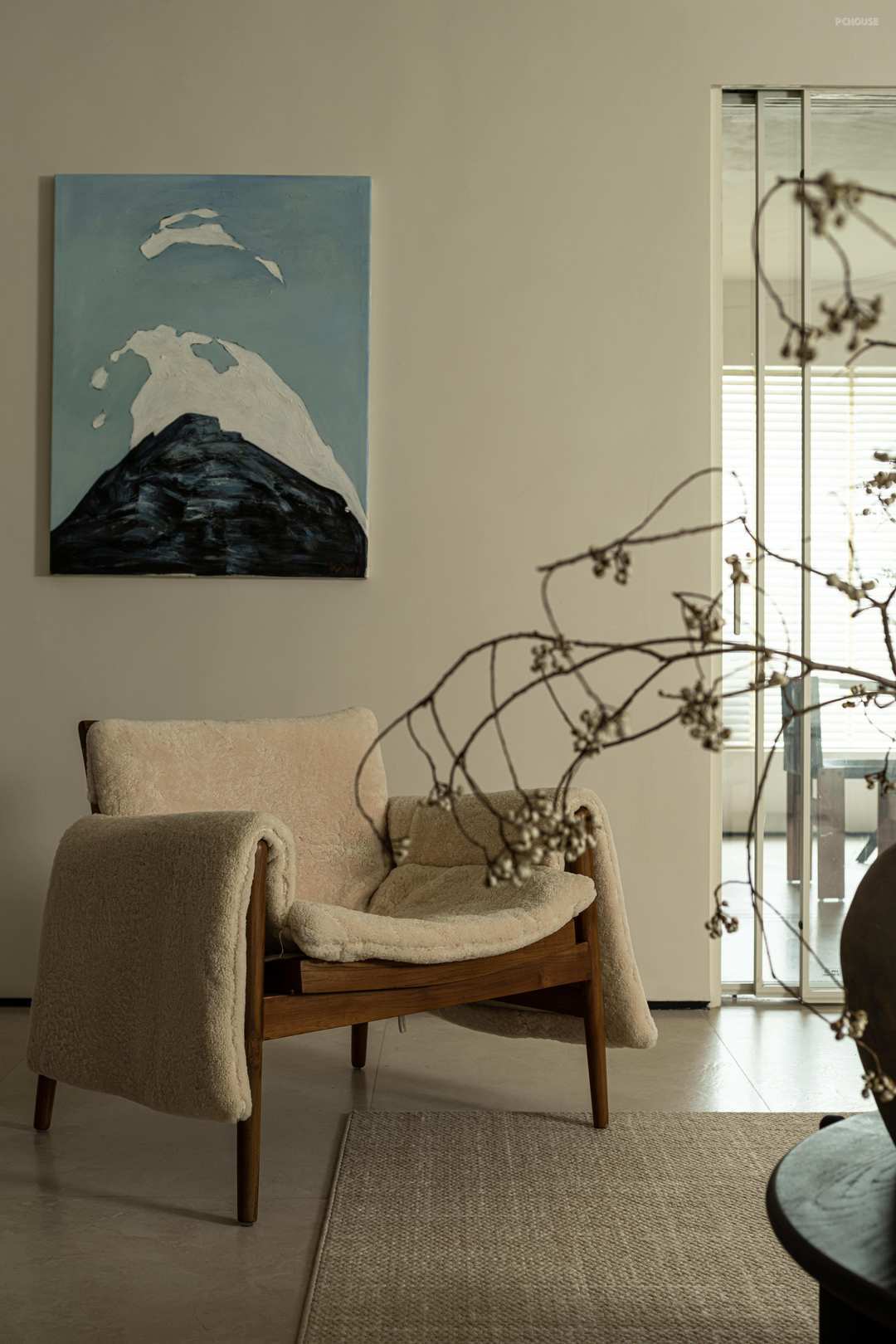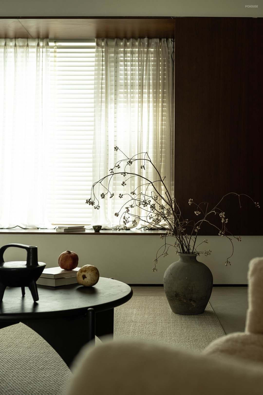 软装上米白色软包沙发搭配木质扶手椅,营造温暖舒适的核心坐区,黑色茶几以简约造型点缀,与浅色家具形成对比,增加空间视觉层次;墙上装饰画、窗边枯枝花艺、陶制花瓶等摆件,以自然元素呼应空间的质朴格调,让客厅兼具生活温度与美学品位。