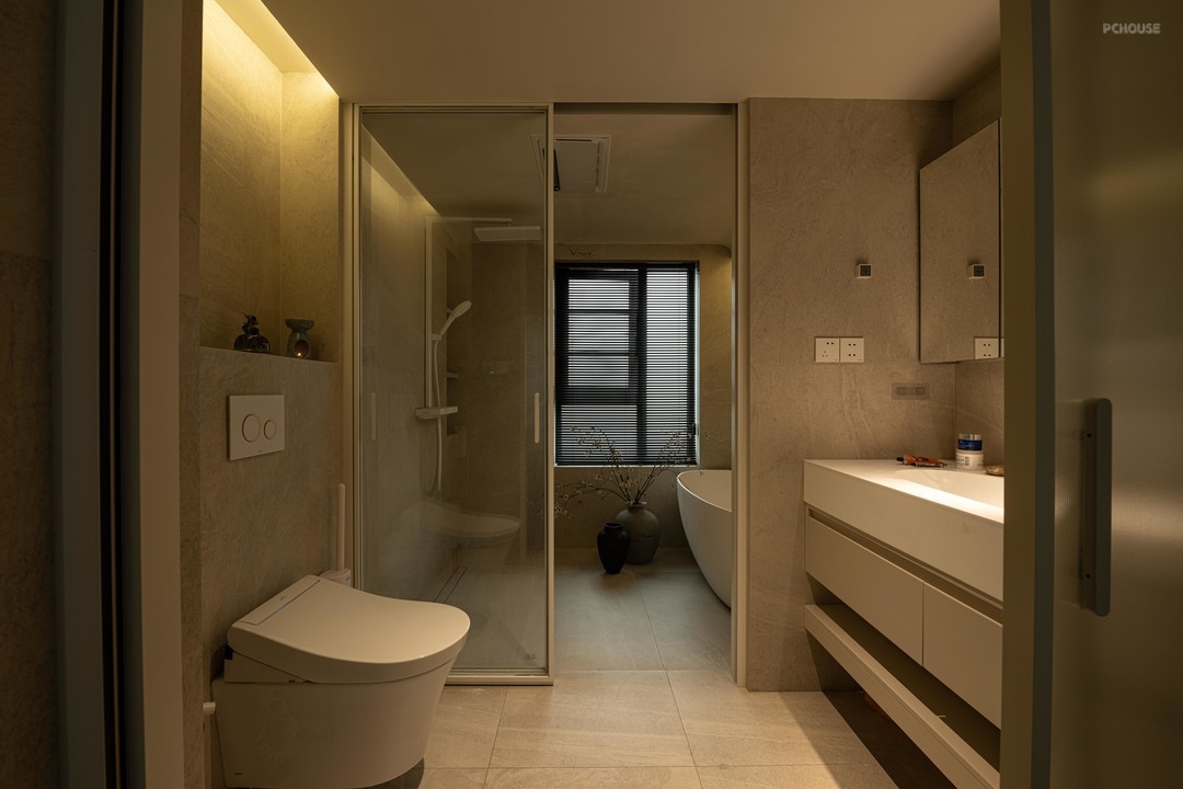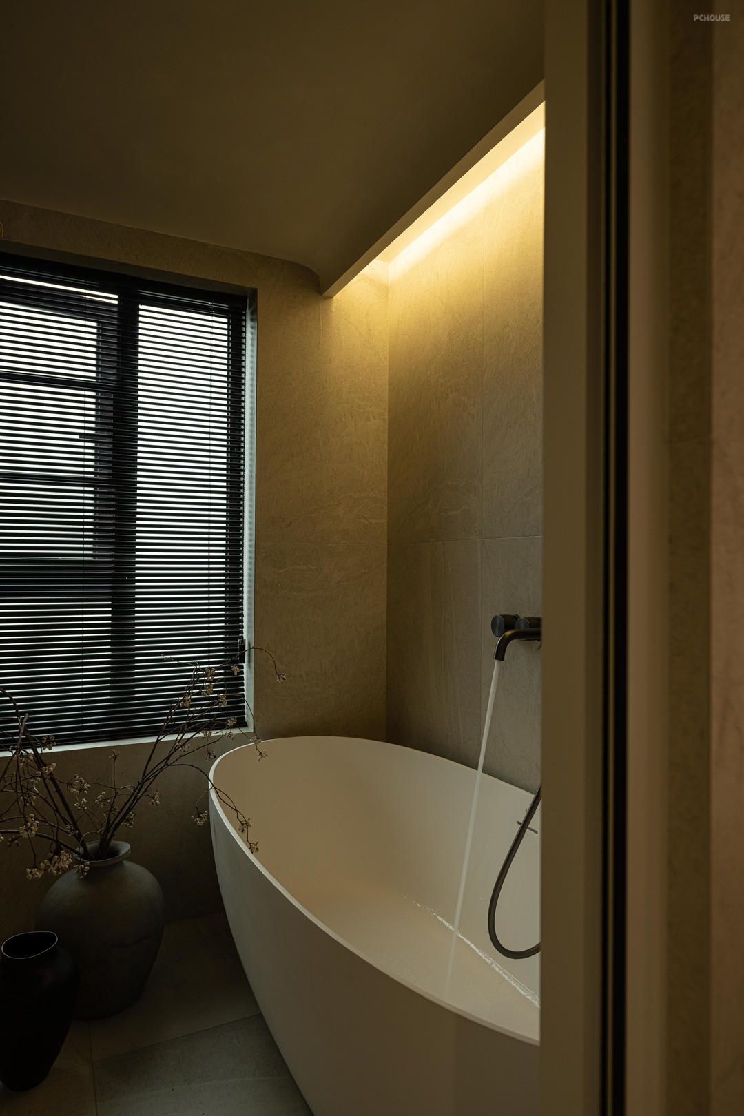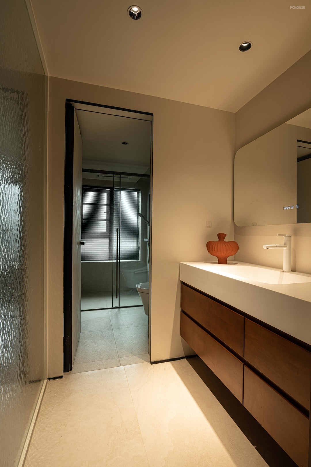 卫浴采用玻璃隔断划分淋浴区与其他区域,既实现功能分区,又保持空间通透感,以米黄色系瓷砖覆盖墙面与地面,传递柔和温暖的视觉感受,浴缸的设置更增添放松疗愈属性,适配高品质生活追求,浴缸上方隐藏式灯带设计,柔和光线烘托放松氛围,提升沐浴仪式感。