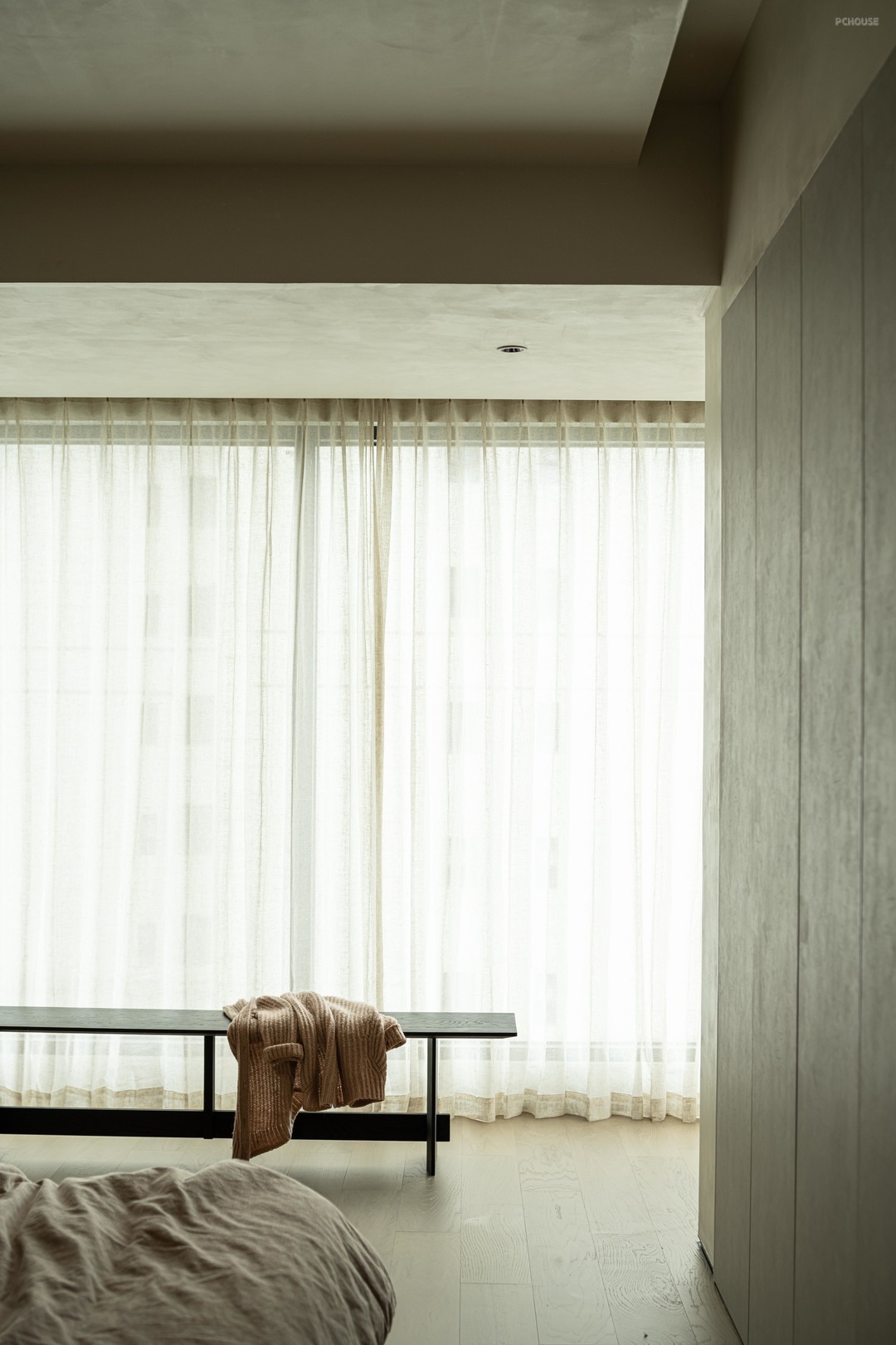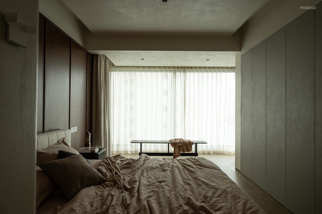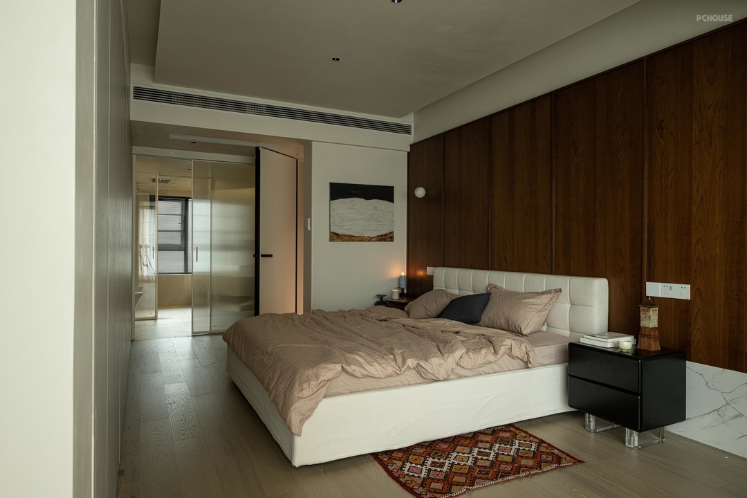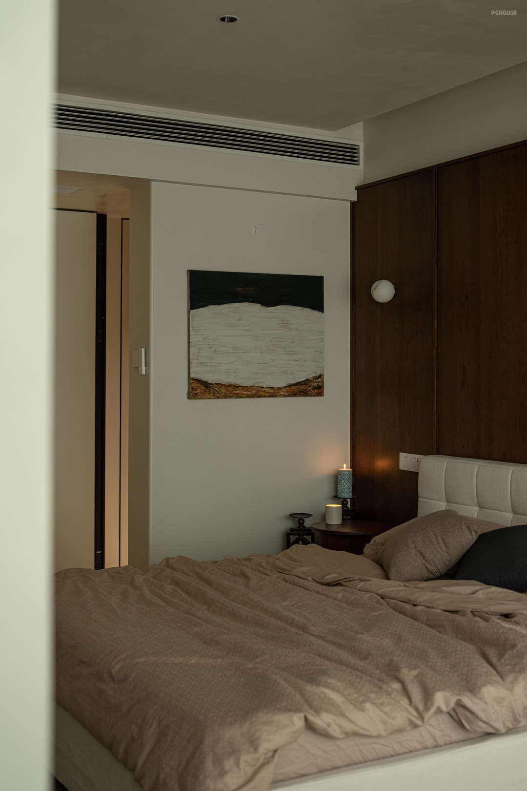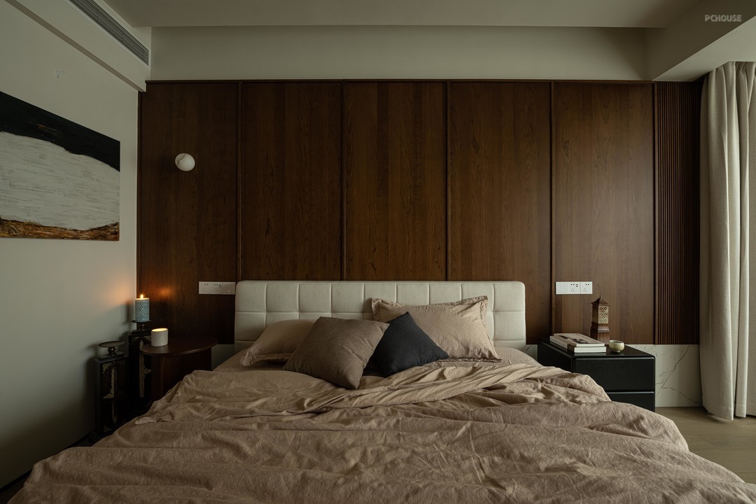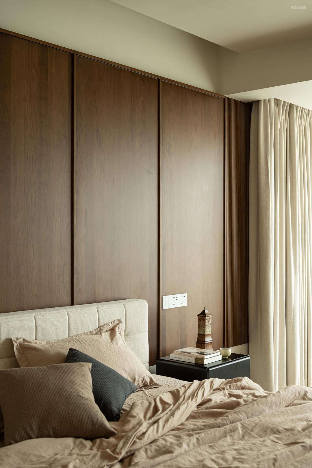 主卧从床品的柔和色调到窗边矮凳的简约设计,细节呼应整体风格,兼顾实用性与美学表达,打造兼具安全感与生活仪式感的私密空间;床头采用胡桃木骨骼线勾勒的半高护墙,以沉稳的质感木饰面提升空间厚重感与安全感;床对面的绿色衣柜内嵌梳妆台,将收纳与梳妆功能整合,体现空间利用的高效性。