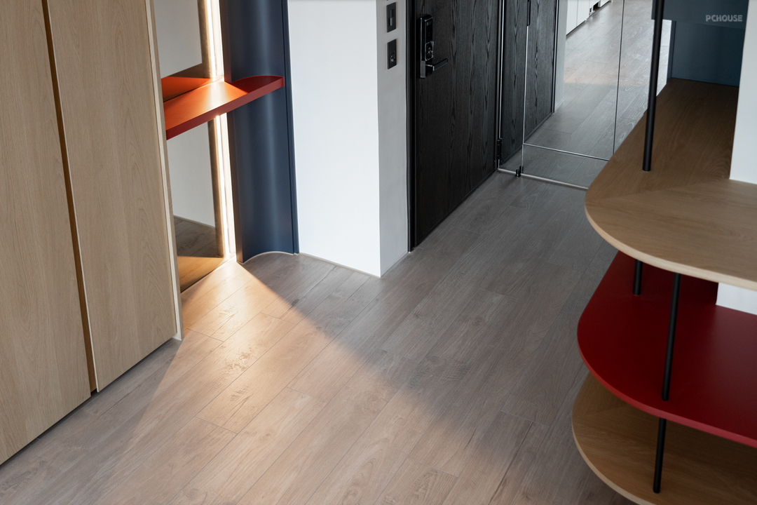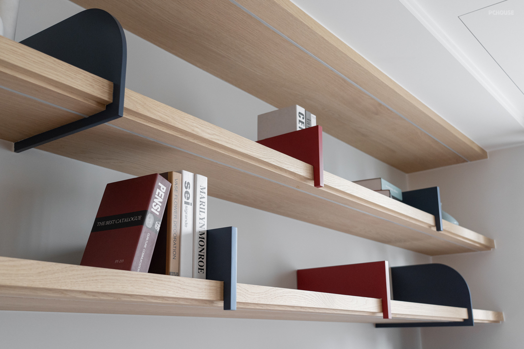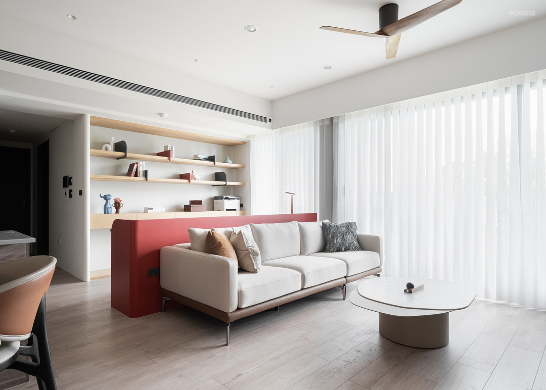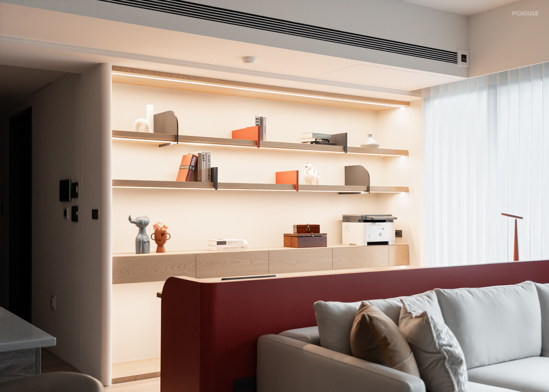 在客变阶段,原本位于客厅后方的 +1 房顺势退让,转化为一处开放阅读区。橘红木作矮墙轻巧点缀其中,为空间注入个性;活动式书档融入整体立面设计,平衡实用性与美感。