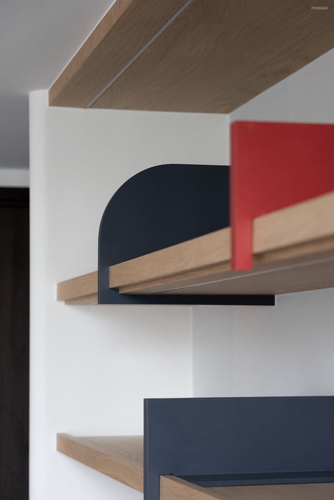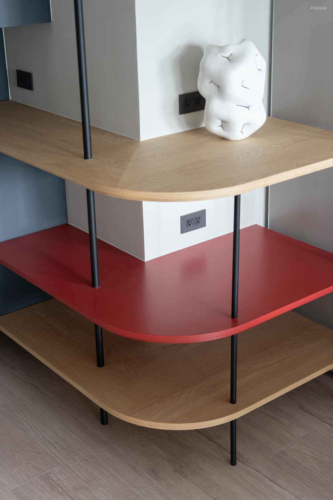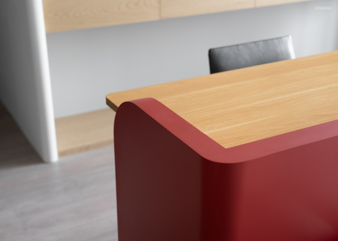 在客变阶段,原本位于客厅后方的 +1 房顺势退让,转化为一处开放阅读区。橘红木作矮墙轻巧点缀其中,为空间注入个性;活动式书档融入整体立面设计,平衡实用性与美感。