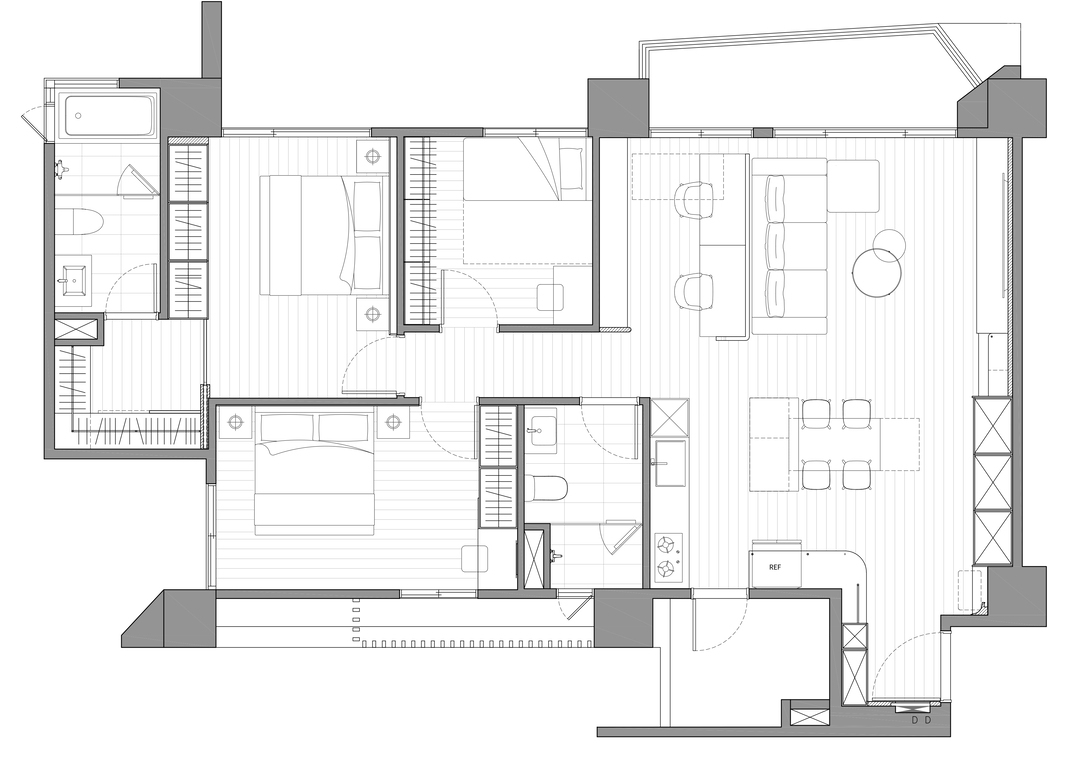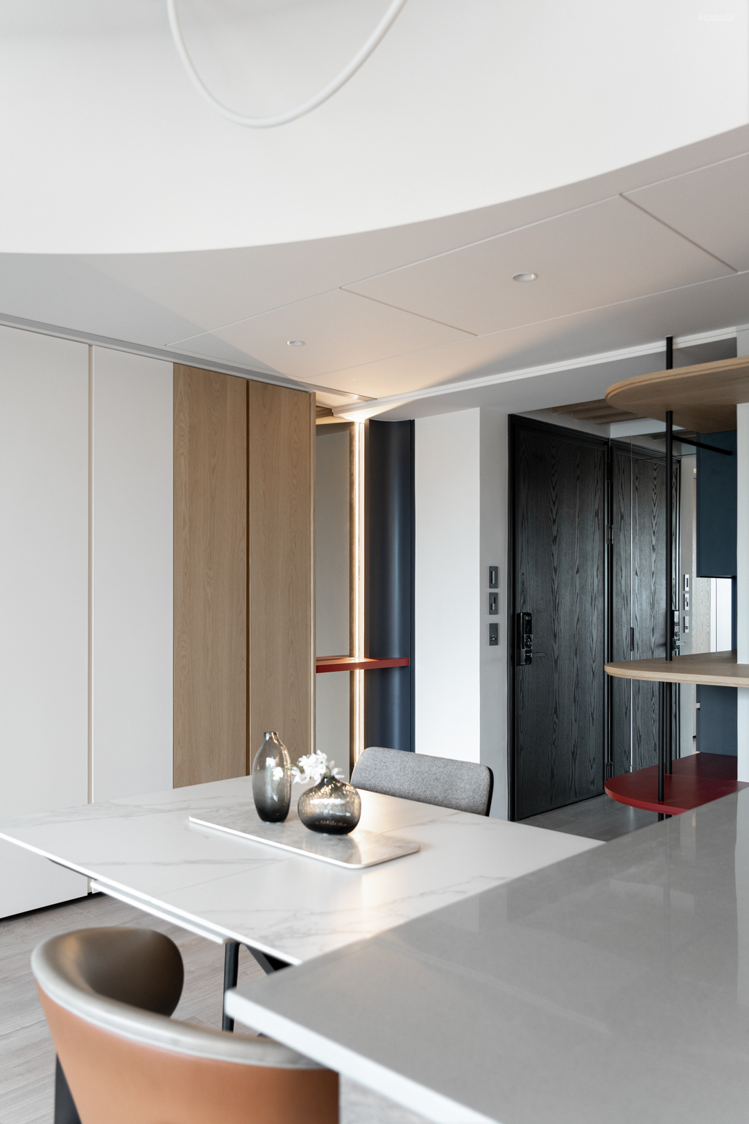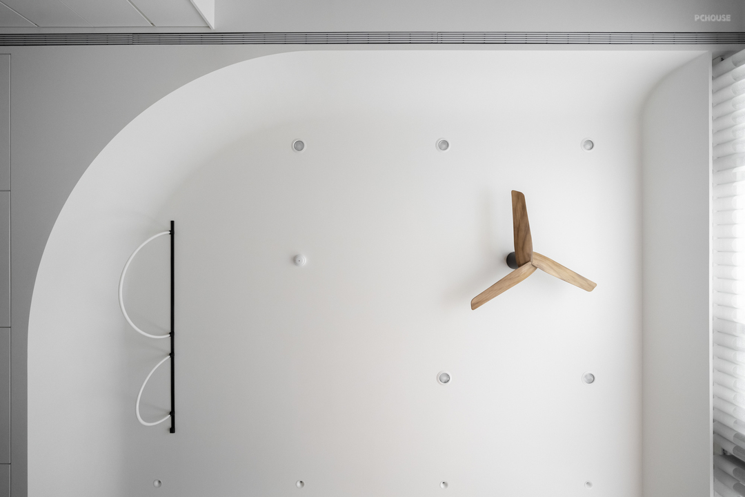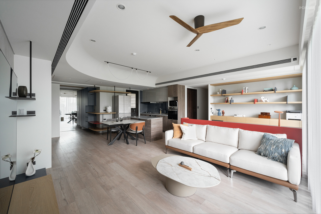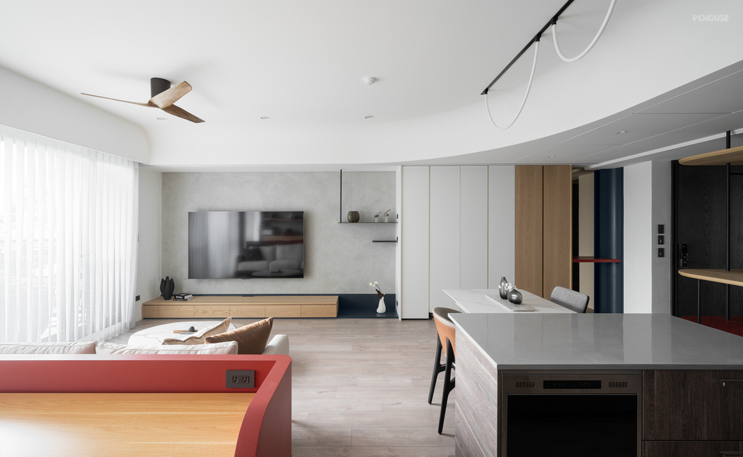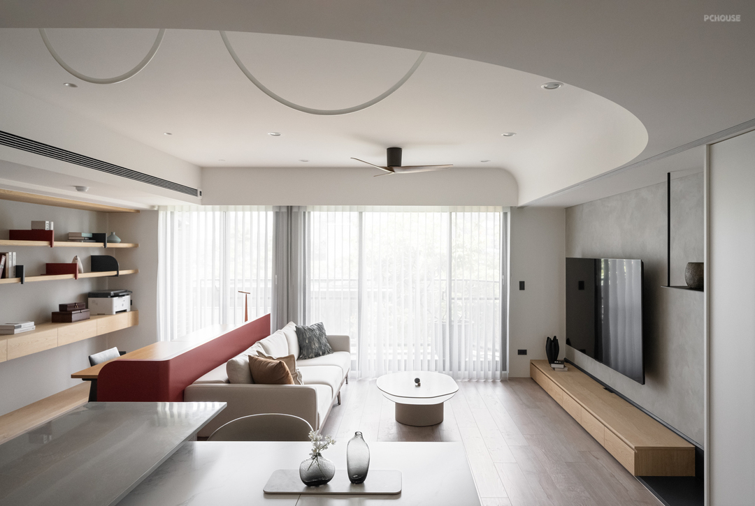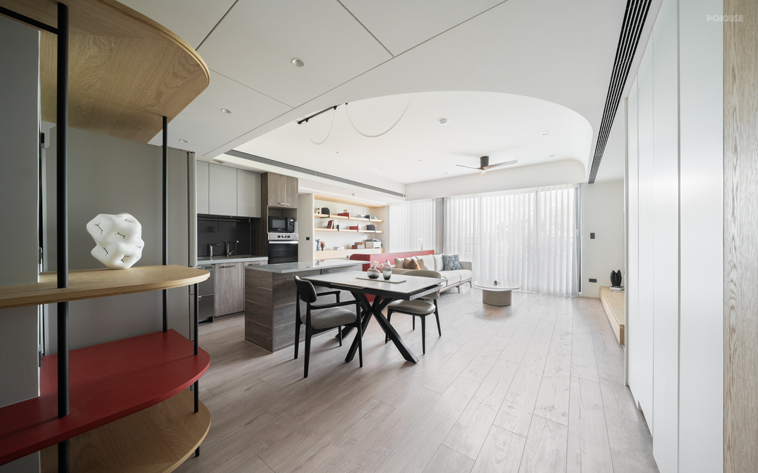 转入公领域,天花板以圆弧曲线包复整体视野。这道弧线不仅柔化原有梁体,更引导空间流动,营造开放而安定的生活节奏。