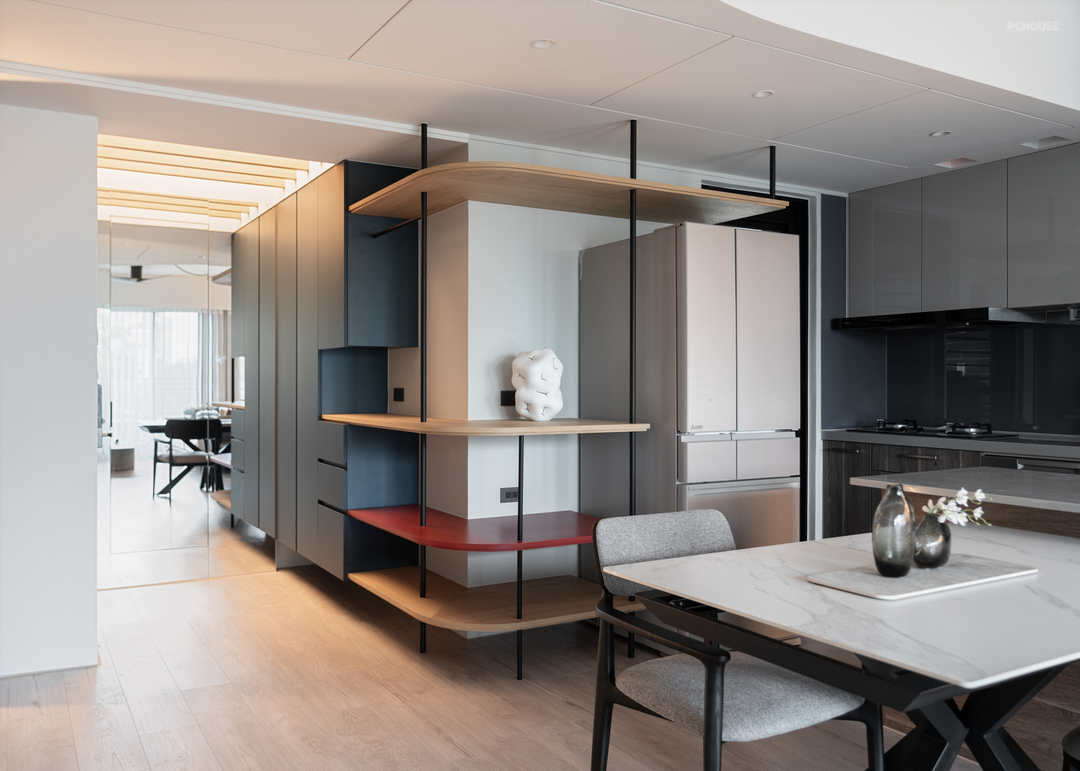 平台与层板自玄关一路延展至餐厨之间,成为咖啡机与日常用品的收纳场域。悬空设计结合铁件支撑,展现轻盈俐落的线条语汇,亦呼应整体空间的简约机能主轴。