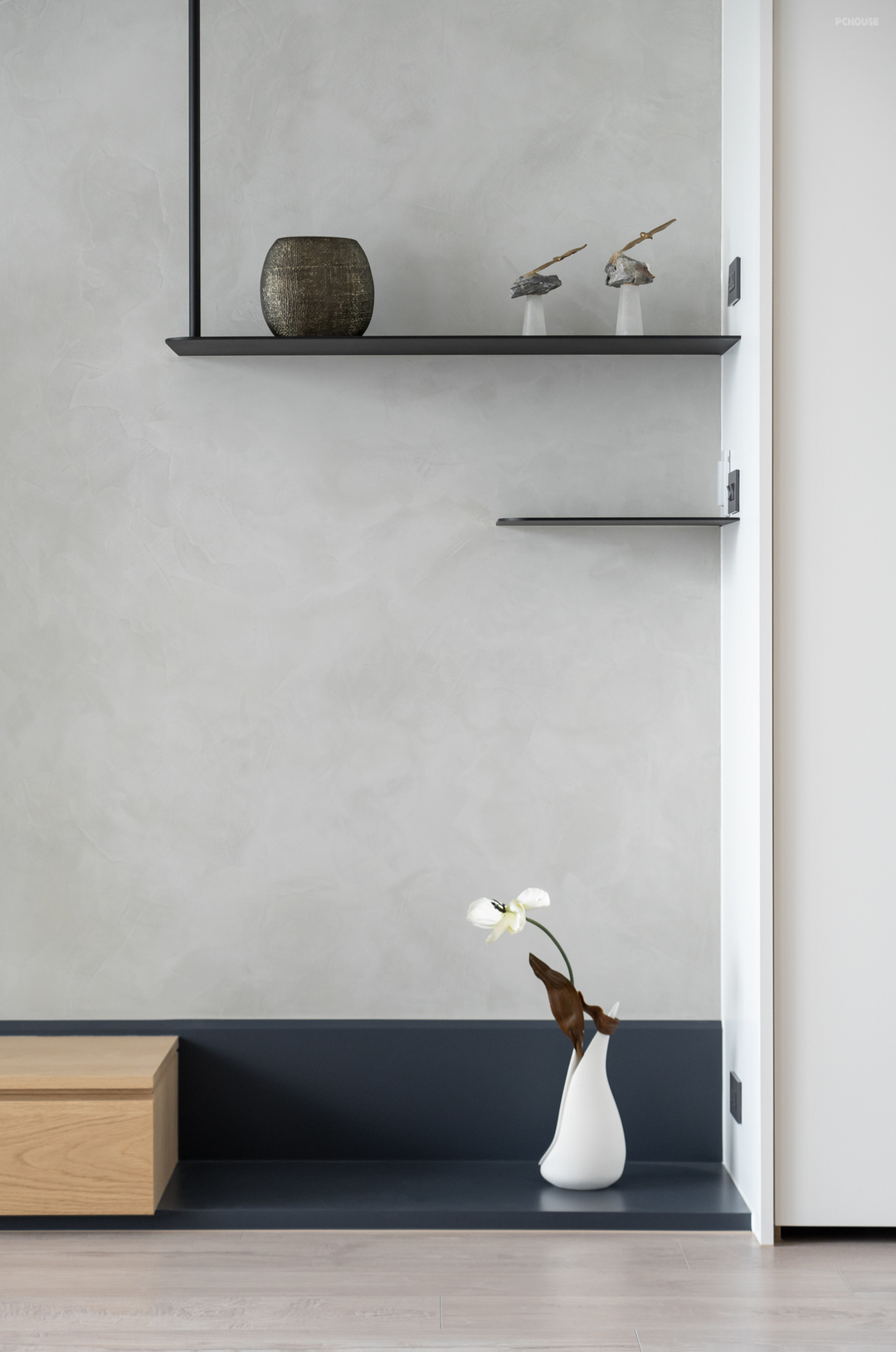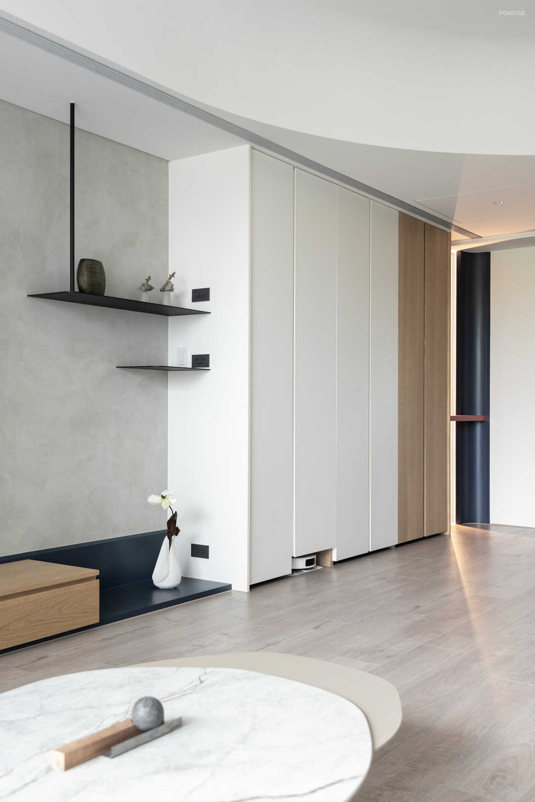 乐土材质铺陈电视墙面,作为静谧沉稳的视觉背景,下方木质收纳与一旁铁件层架相互平衡,形塑廊道尽头的注目焦点。
