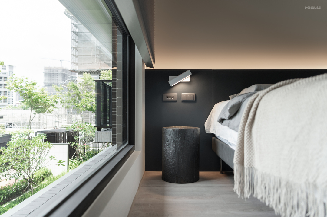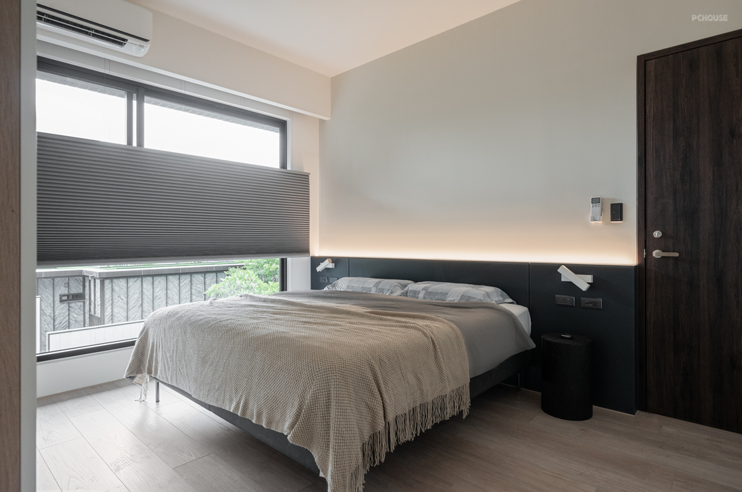 床头背墙选用米灰色系铺陈,搭配半腰高的系统背板与嵌灯设计,提供从阅读、放松到入睡的多段情境。