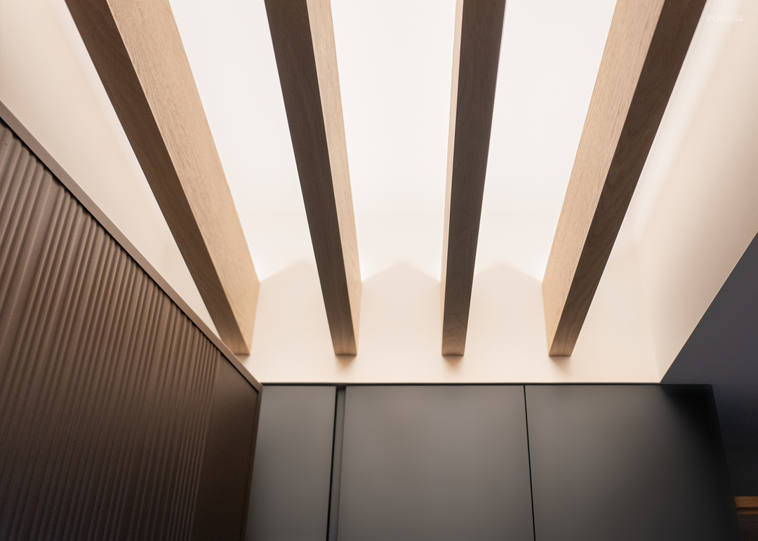 木格栅如同艺品般悬挂,搭配条灯自下而上的柔和照明,在转换心境的瞬间,为归返的脚步增添一份仪式感与温度。