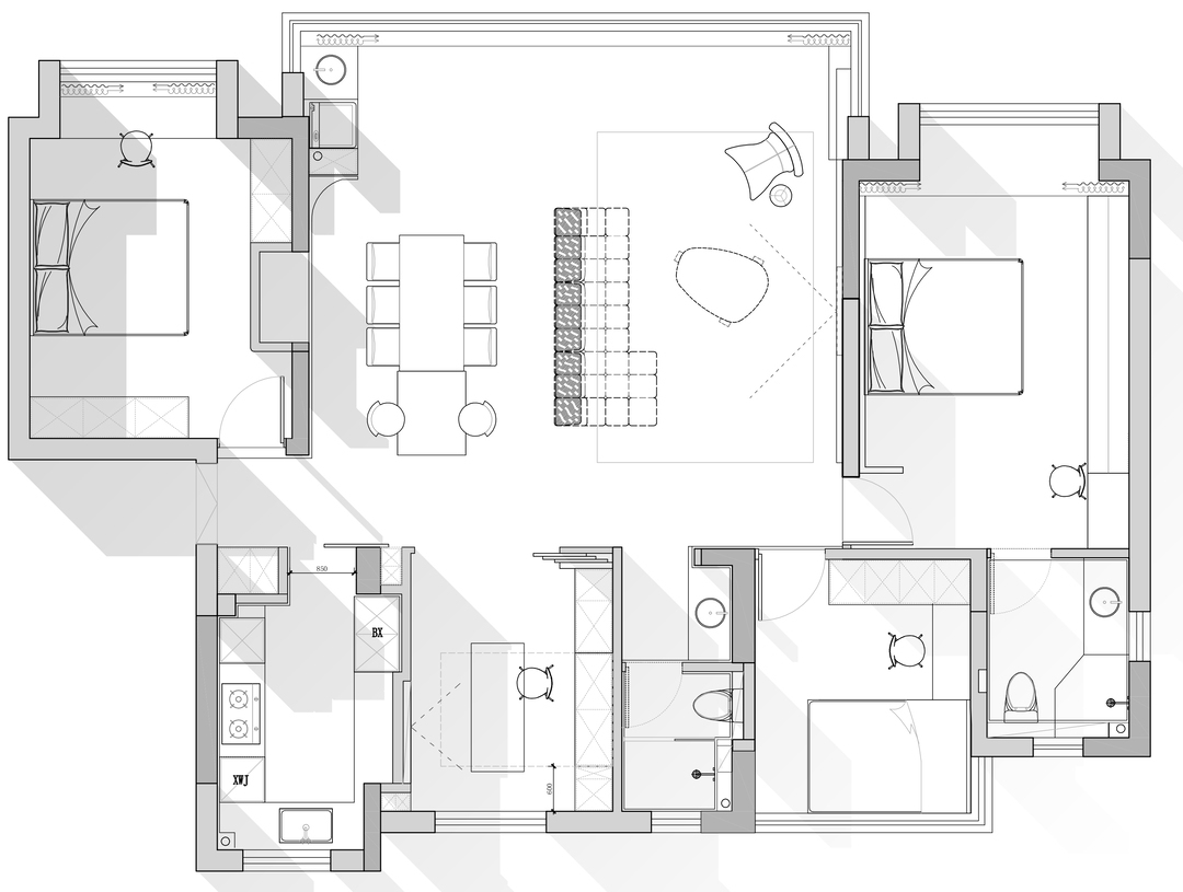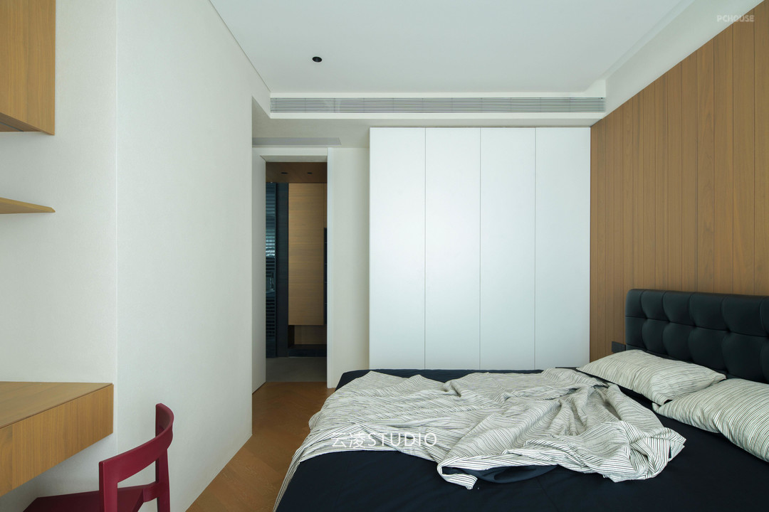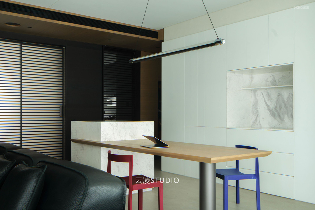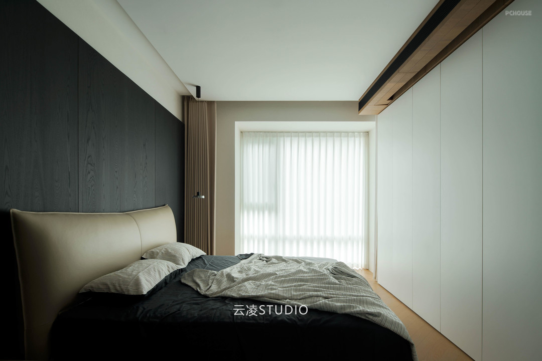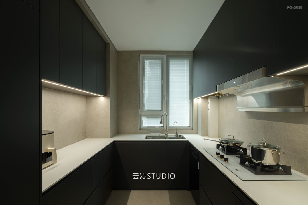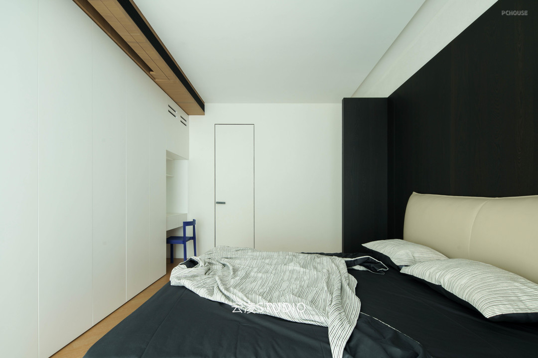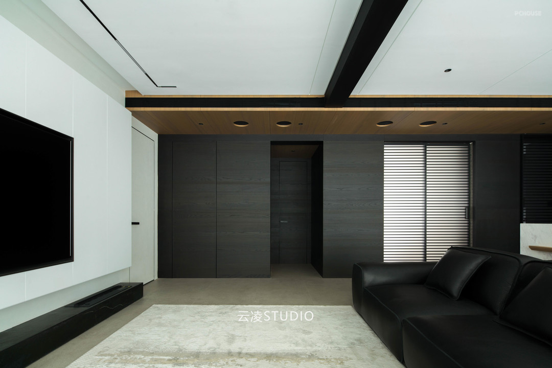 空间叙事中,贯穿始终的是对「空白」的执念:纯白墙面与浅灰地面的基底,被木质纹理与深色金属线条温柔切割;几何切割的天花板造型、隐藏式收纳系统与嵌入式家电,消弭了视觉冗余。