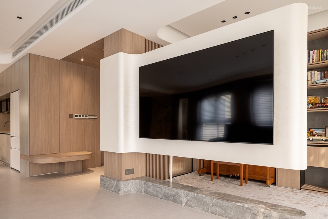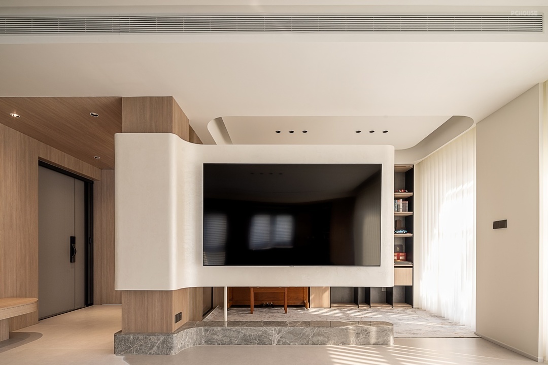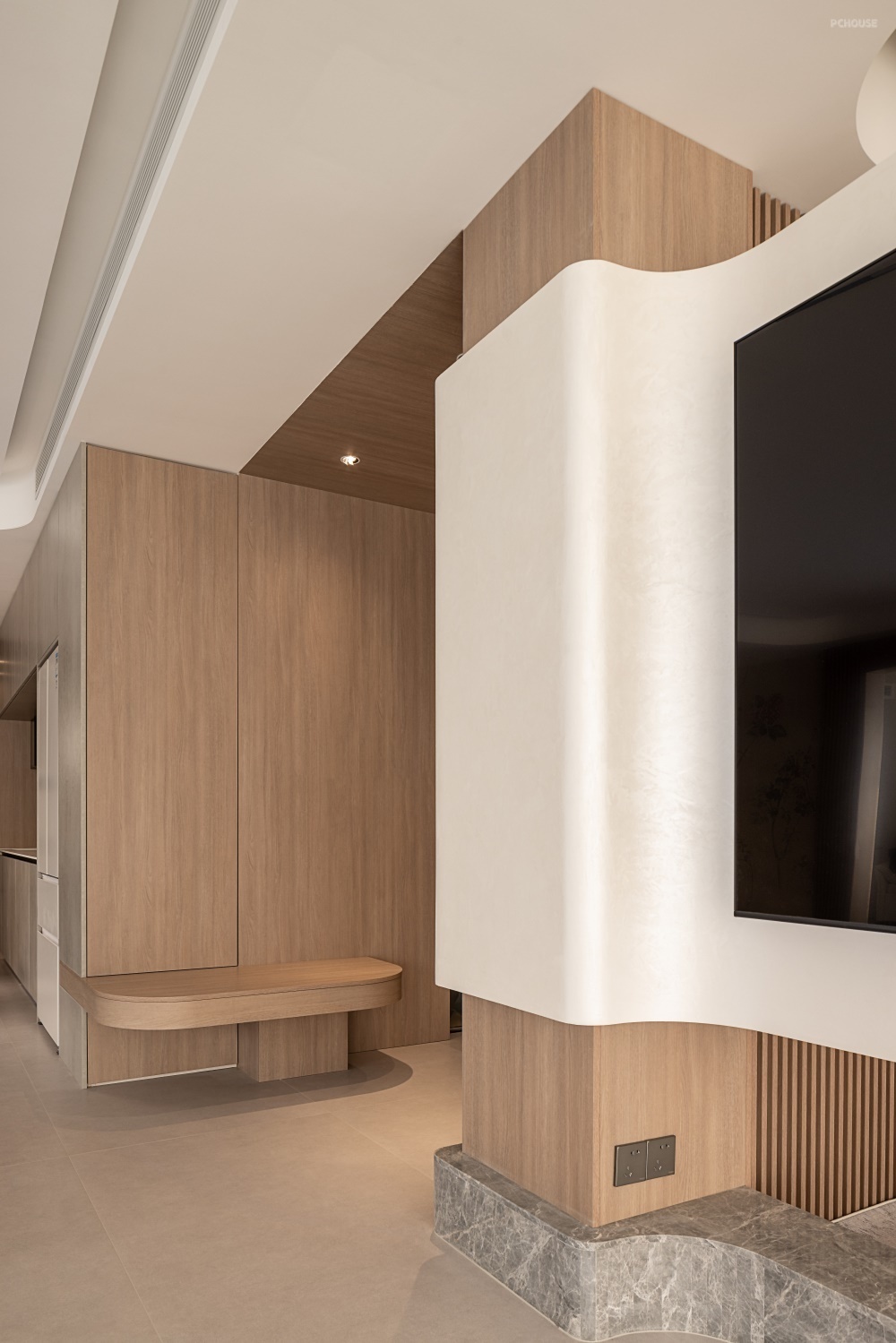 客厅改造将原本包含在主卧进门一侧的小套间空间打通,使其与客厅合为一体。客厅沙发集中布局,增强空间的整体性与互动性。电视背景墙采用悬空设计,巧妙结合原始承重墙,运用钢结构悬挂电视,既稳固又具现代感。表面涂抹蛋壳艺术漆,电视嵌入其中,呈现出简洁美观的视觉效果。把部分插电设备隐匿于电视后方的柜体中,柜体底部采用大理石台面,并设计成弧形,增添柔和优雅的气质。