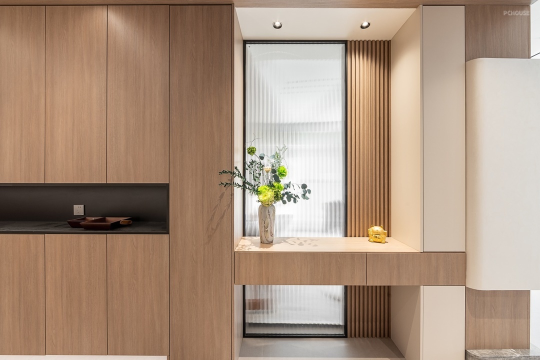 原本入户正对着一面实体墙,为提升空间通透感,我们将其拆除,替换为玻璃隔断搭配悬念台面,上面摆放绿植,让入户瞬间便能收获惊艳视觉体验,同时极大地提升了采光效果。