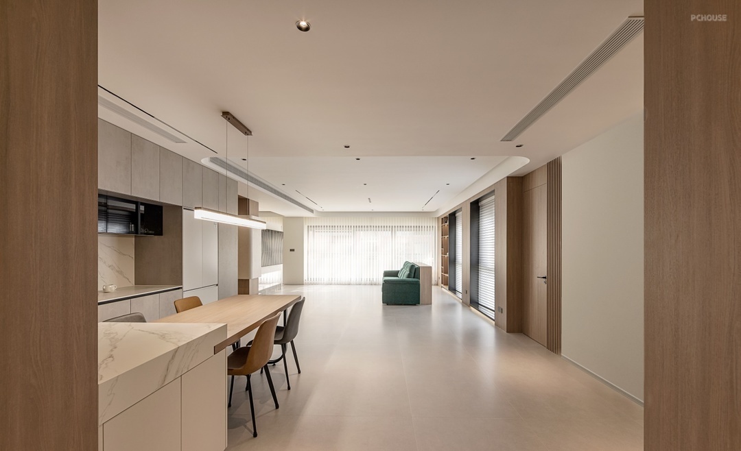 站在餐厅望向客厅,南北通透的格局让空间豁然开朗。设计师采用无主灯设计,进一步拓宽了视觉感受。整体空间以白色为主调,搭配温润的原木色家具,二者相得益彰,营造出温馨明亮的居家氛围,让人倍感舒适惬意。 整个顶部安装磁吸轨道灯和内嵌筒灯,让空间更显开阔大气。一整面白色窗纱窗帘,为空间带来极佳的通透感。
