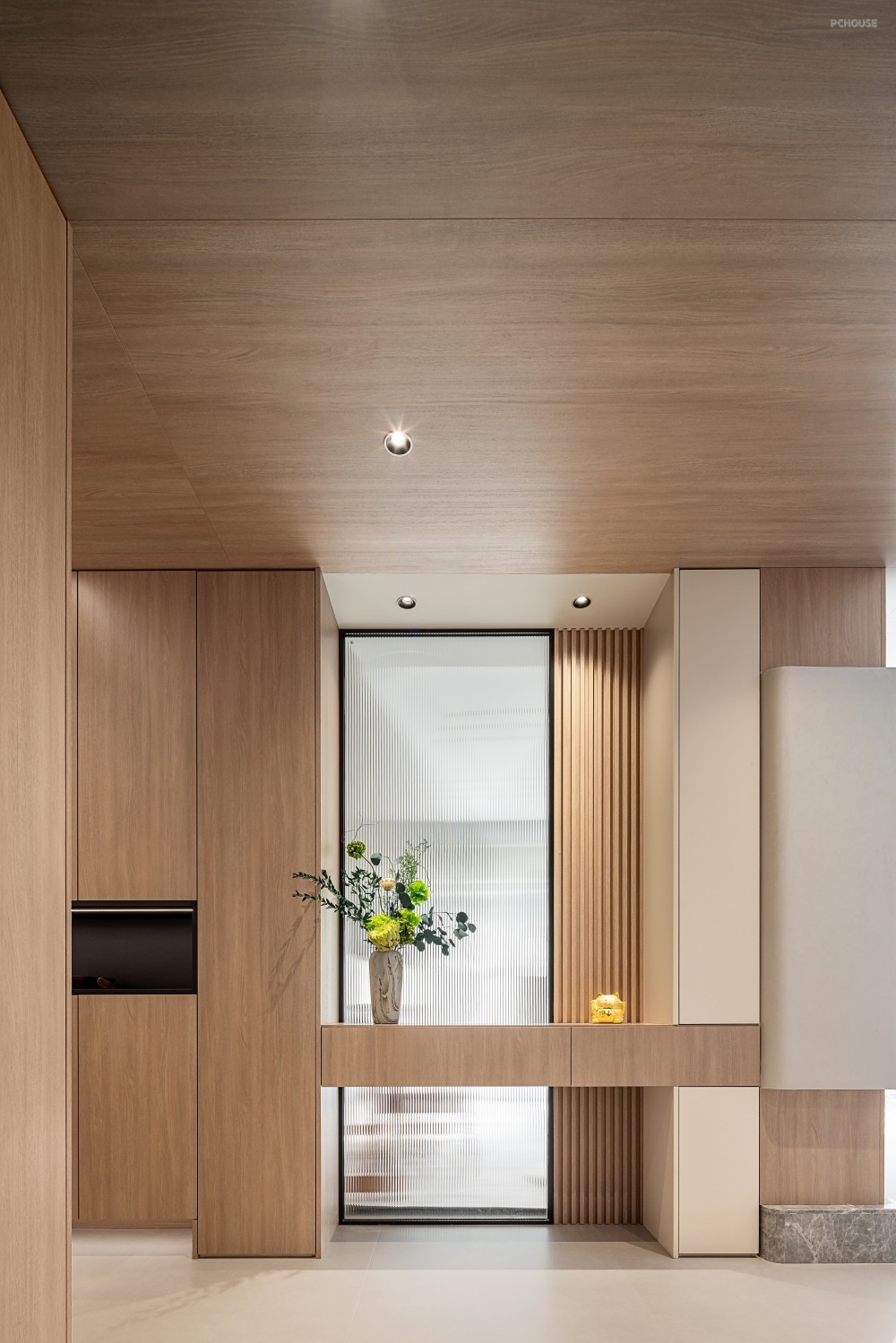 在玻璃玄关隔断的左侧设置鞋柜,柜体顶部到顶,底部与中间均做镂空处理,既保证了充足的收纳空间,又增添了轻盈感。