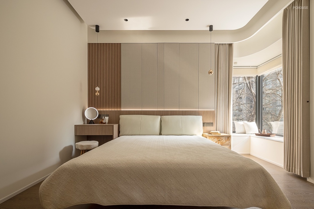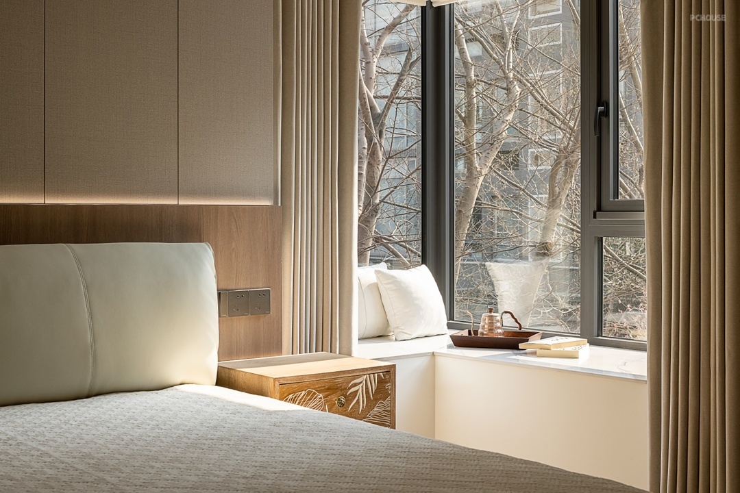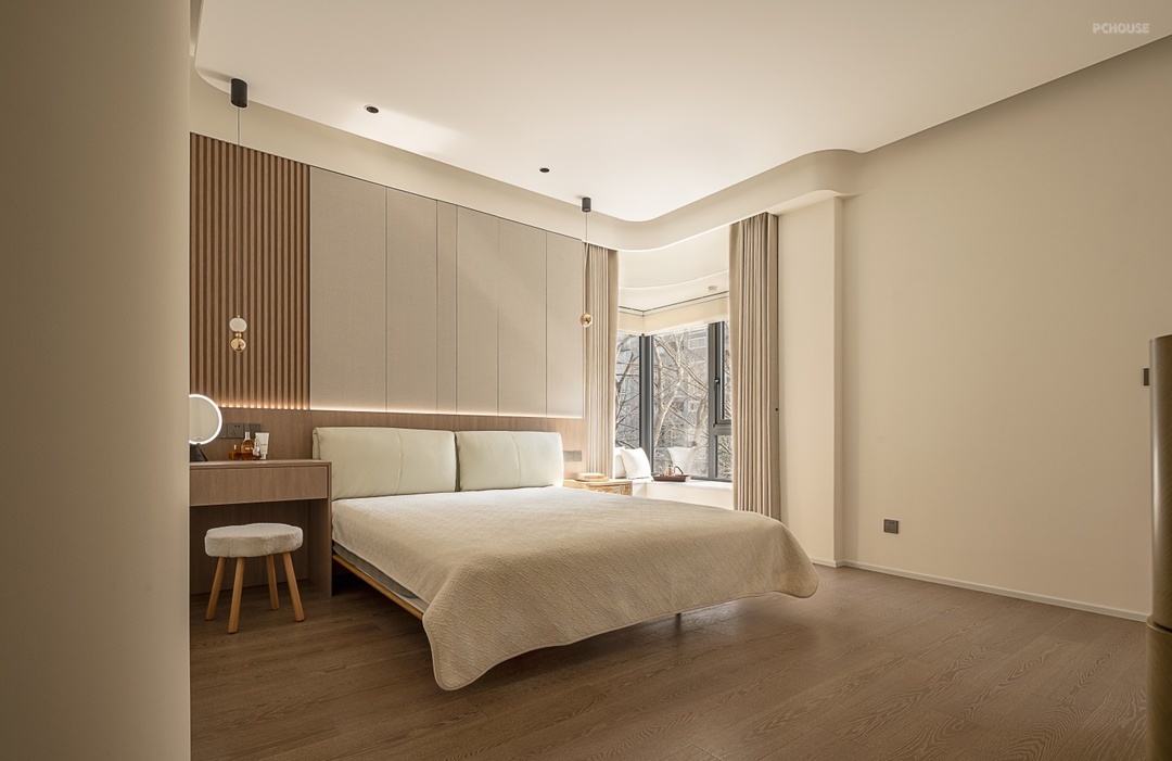 在床头柜一侧,定制悬空柜体用作化妆桌,巧妙利用空间,兼具美观与实用性。窗台一侧采用转角窗帘的弧形设计,为空间增添柔和弧度,视觉上更加灵动。原本的飘窗被打造成休闲空间,可供休憩、阅读。顶部采用悬空吊顶,并内嵌灯带,灯带散发的光线让卧室更具氛围感。