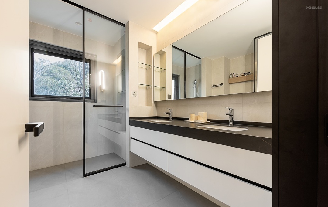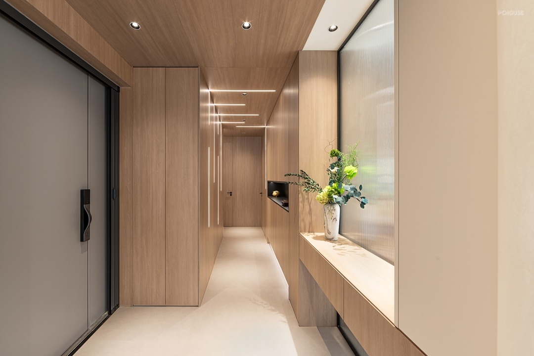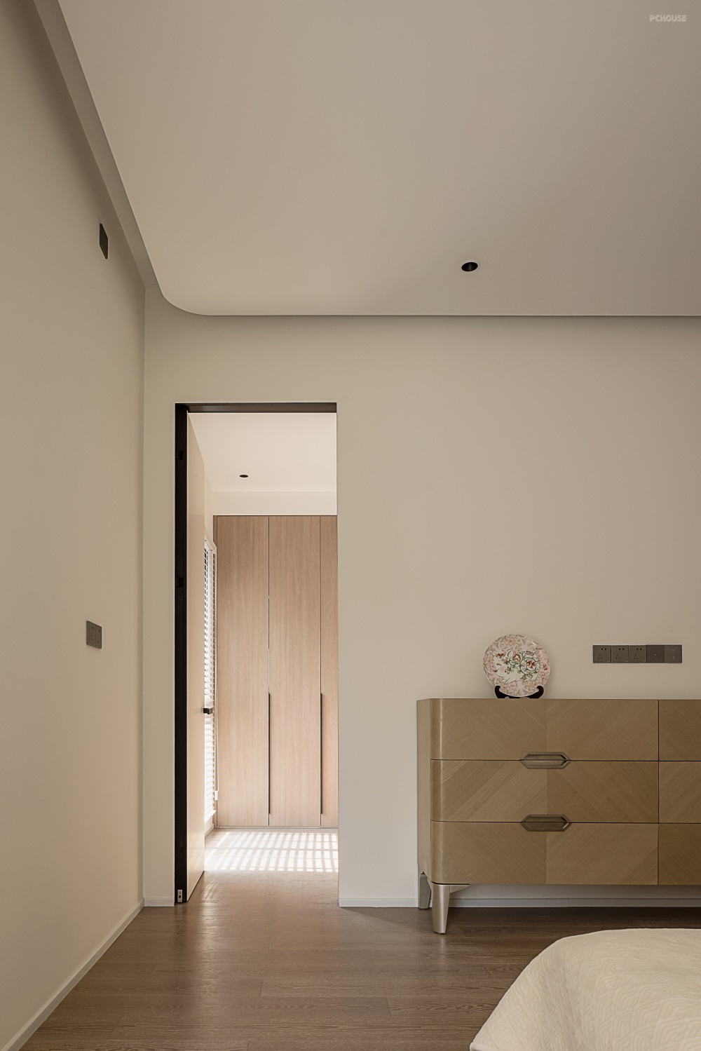 整个走廊顶部采用木饰面装饰,并嵌入筒灯,不仅提升空间格调,还能通过柔和灯光营造温馨氛围。鞋柜的另一侧墙面,采用木饰面搭配内藏式隐形线形灯带,与过道尽头的隐形门巧妙融合,从视觉上弱化门的存在,使整体空间更显自然流畅,营造出浑然一体的美感。打开这扇隐形门,内部呈现出套房形式的布局,包含主卧、儿童房以及客房。套房设计既保证了各房间的独立性与私密性,又让空间利用更为合理高效,满足业主多样化的居住需求。