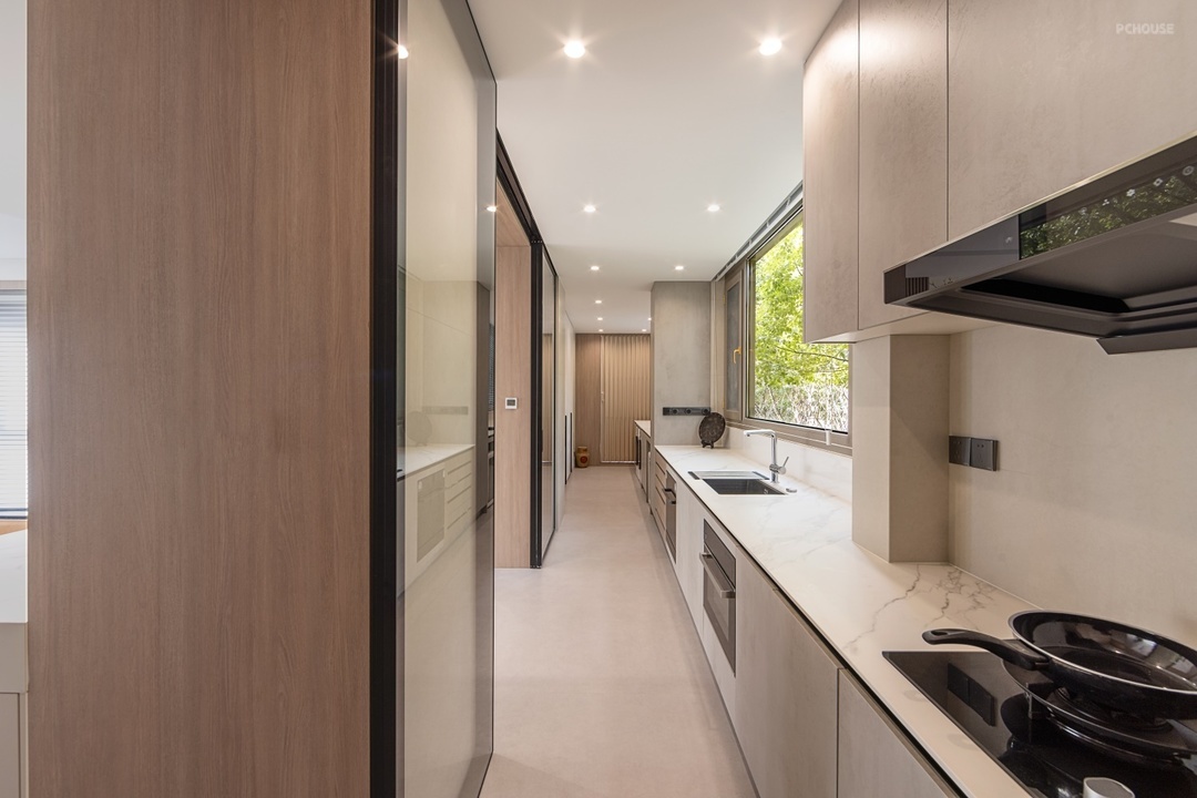 我们把原本的厨房空间巧妙改造成多功能卧室,同时将厨房迁移至原始设备空间一侧,沿着过道呈一字型靠墙布局。厨房台面下方精心嵌入烤箱与微波炉,而在台面的另一侧,定制了一整排集收纳与实用为一体的柜体,并搭配嵌入式电器,大幅提升了空间的收纳能力,功能十分强大。