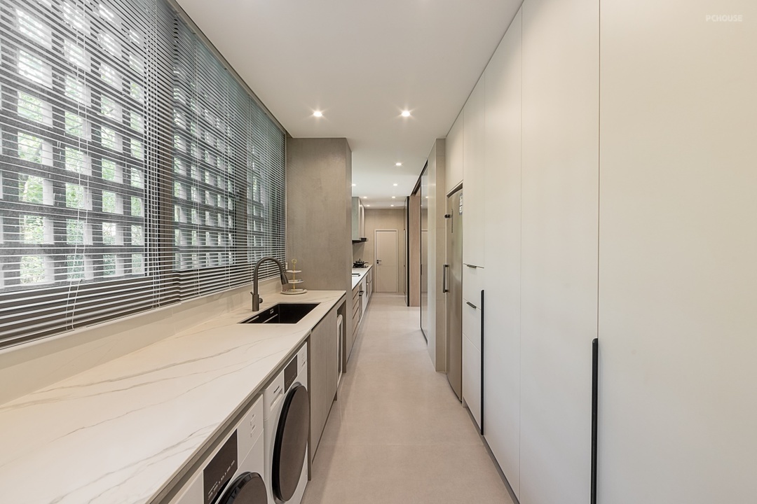 厨房空间顺势延展至露台一侧,将此处规划为洗衣房区域。同时,对露台进行重新搭建,打造成阳光房,不仅为衣物晾晒提供了便利实用的专属空间,还能让阳光充分洒入,增添室内温馨氛围 。