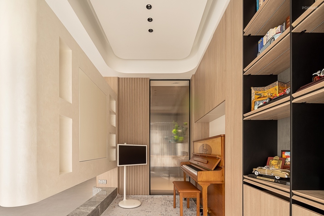 沙发靠背后精心设置了钢琴区,并与柜体进行一体化设计。柜体采用开放式层架结构,不仅为放置书籍提供了充足空间,还能完美陈列各类装饰品,为空间增添艺术氛围。在材质与色彩的搭配上,选用温暖自然的原木色作为主色调,同时穿插点缀黑色层板,通过深浅色调的碰撞,营造出独特而富有层次感的视觉效果,为整个空间注入时尚与个性元素。