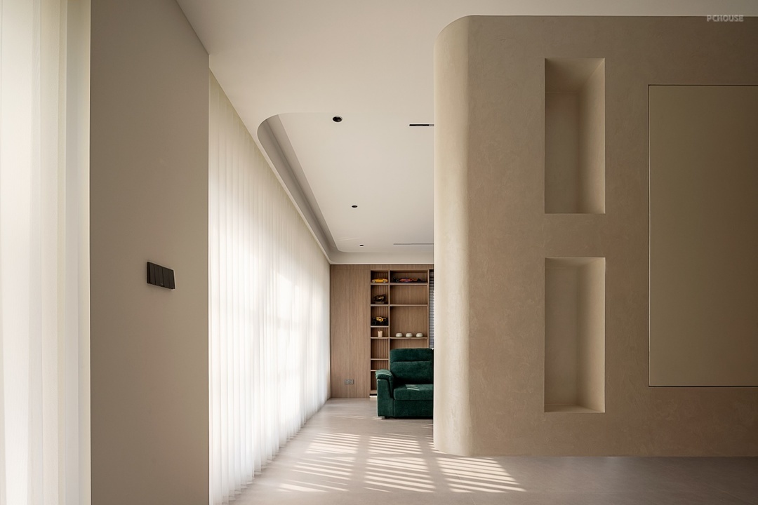 卡座的弧形设计,流畅的线条不仅巧妙利用了空间,还为归家之人提供了舒适的换鞋、小憩区域,彰显出独特的设计巧思。