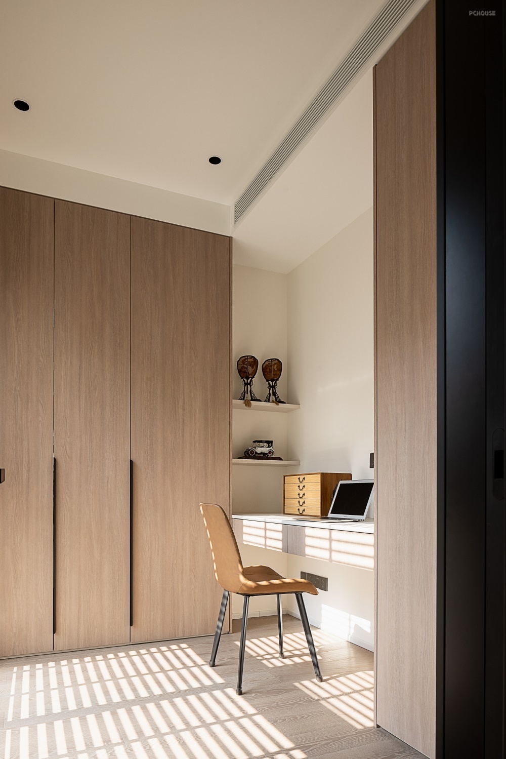 隐形门巧妙地融入柜体之中,当门闭合时,从外观上几乎难以察觉门的存在,使整个空间保持简洁流畅的视觉效果,极大地提升了空间的整体性与美观度。与此同时,在书房的墙面上设置了层架,层架不仅可以进一步收纳小型物品,还能作为独特的墙面装饰,摆放一些富有艺术感的工艺品,为书房增添文化氛围与艺术气息,打造出一个兼具收纳、装饰与实用功能的理想书房空间 。