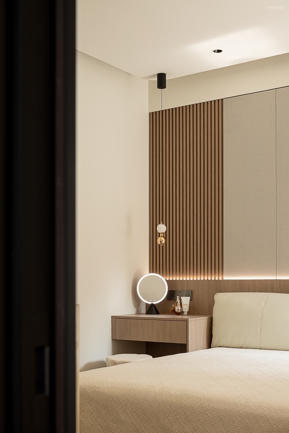 我们对原始主卧内的套房布局重新规划,将卫生间改造成了衣帽间,极大提升了衣物收纳功能。主卧背景墙运用硬包木饰面与木格栅拼接,搭配内嵌隐形灯带,灯光亮起时,既能补充柔和光线,又营造出温馨浪漫的氛围,增强了空间层次感。左右两侧的吊灯进一步渲染氛围,为卧室增添温馨气息。