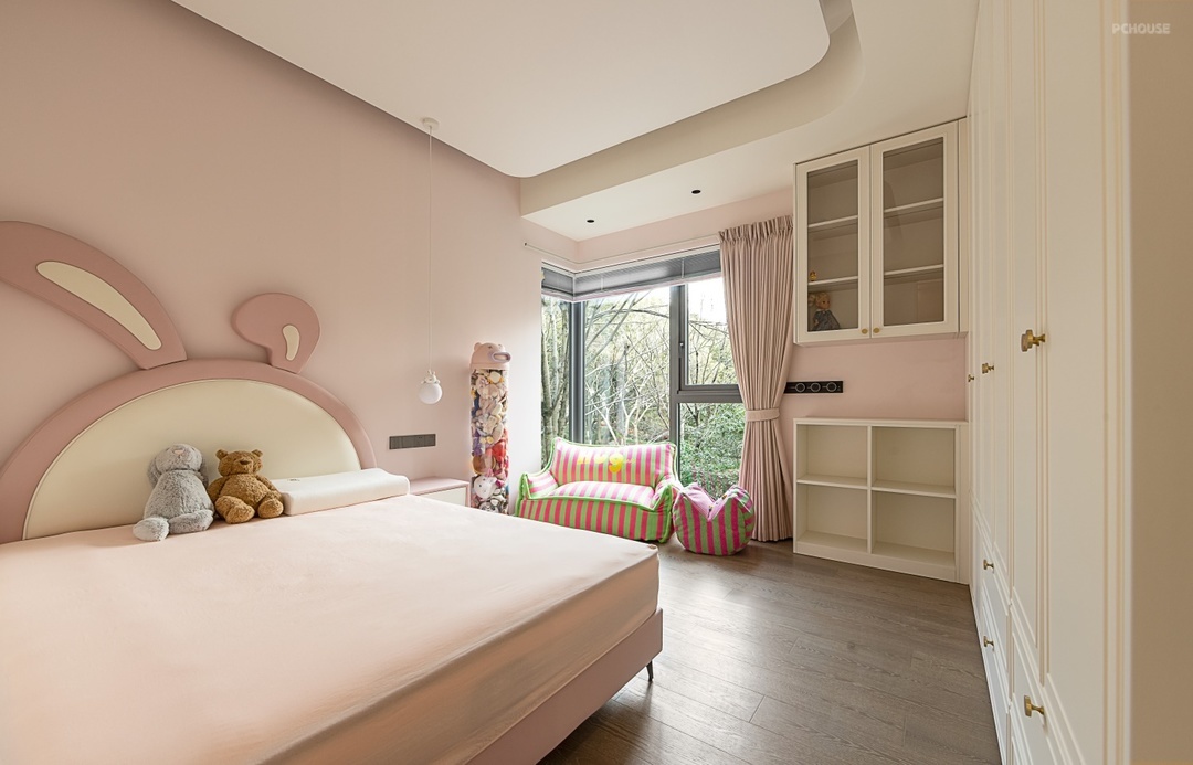 整个儿童房以温馨的粉色系搭配纯净白色为主色调,营造出甜美烂漫的氛围。顶部选用悬空吊顶,轻盈的设计让空间更显开阔。沿着墙面定制了一排到顶的柜体作为衣柜,满足充足的衣物收纳需求,巧妙利用空间,整洁又美观。