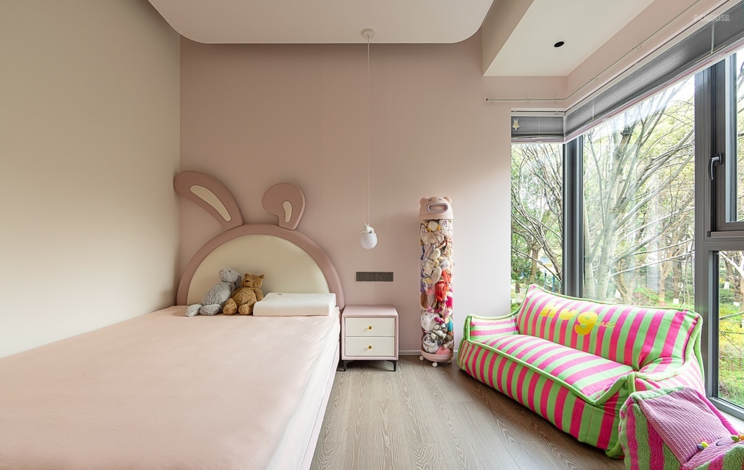 房间摆放着可爱的卡通式儿童床,靠墙放置,有效节省空间。地面铺设地板,温润舒适。在转角窗户一侧,安置了柔软的落地沙发,为孩子打造了惬意的休闲角落。而在床头柜一侧,精心设计了童趣十足的吊灯,其独特造型在提供照明的同时,也为儿童房增添了一抹活泼的气息 。