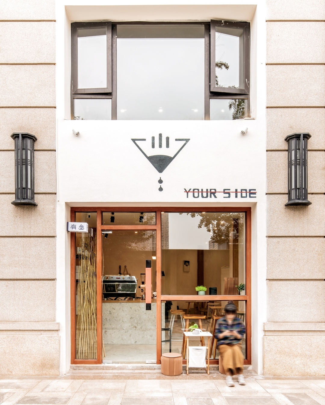 门头采用开放式玻璃立面设计,增强内外通透感,并设置木质框架和小型室外座位区,与街景自然融合。立面材料使用木工板打底、饰以木纹饰面板,呈现温润质感,品牌名称与logo则由手绘完成,强化手作气息与辨识度。