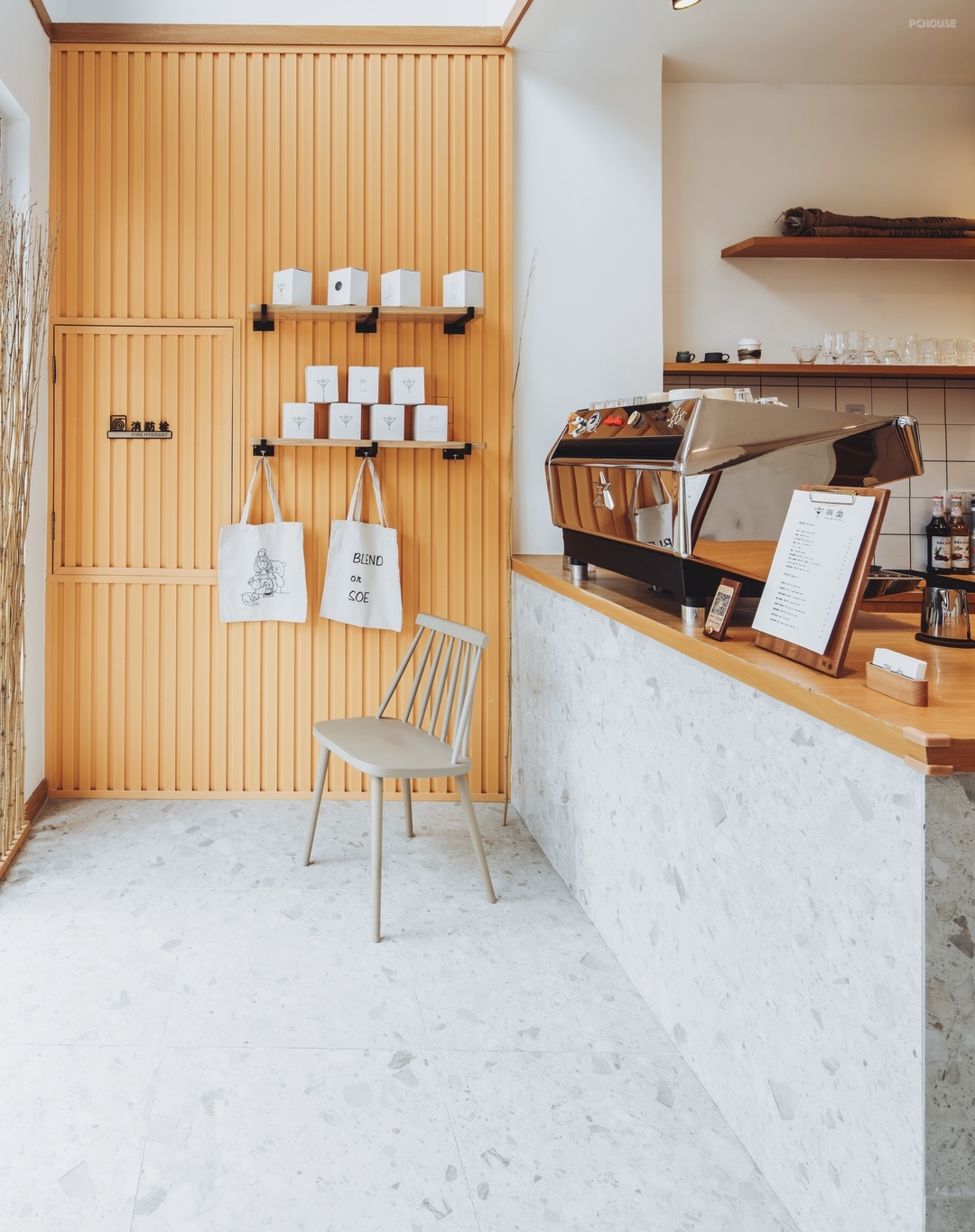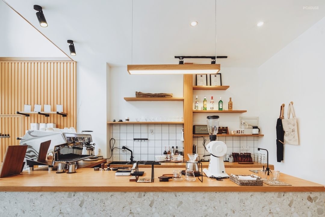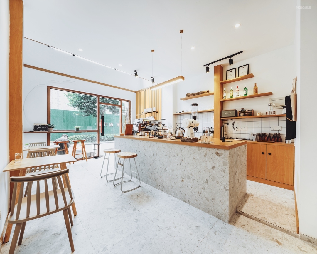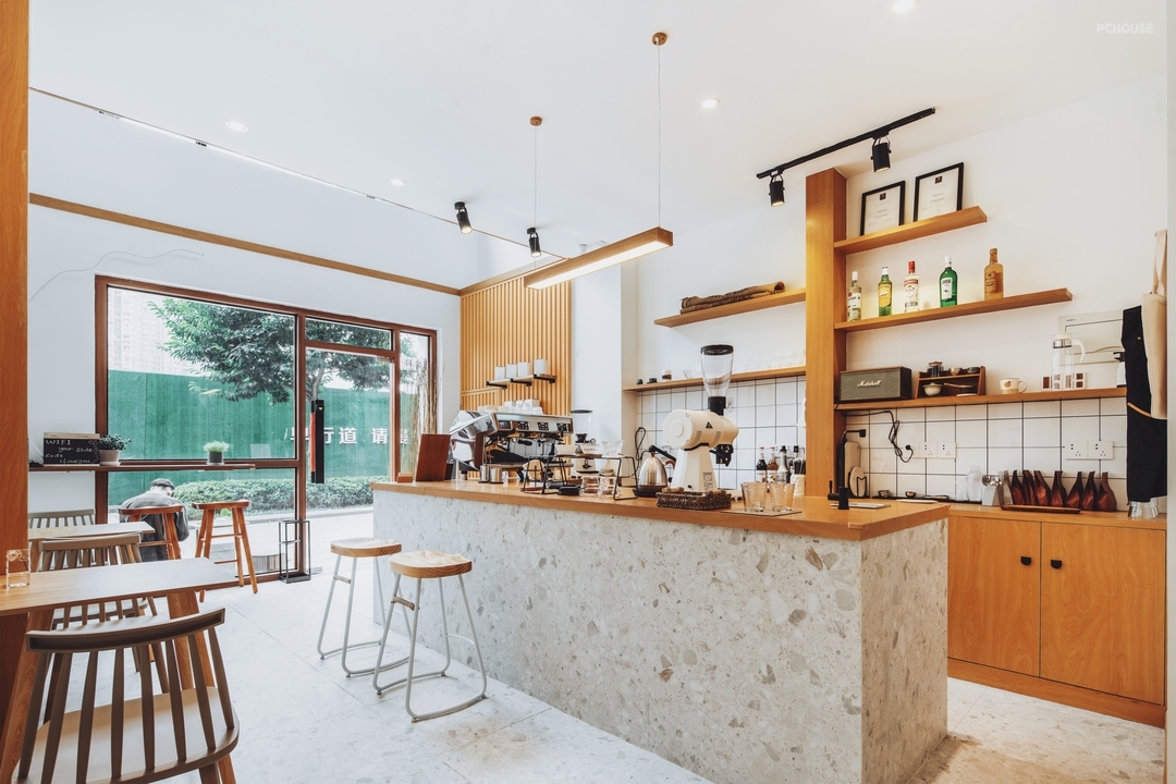 吧台位于室内核心位置,面向入口,方便顾客点单并提升操作效率。操作台采用仿水磨石地砖作为地面铺设,与空间整体色调统一,并具有良好的耐磨与易清洁特性。