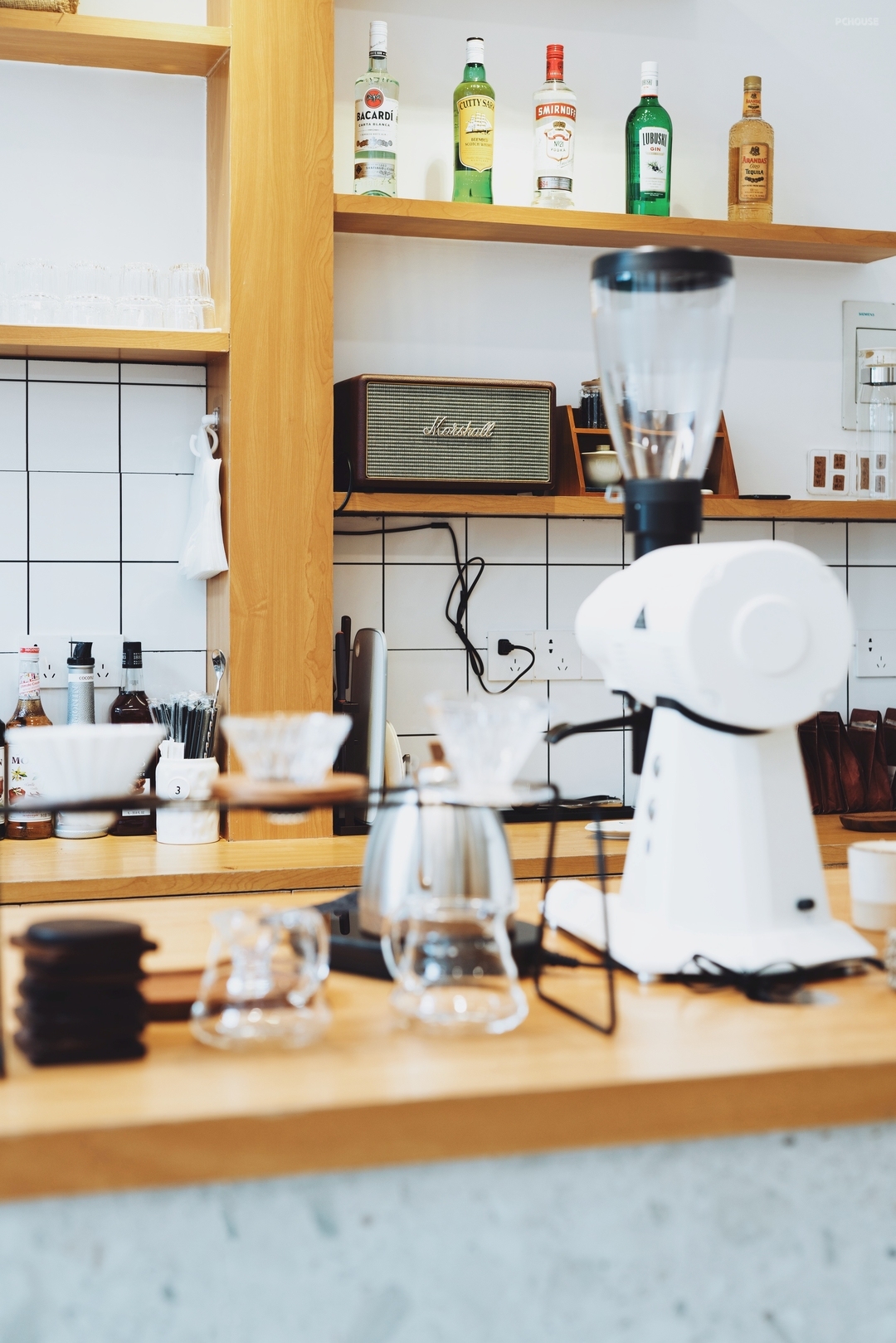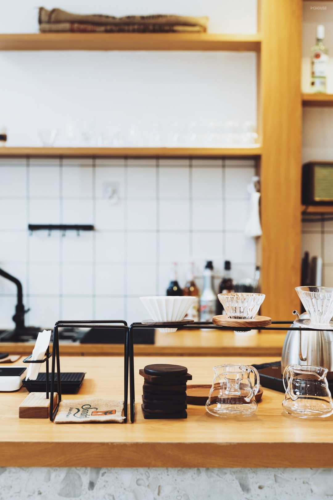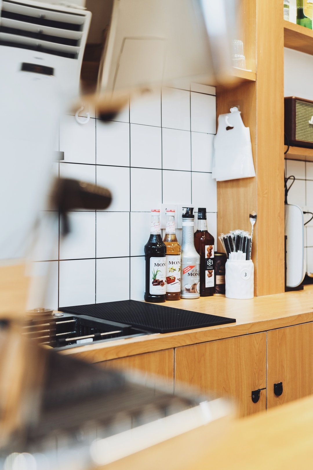吧台位于室内核心位置,面向入口,方便顾客点单并提升操作效率。操作台采用仿水磨石地砖作为地面铺设,与空间整体色调统一,并具有良好的耐磨与易清洁特性。