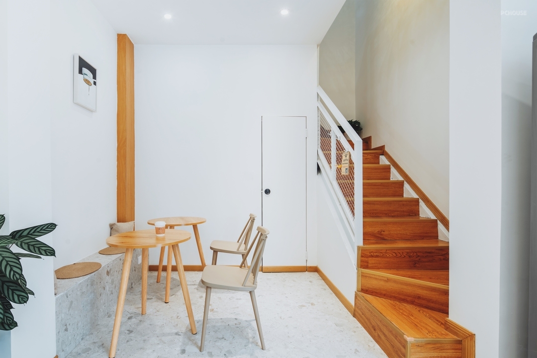 楼梯部分保留建筑原始结构,仅对栏杆进行了翻新处理,统一刷上白漆,保持视觉轻盈。梯步铺设木地板,与整体温润木质调性呼应。