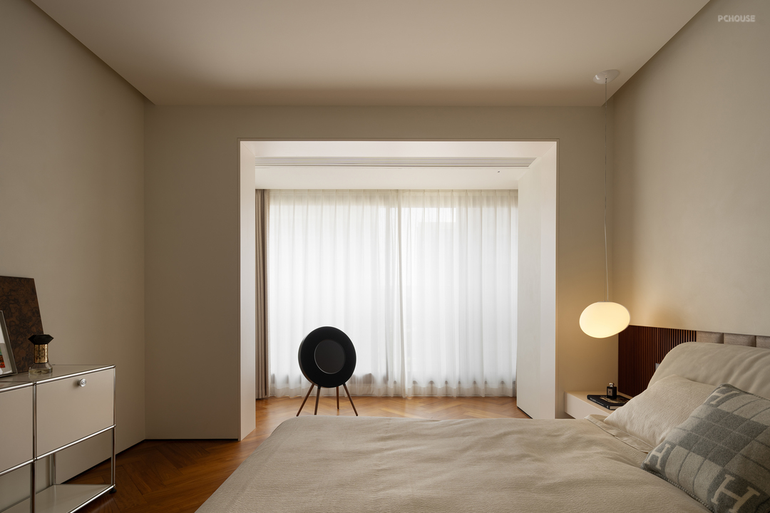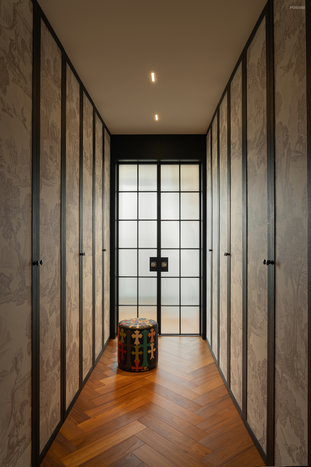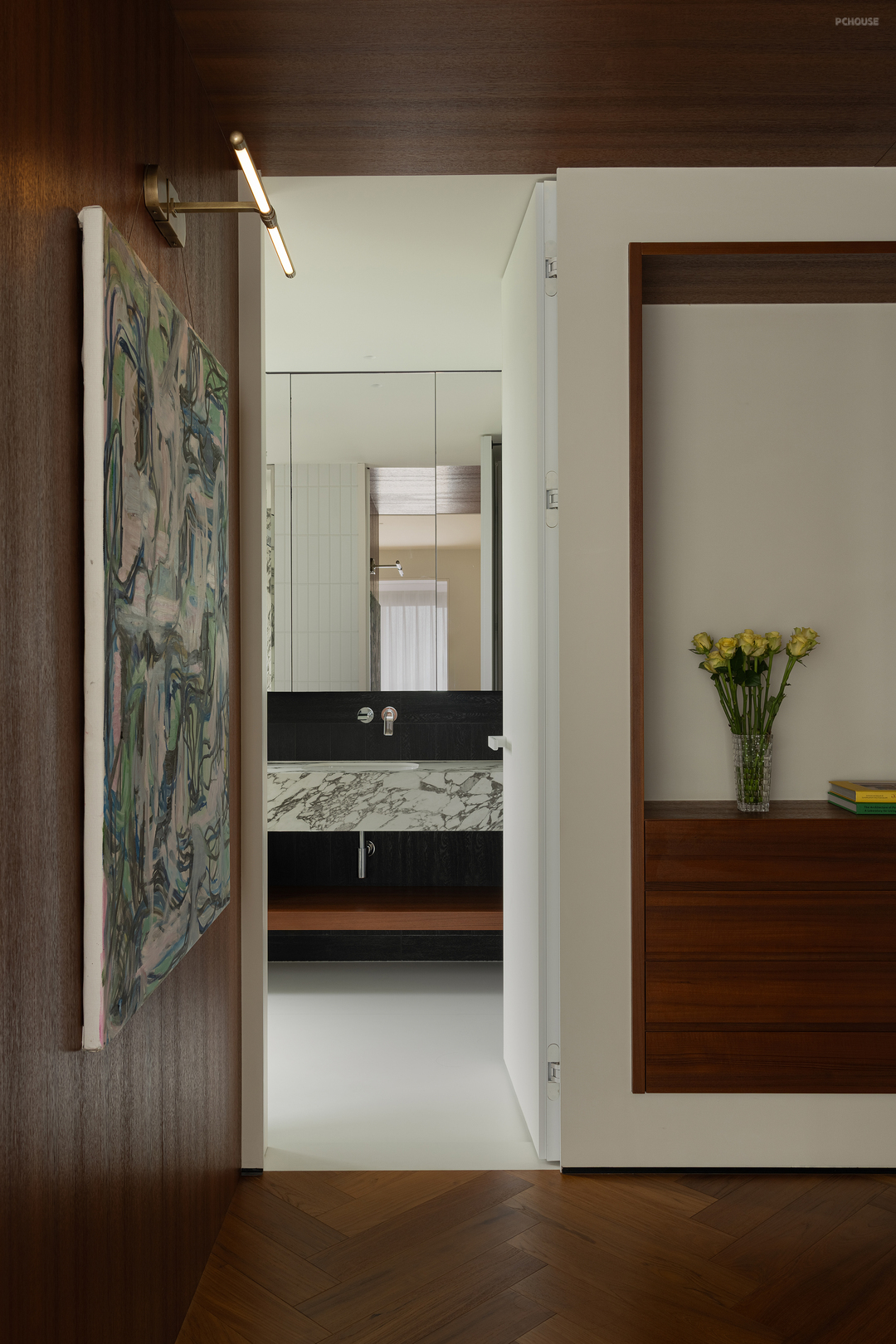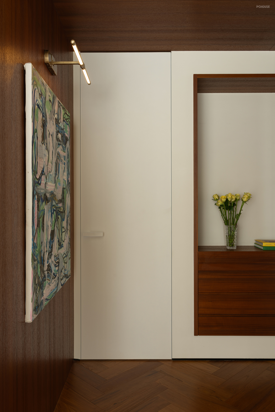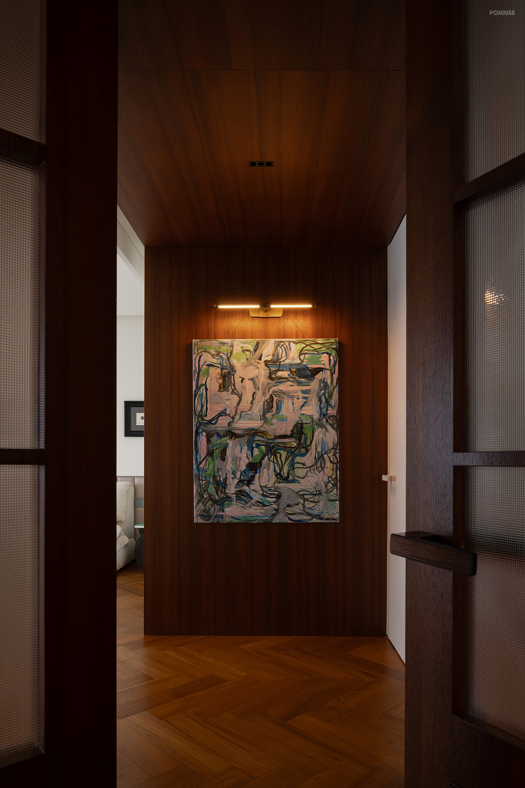 双开门主卧入口,木质元素延续中古,法式风格的艺术画作点缀,睡前的静谧、晨起的舒展,都在这融合风格里被温柔承接。
