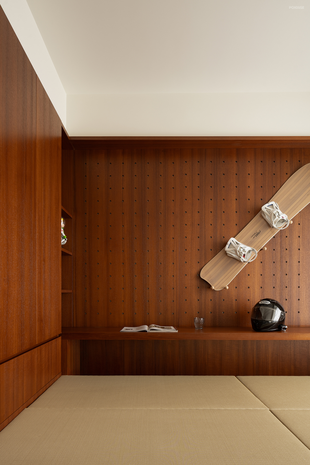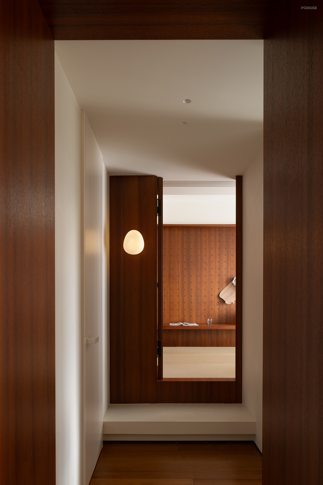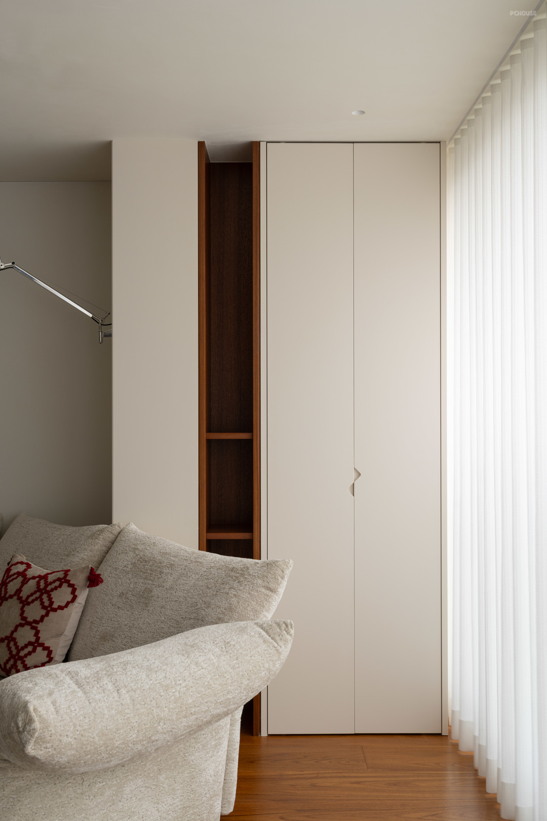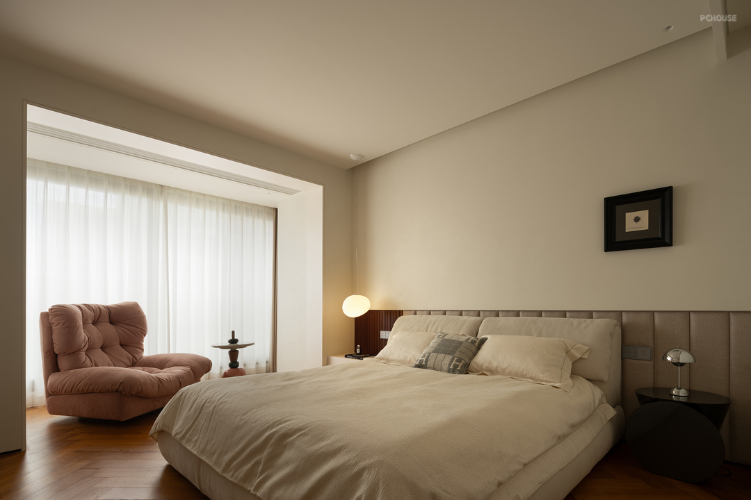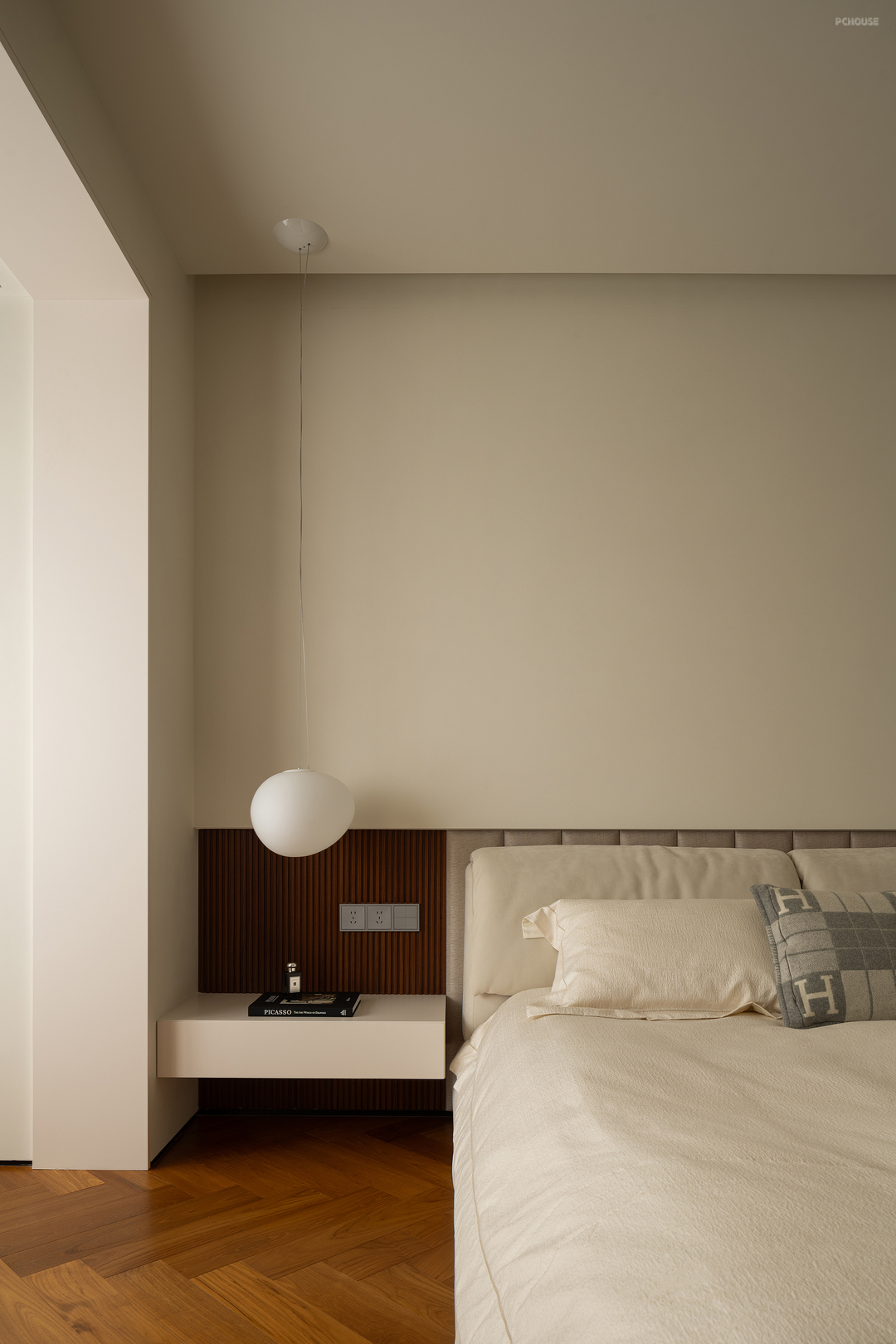 双开门主卧入口,木质元素延续中古,法式风格的艺术画作点缀,睡前的静谧、晨起的舒展,都在这融合风格里被温柔承接。