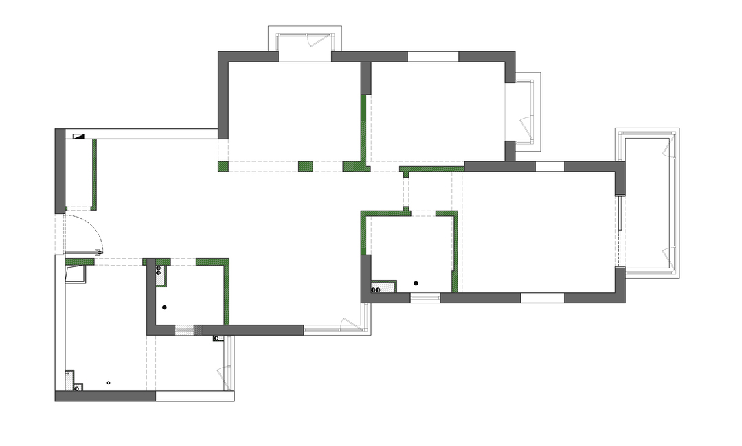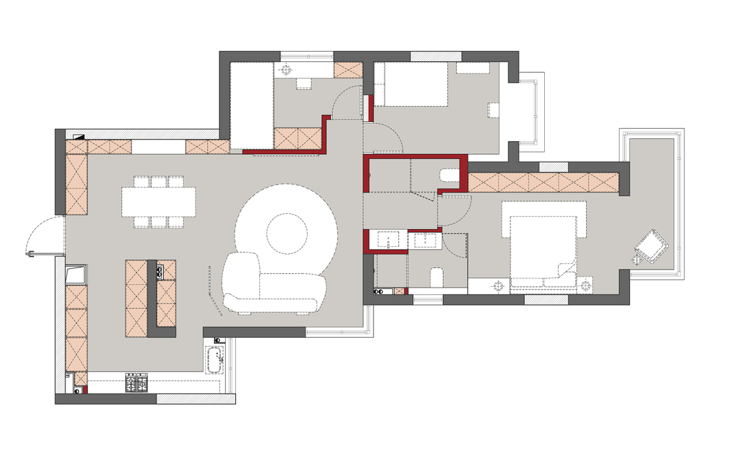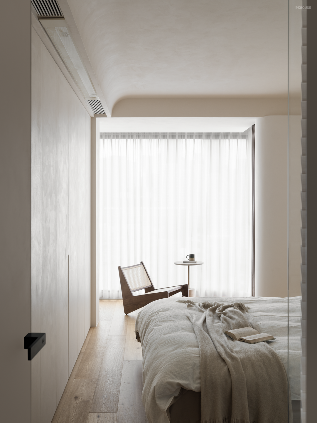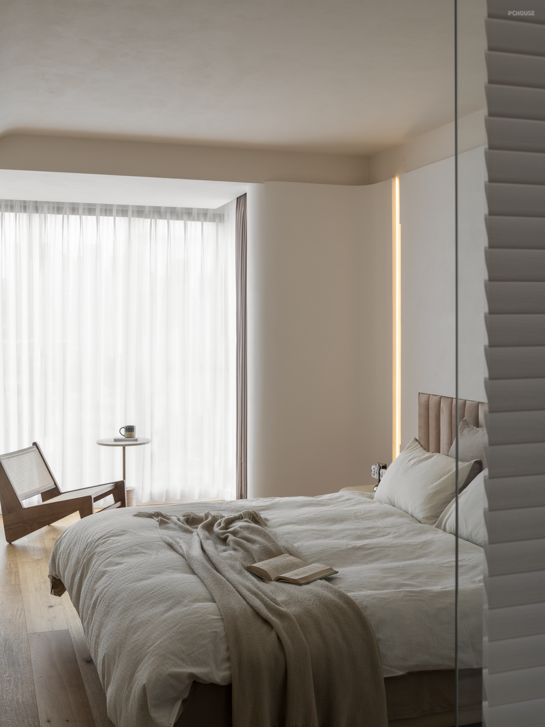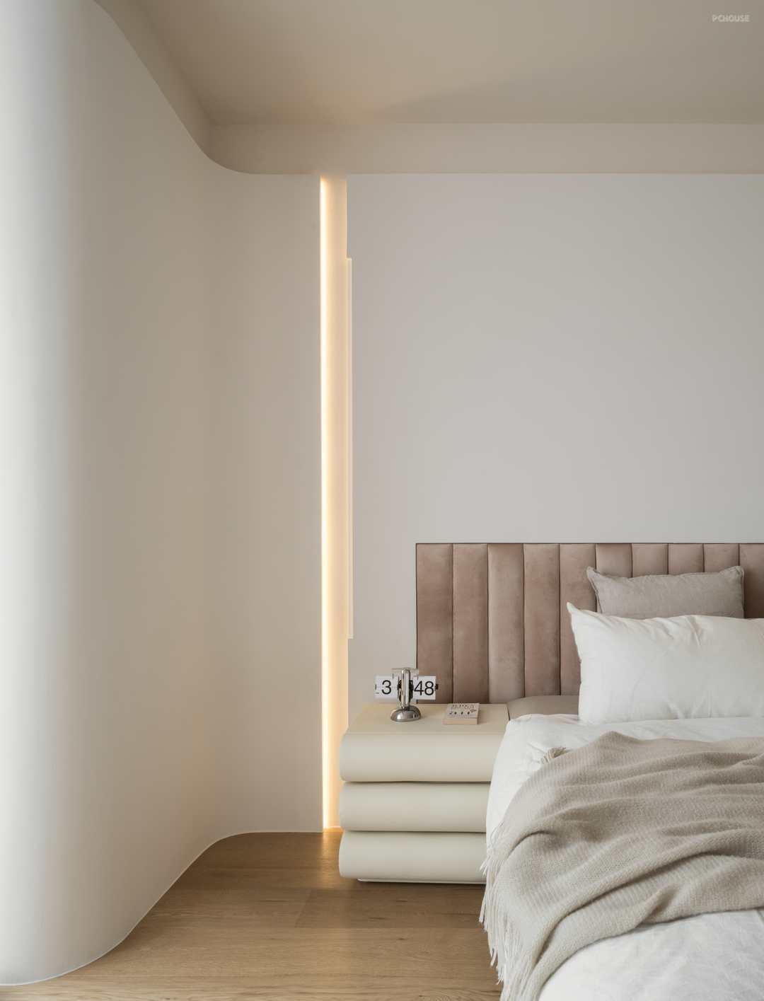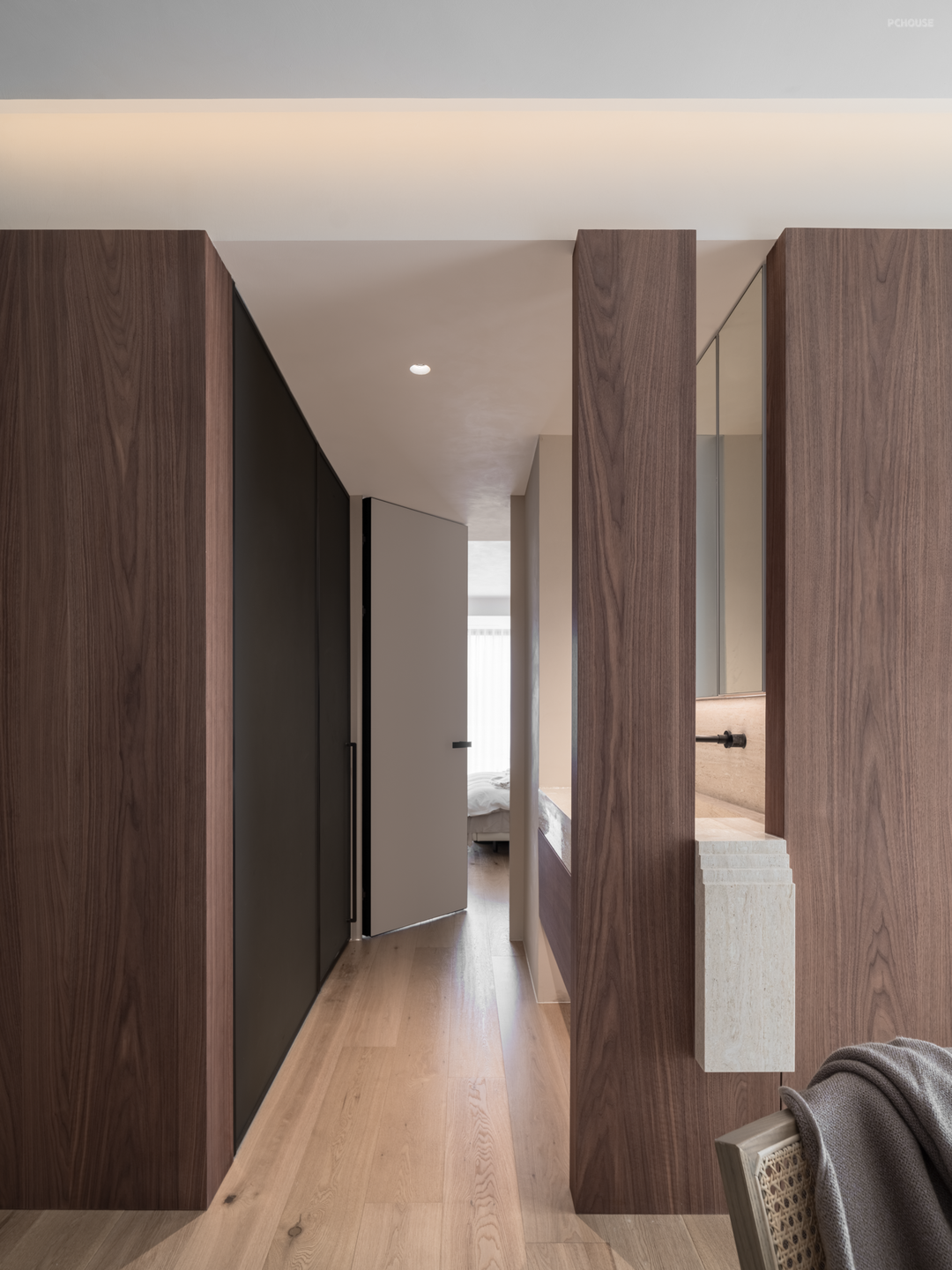 把主卫改了,再结合空间加一个客卫在卧室区域附近,客卫马桶区和淋浴间砌墙的时候确定尺寸,跟主卧床尾定做柜子之后的墙平齐,所以主卧衣柜就相当于是嵌入式柜子,看着更简洁一点。