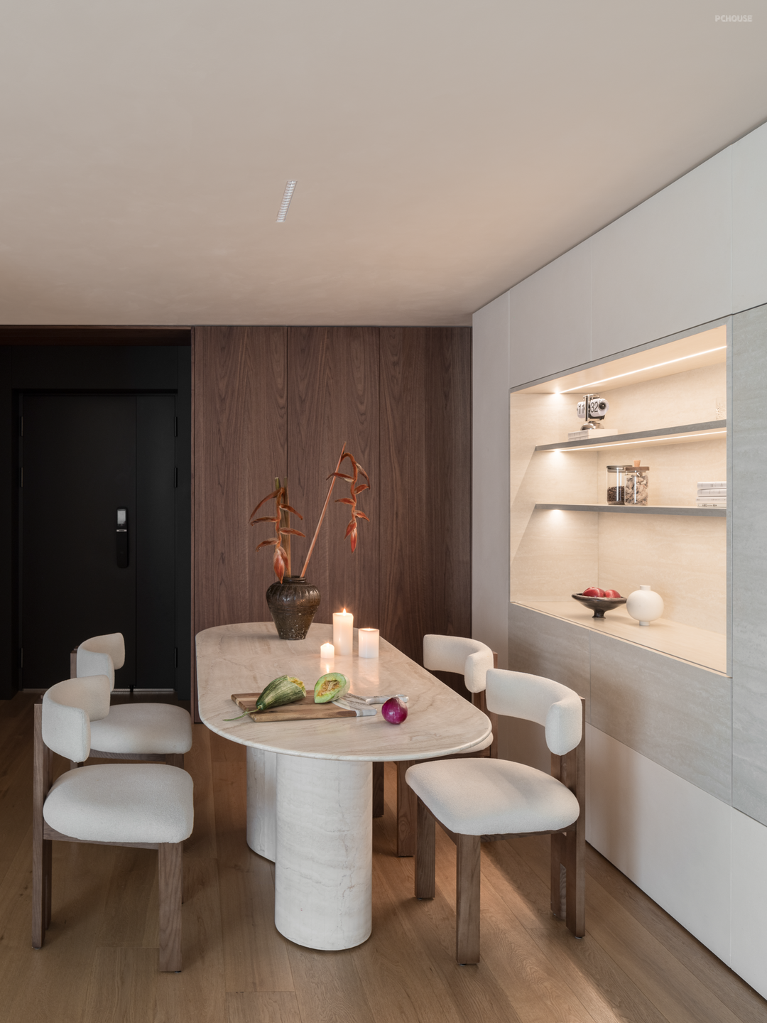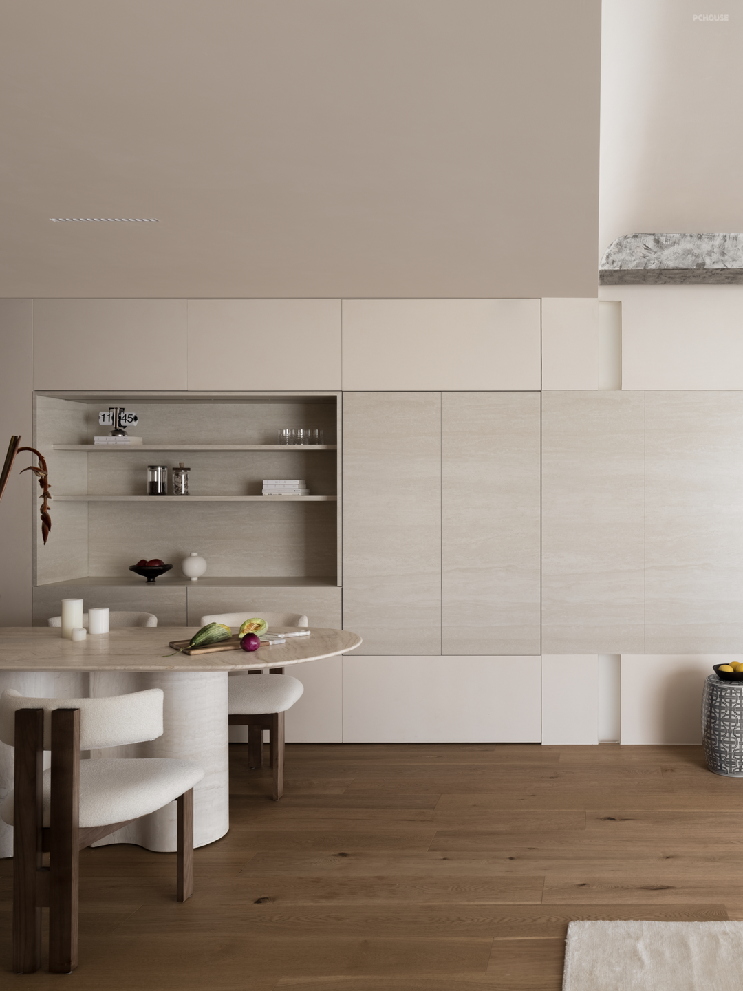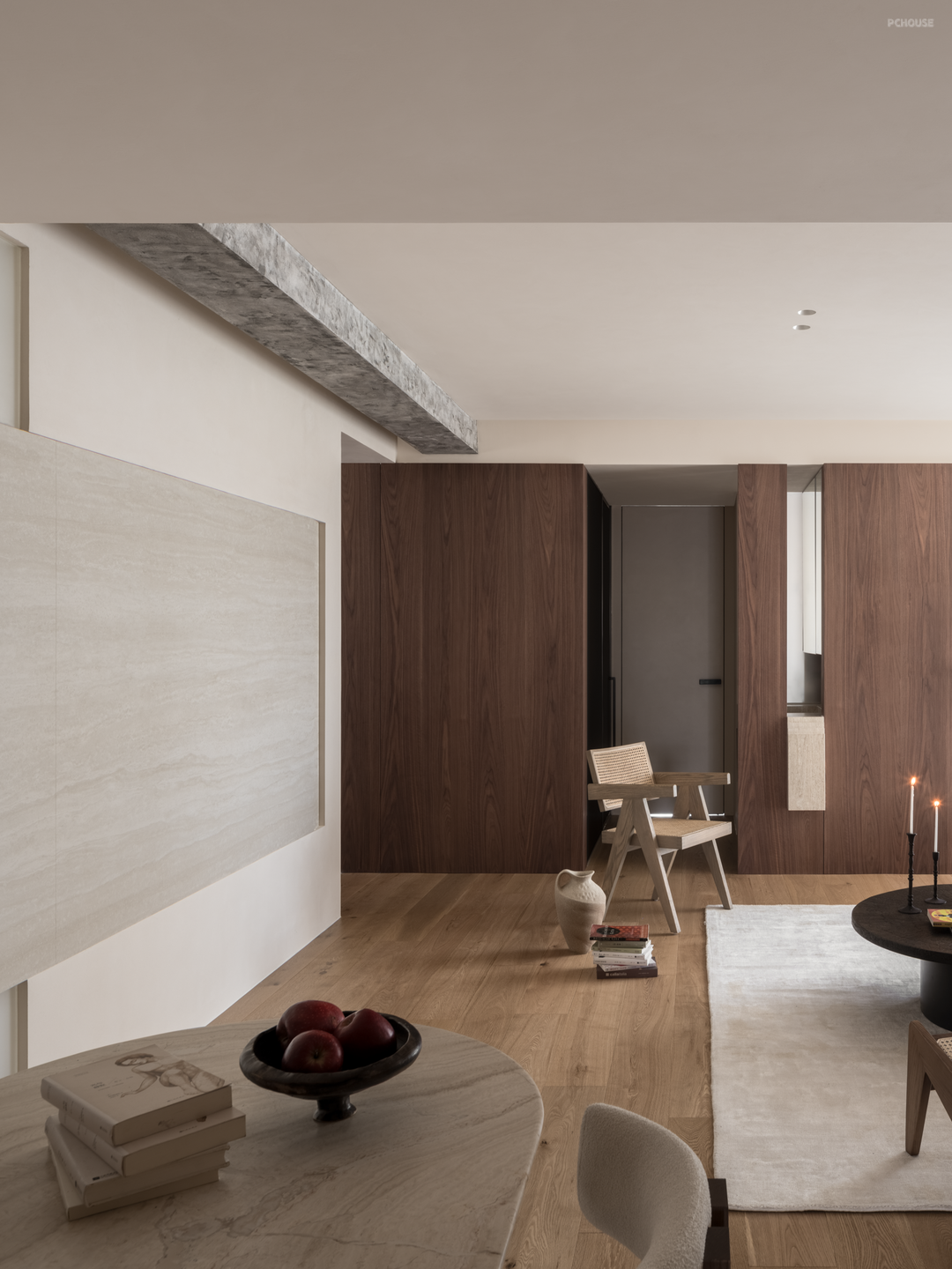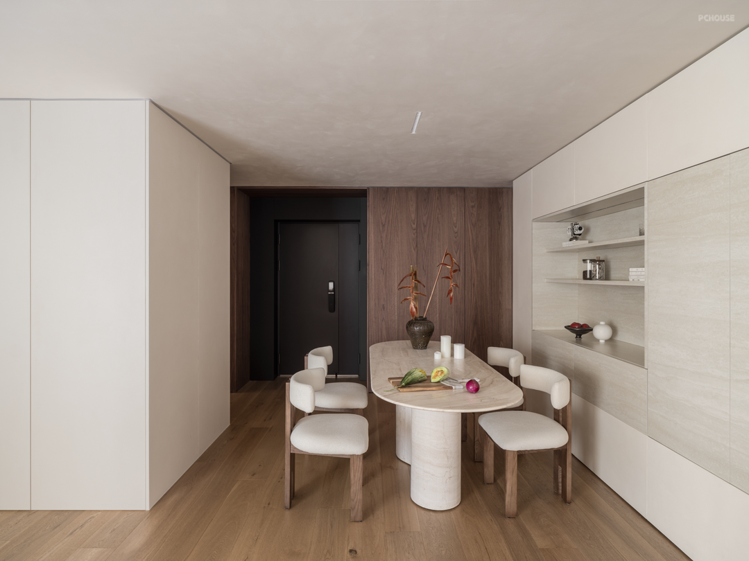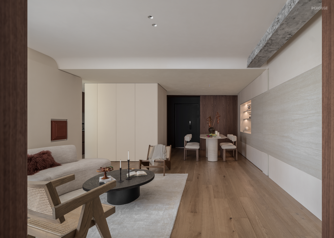 客厅面积也不算大,还要给背后小孩房间留空间,所以电视墙这一面就没有做柜子,墙面跟旁边餐厅做了柜子之后的平面齐平,一起用洞石材质做了装饰,看起来虽然还是以温柔奶白色为底,但是会更有质感一点。