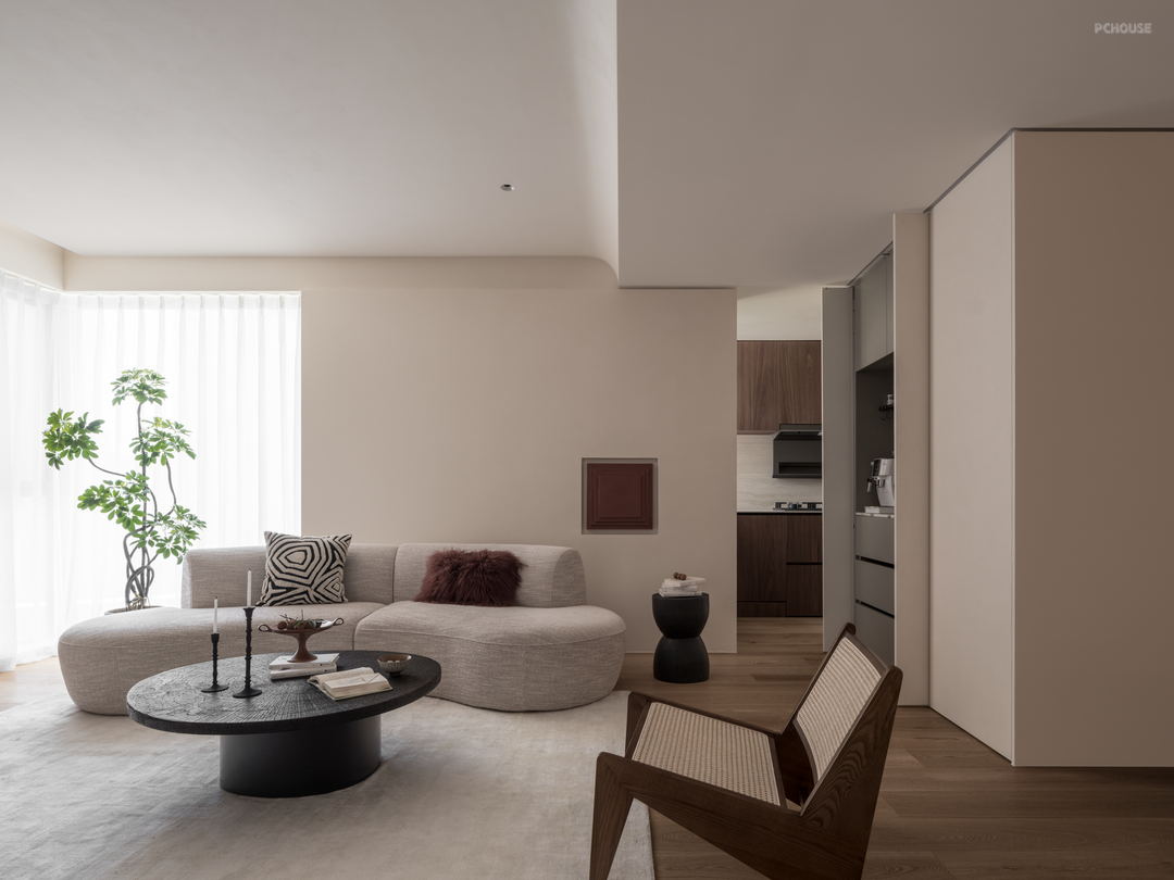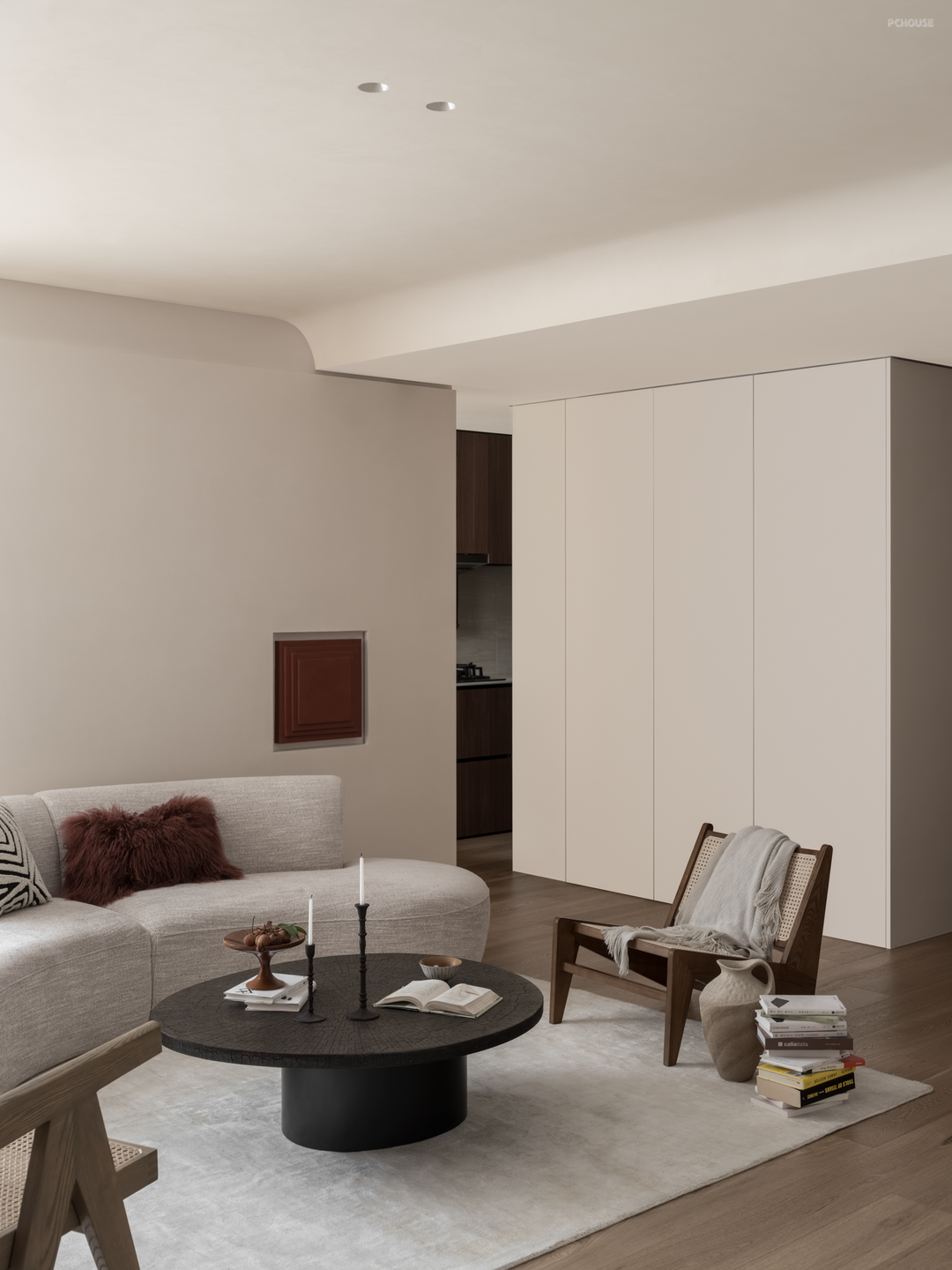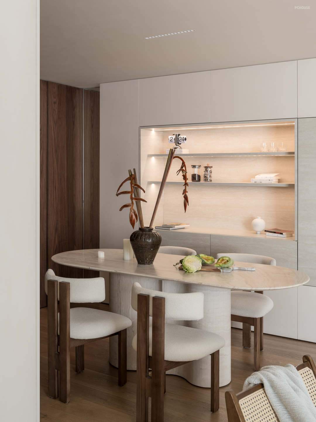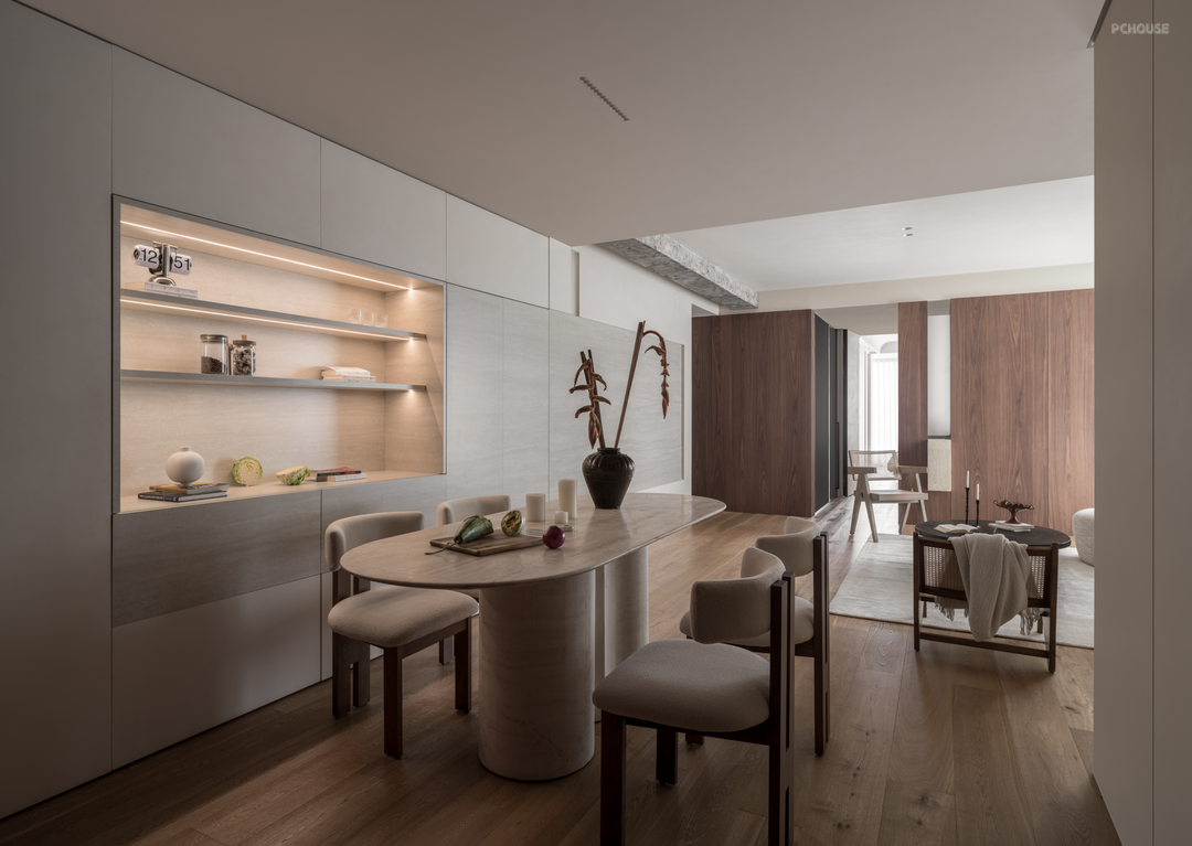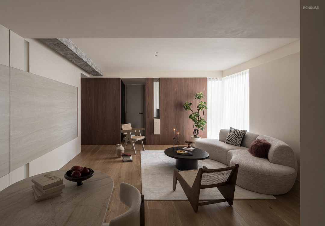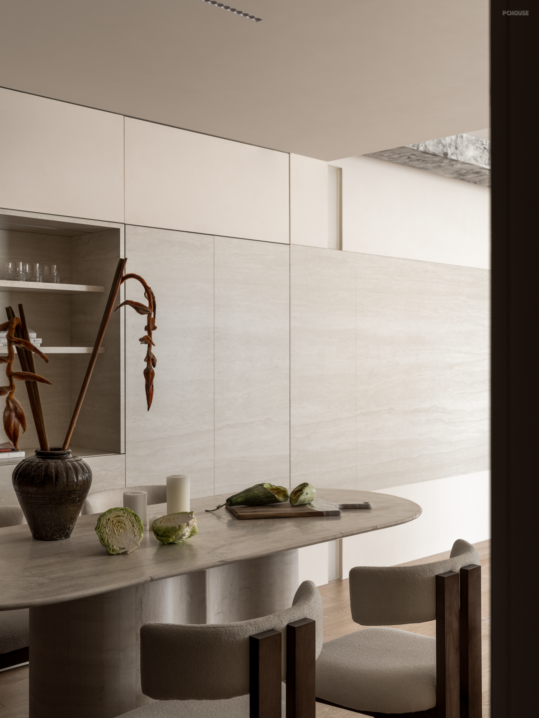 客厅面积也不算大,还要给背后小孩房间留空间,所以电视墙这一面就没有做柜子,墙面跟旁边餐厅做了柜子之后的平面齐平,一起用洞石材质做了装饰,看起来虽然还是以温柔奶白色为底,但是会更有质感一点。